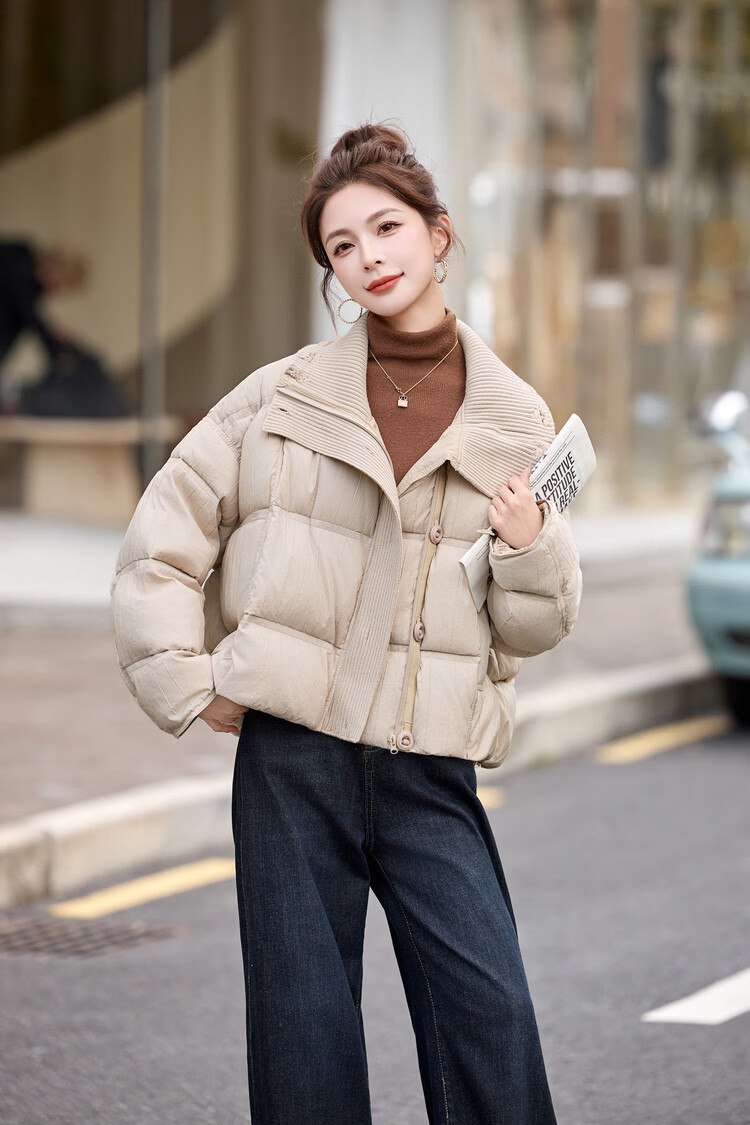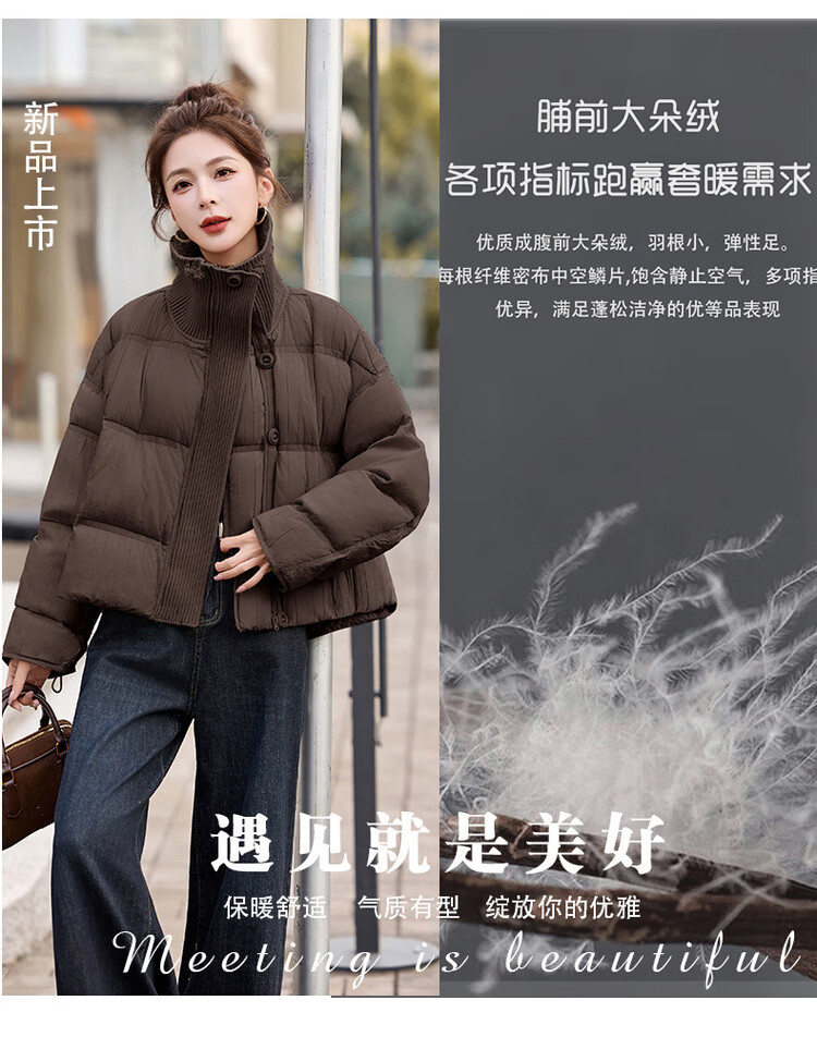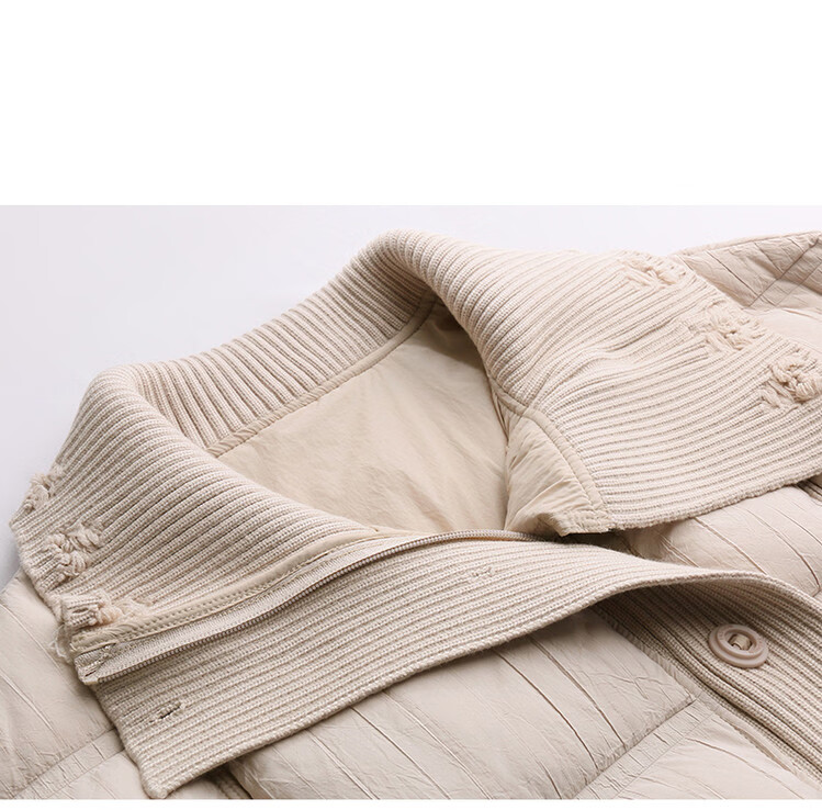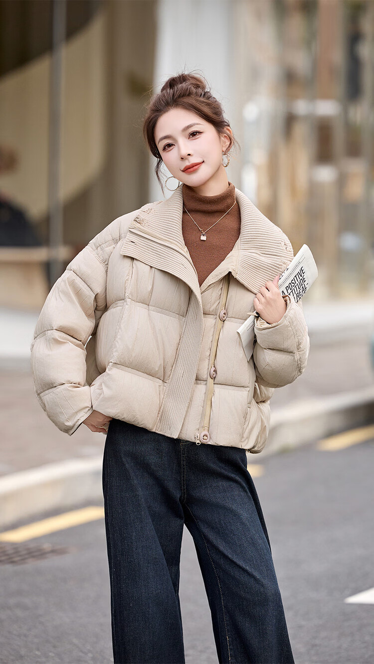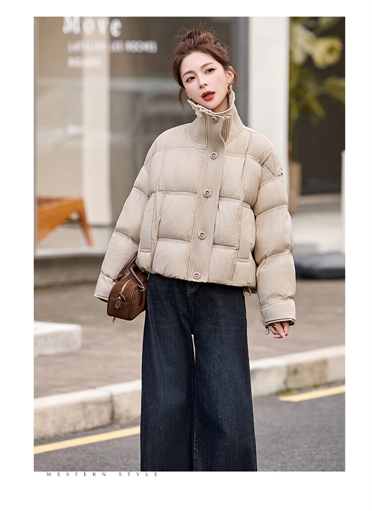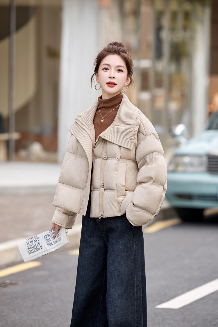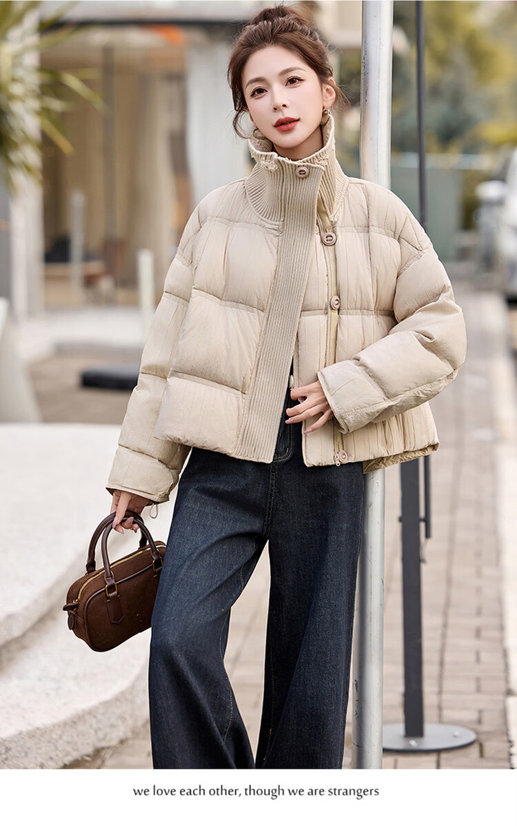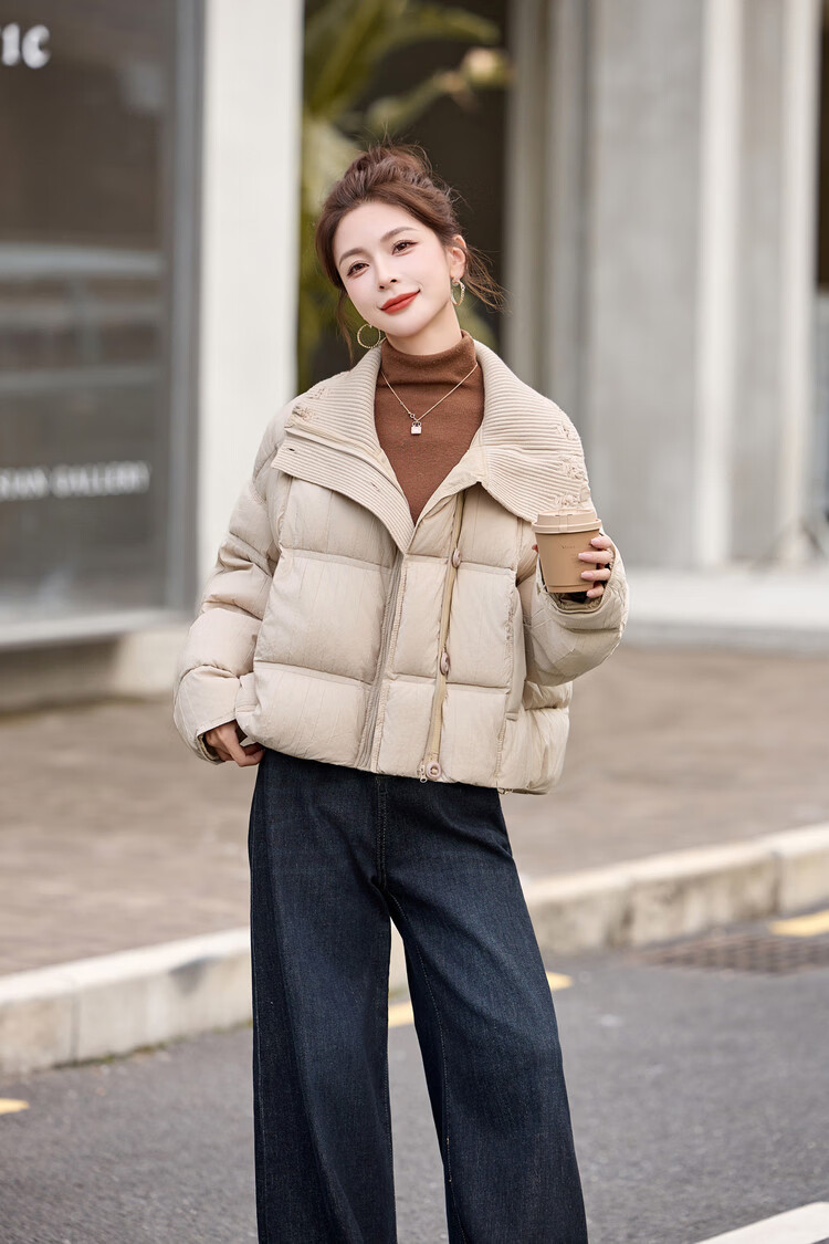 Hengyuanxiang knitted stitching large lapel short down jacket for women 2026 winter fashionable white duck down thickened warm jacket beige M