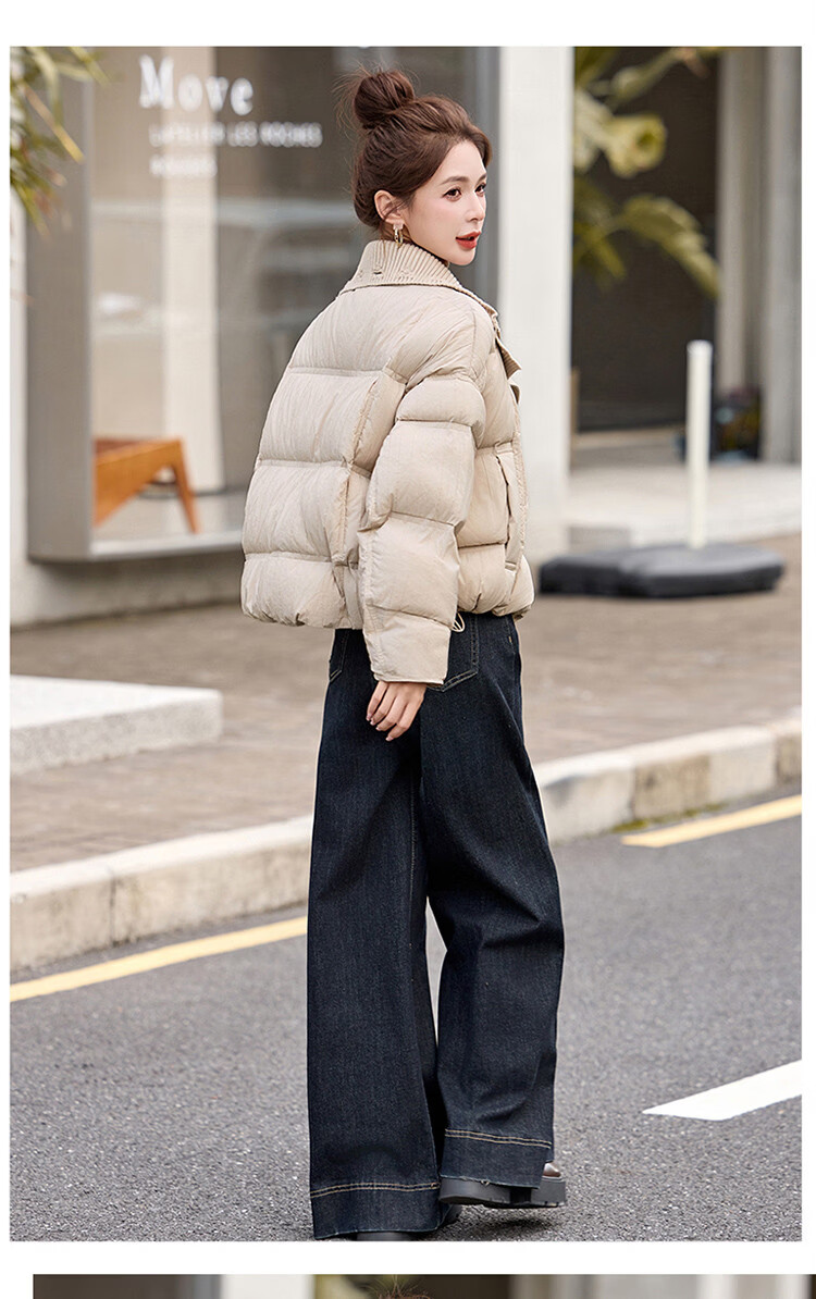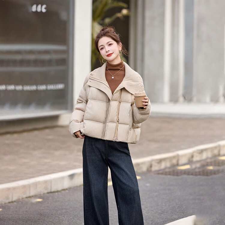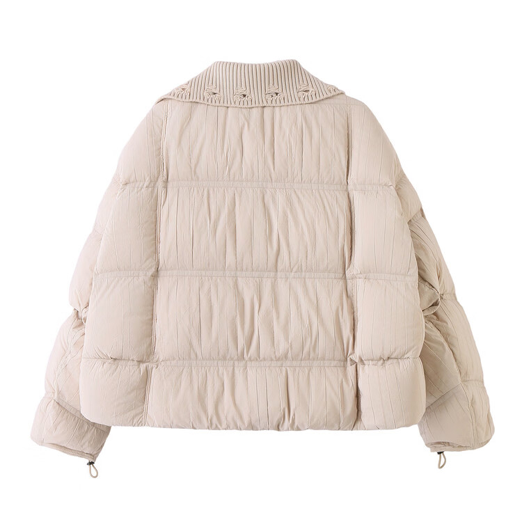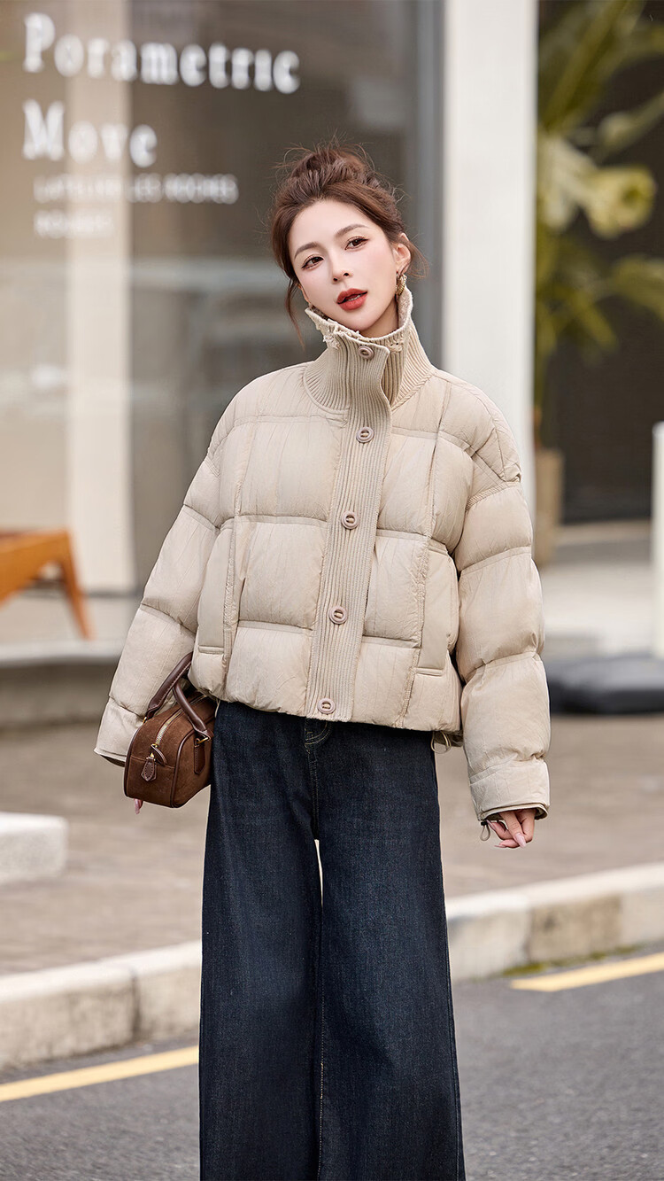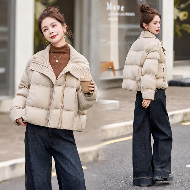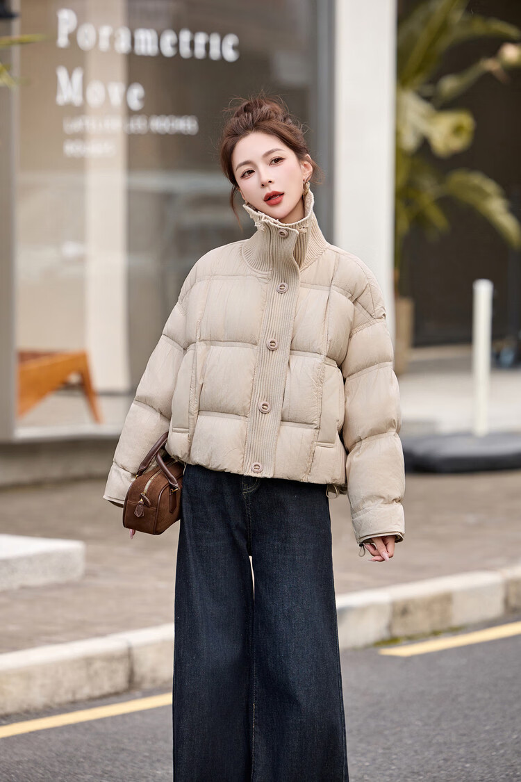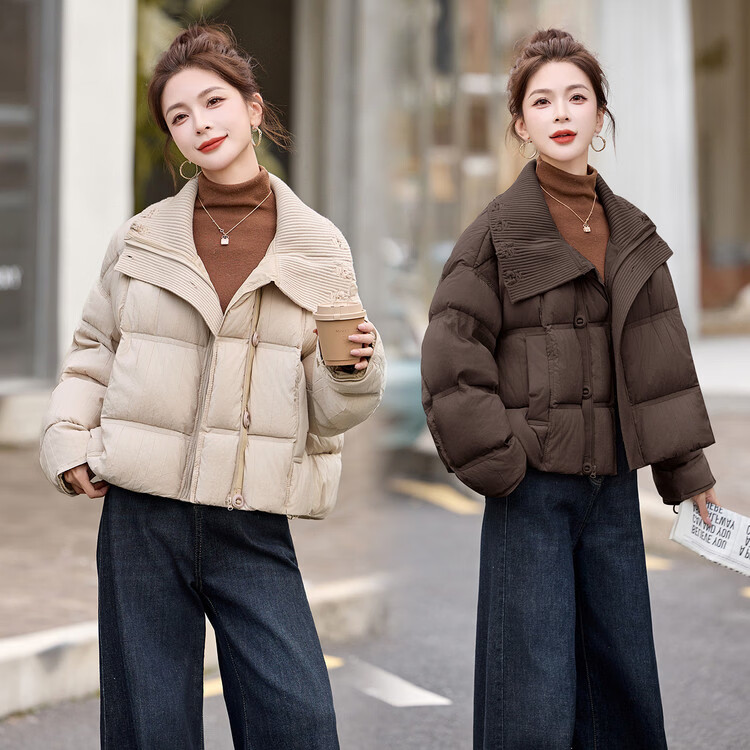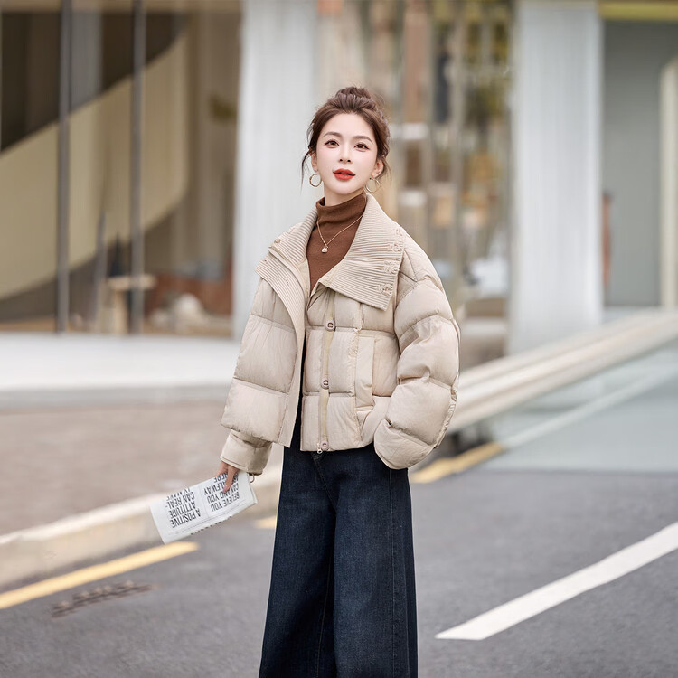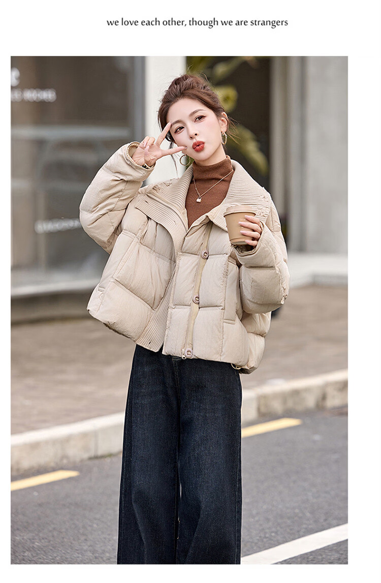Hengyuanxiang knitted stitching large lapel short down jacket for women 2026 winter fashionable white duck down thickened warm jacket beige M