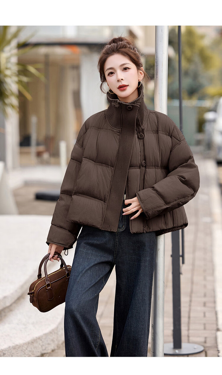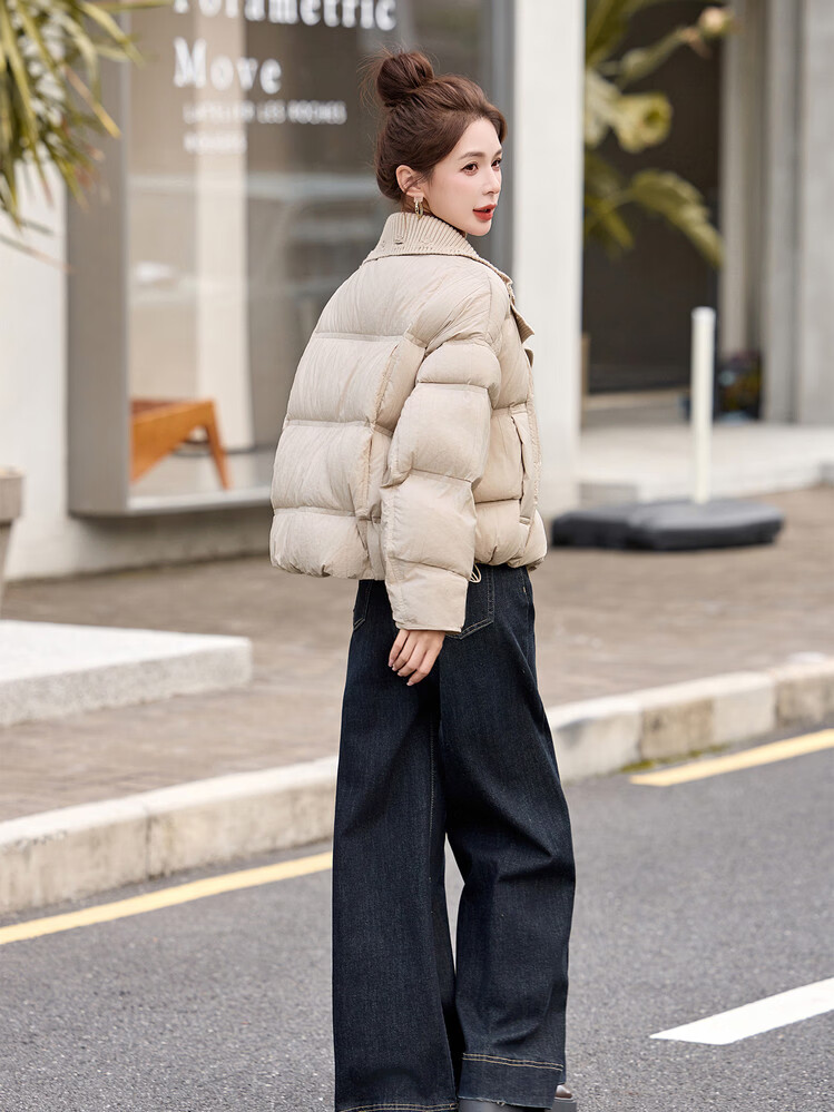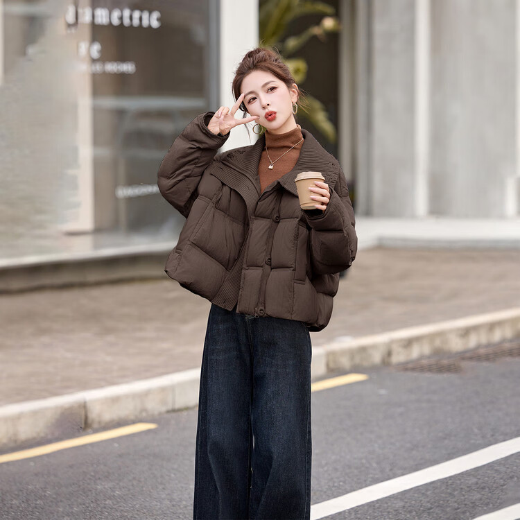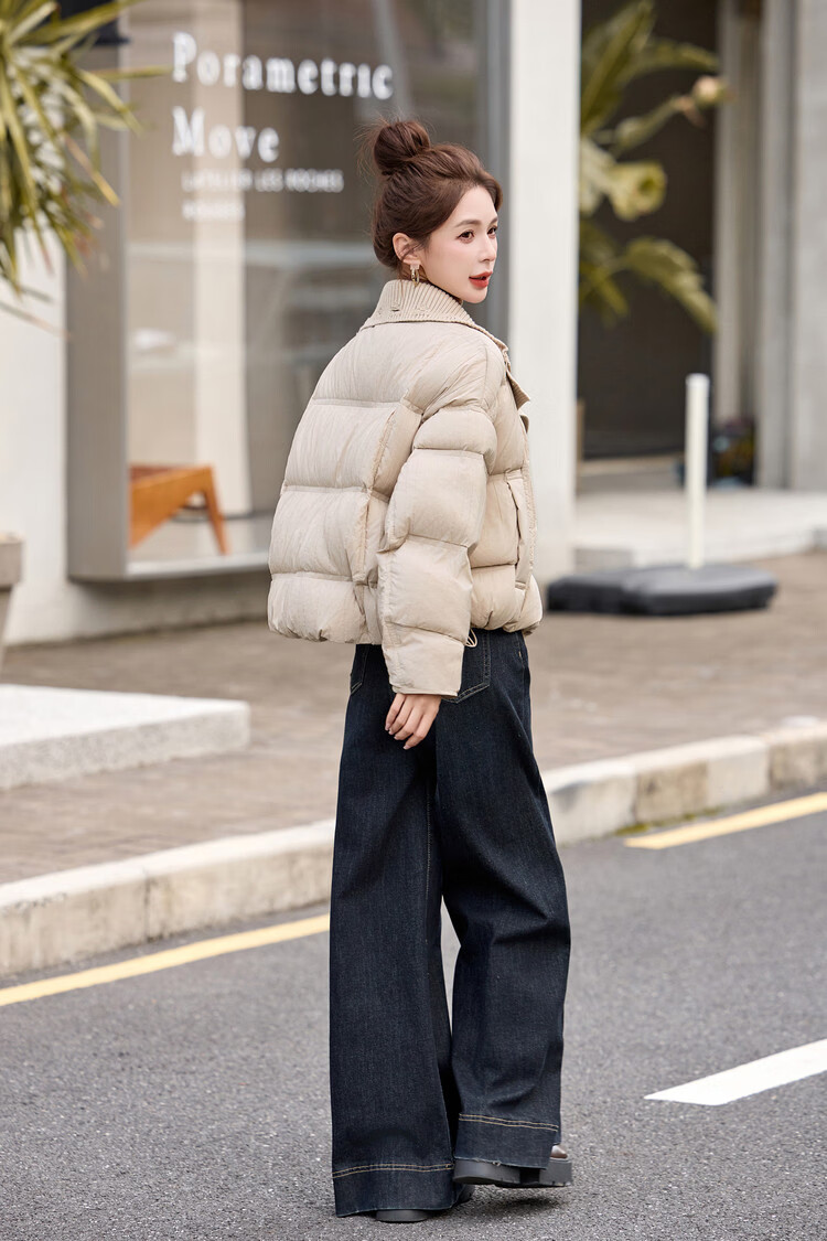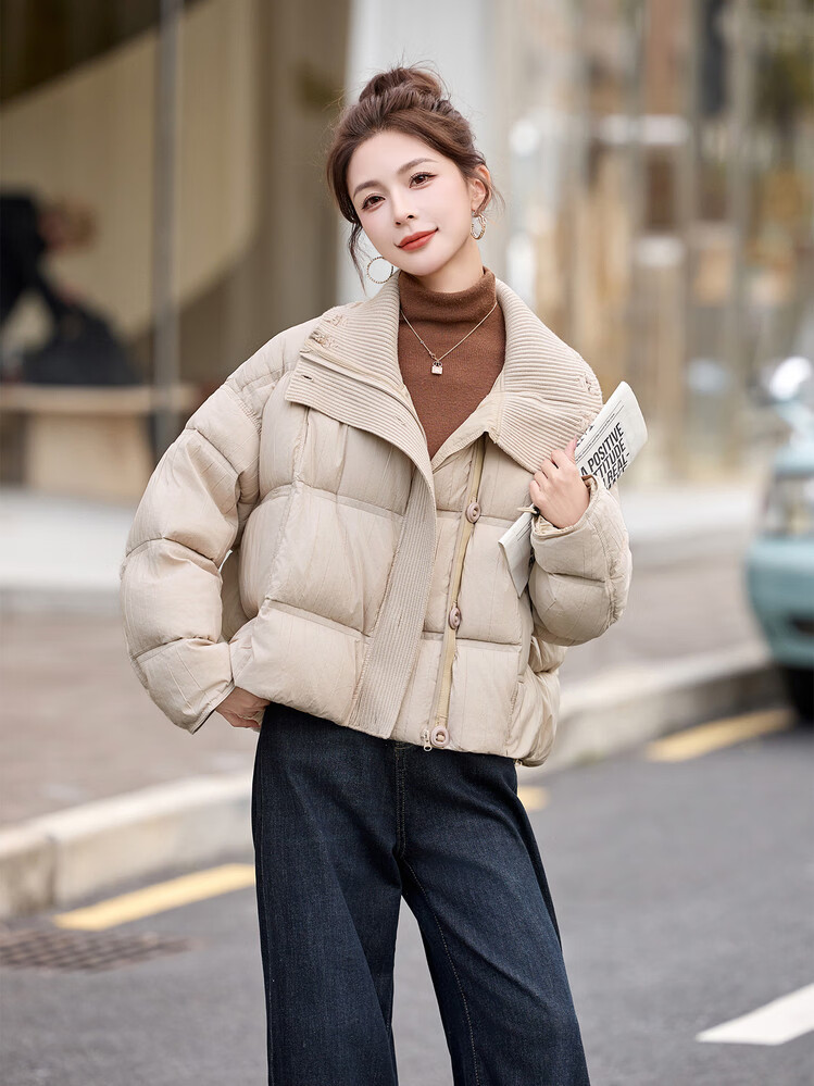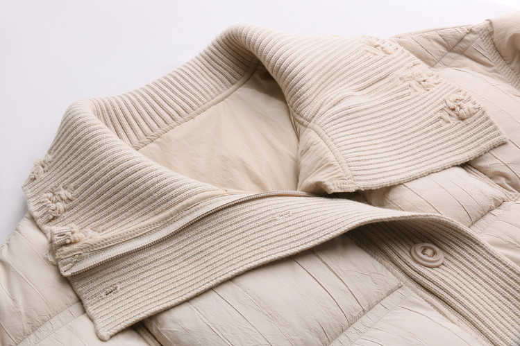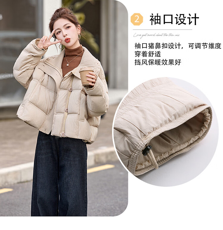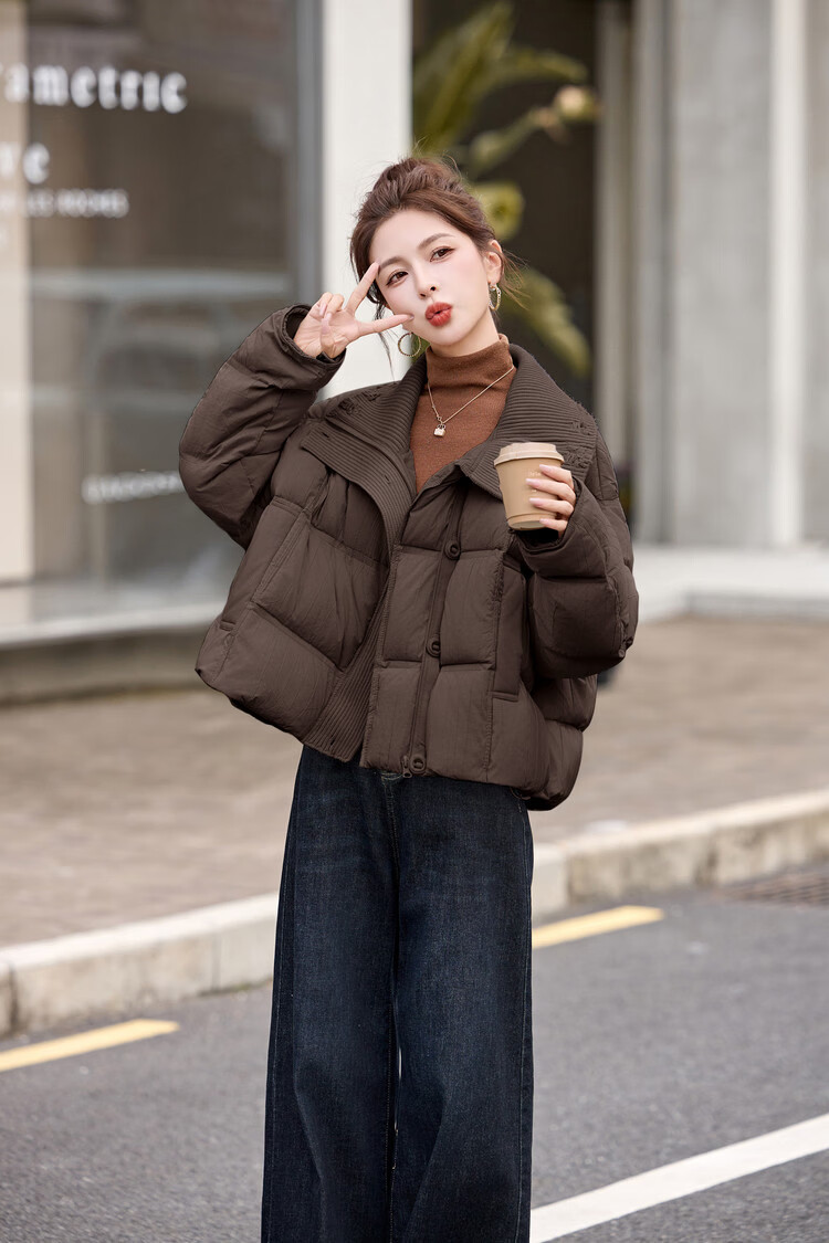 Hengyuanxiang knitted stitching large lapel short down jacket for women 2026 winter fashionable white duck down thickened warm jacket beige M