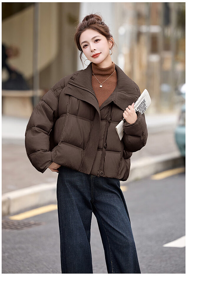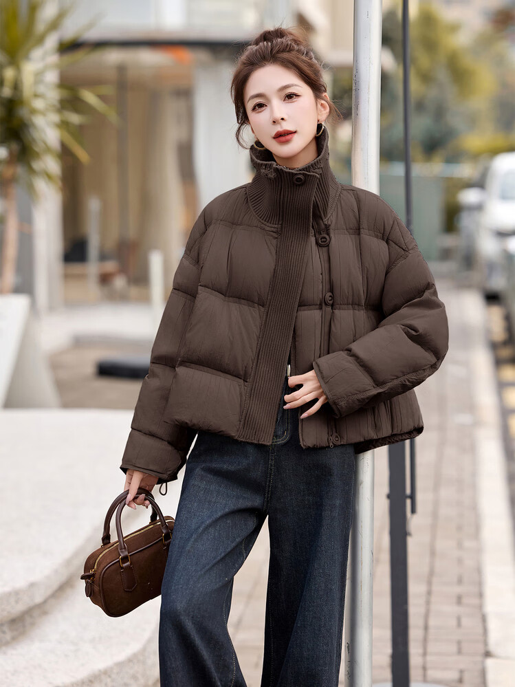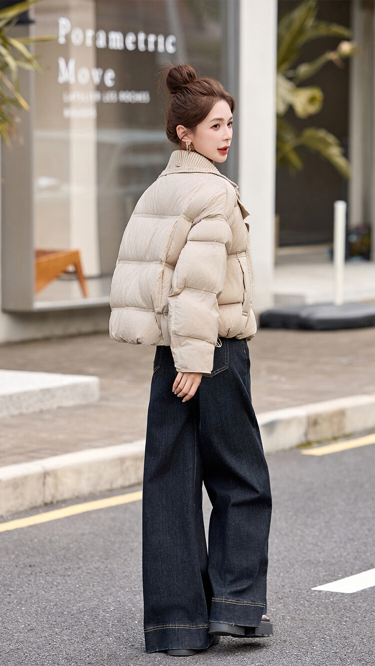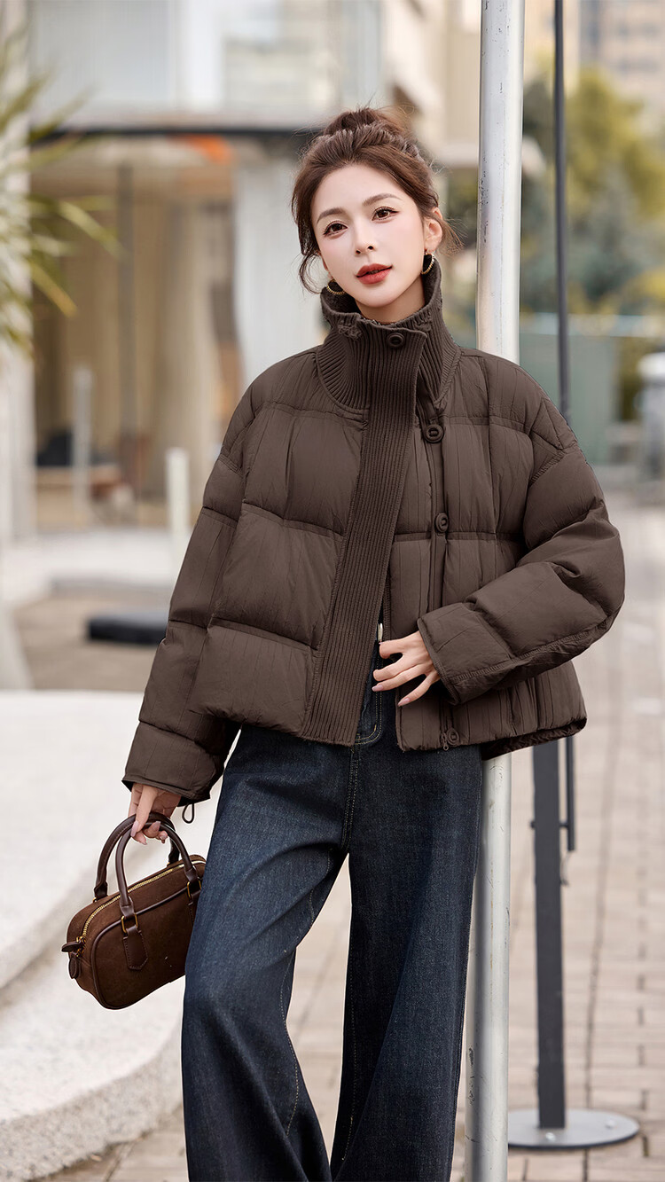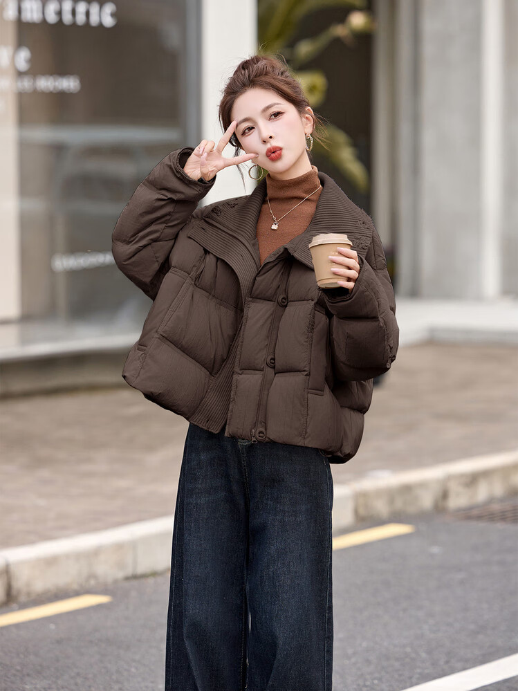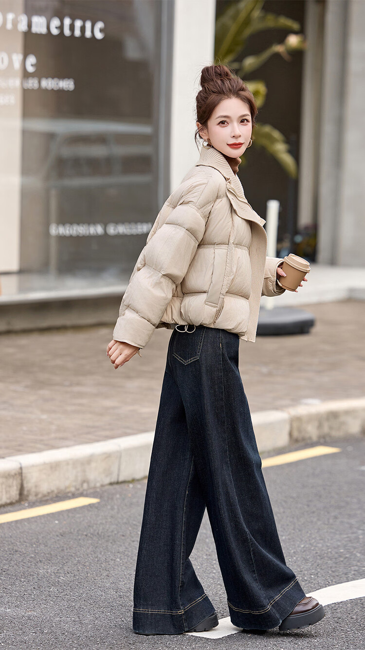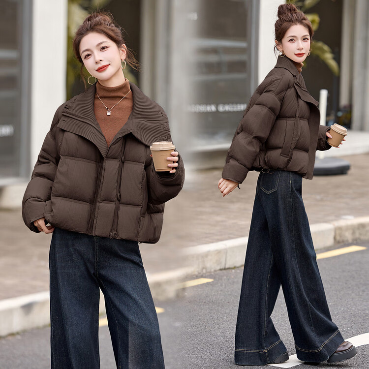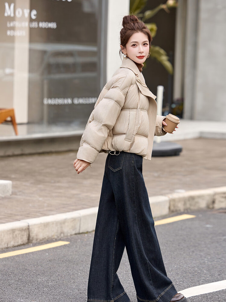 Hengyuanxiang knitted stitching large lapel short down jacket for women 2026 winter fashionable white duck down thickened warm jacket beige M