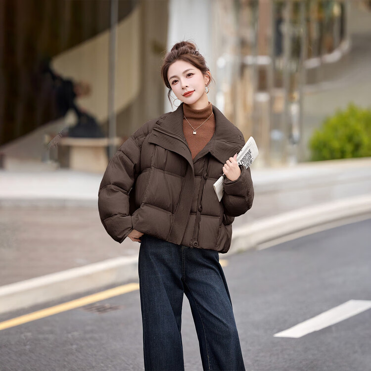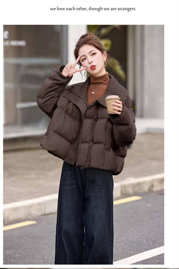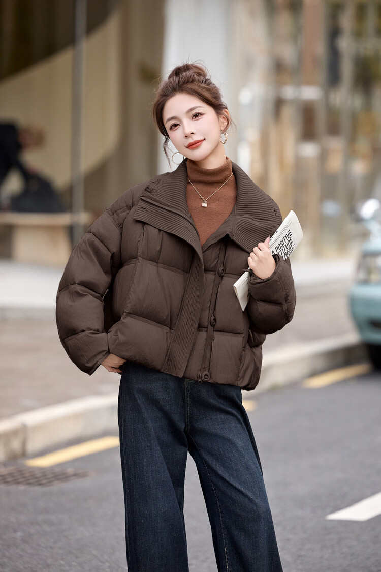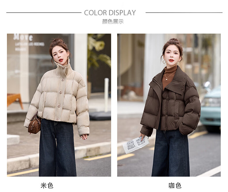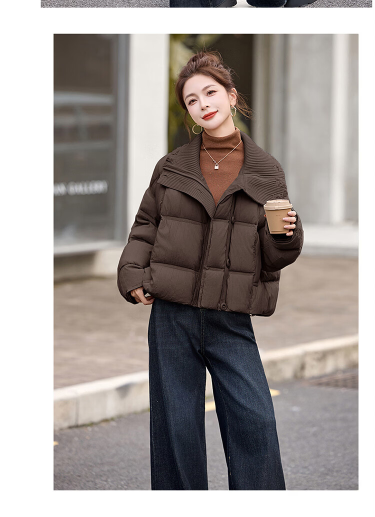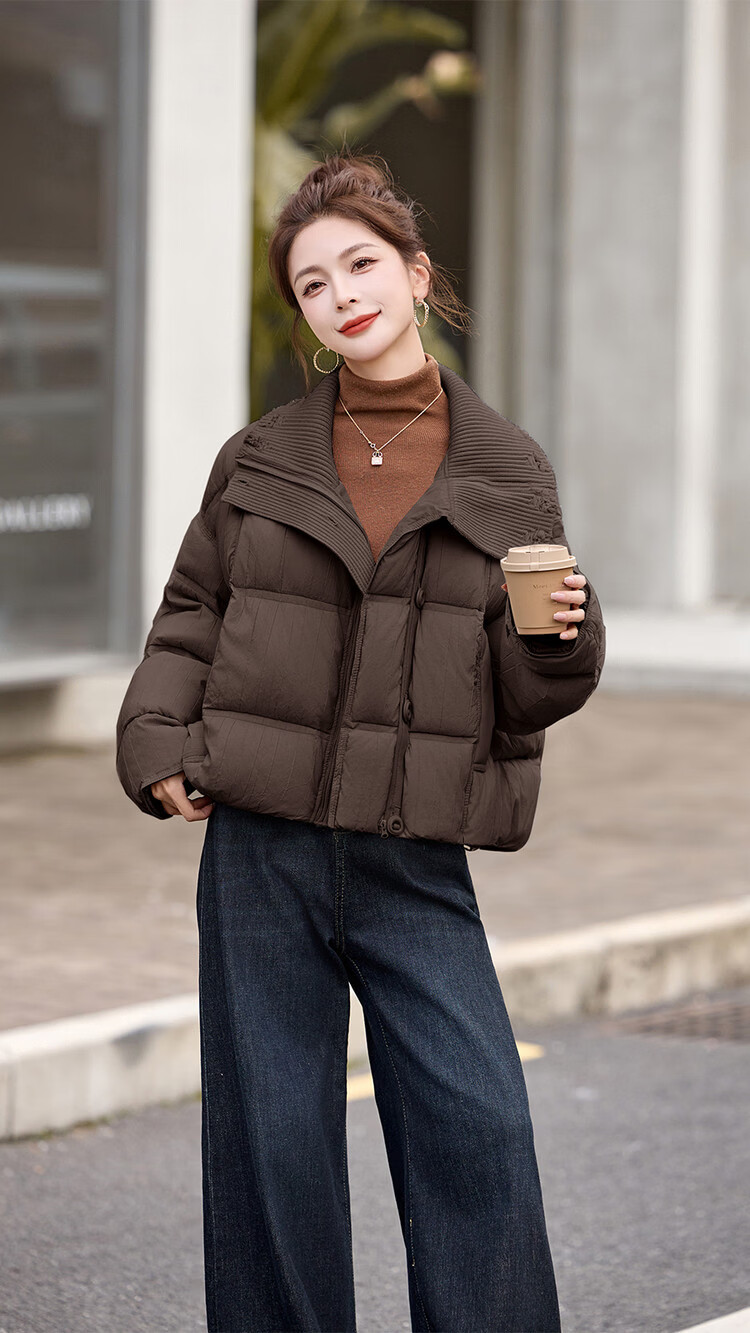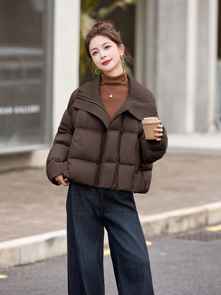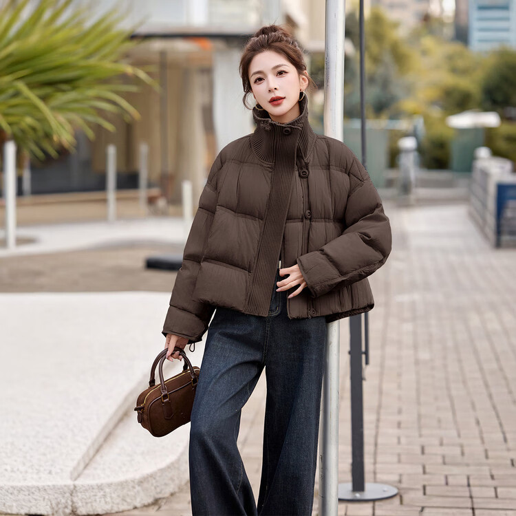 Hengyuanxiang knitted stitching large lapel short down jacket for women 2026 winter fashionable white duck down thickened warm jacket beige M