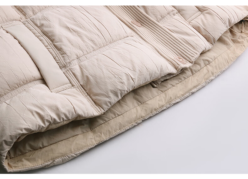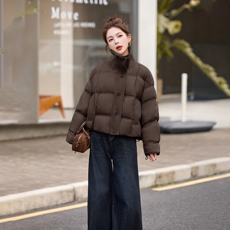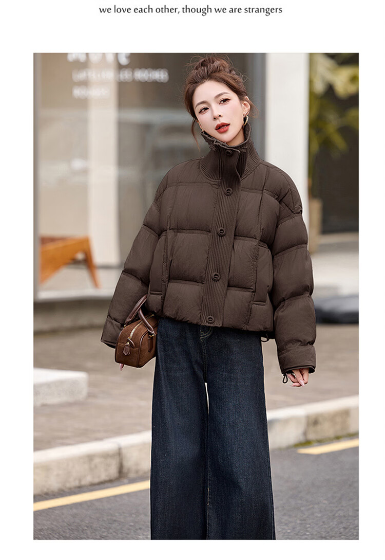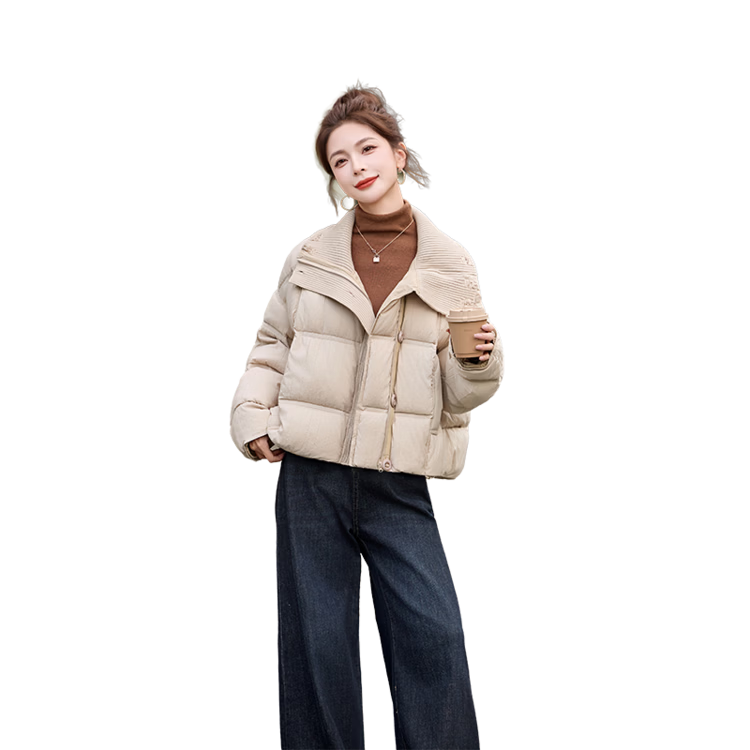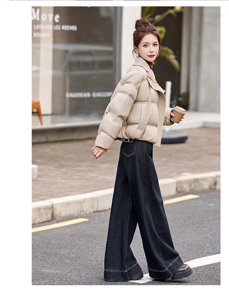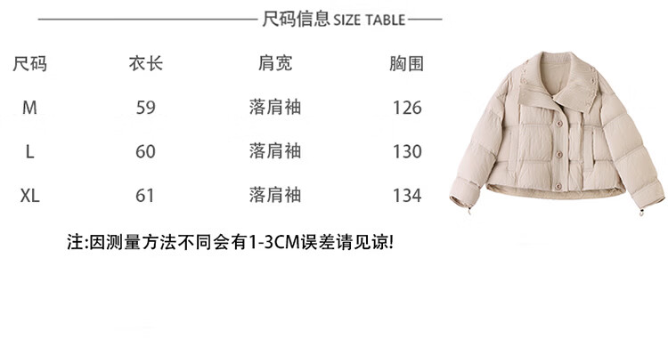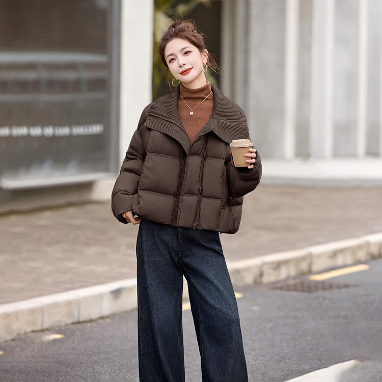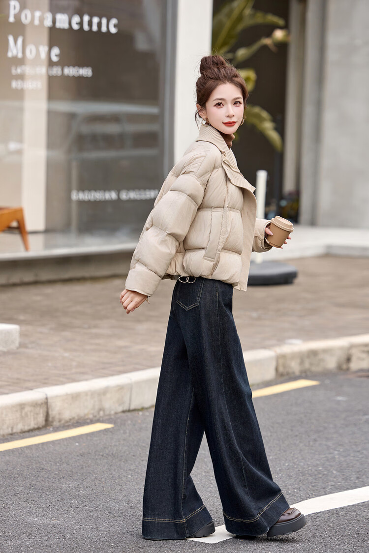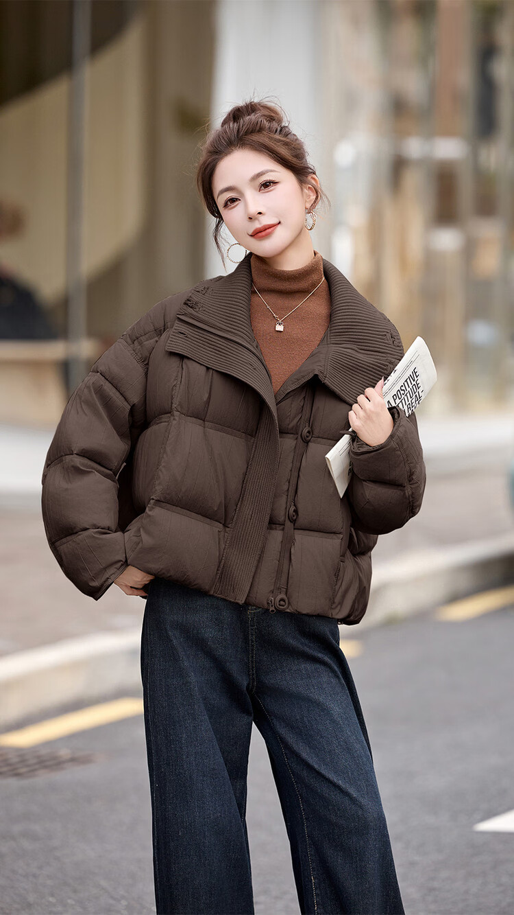 Hengyuanxiang knitted stitching large lapel short down jacket for women 2026 winter fashionable white duck down thickened warm jacket beige M