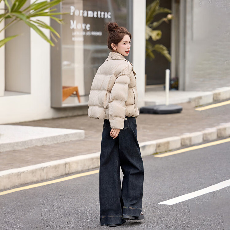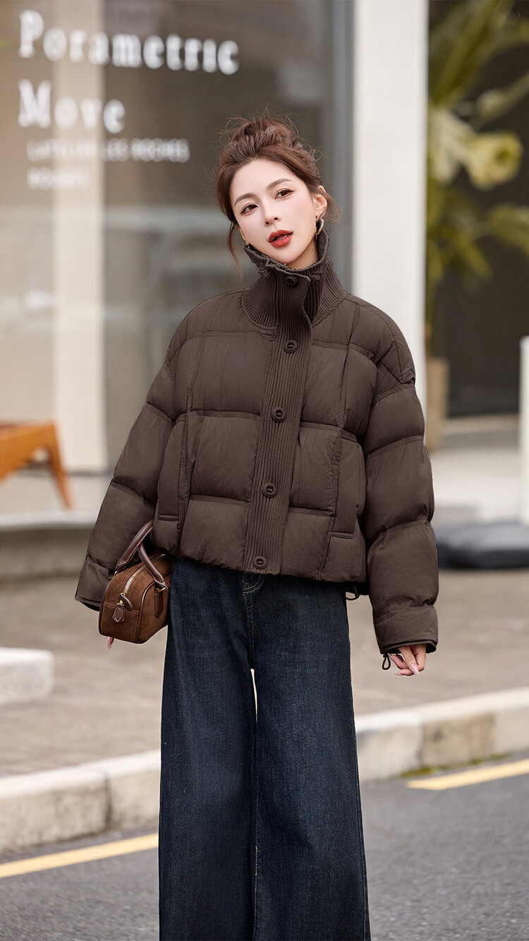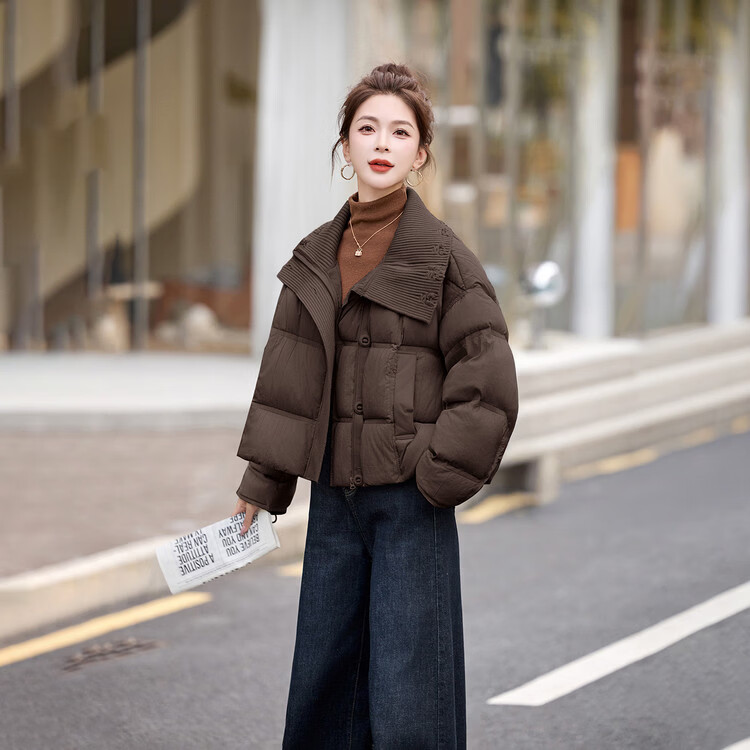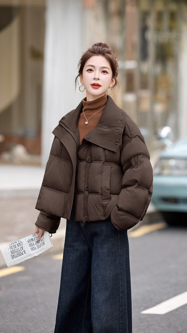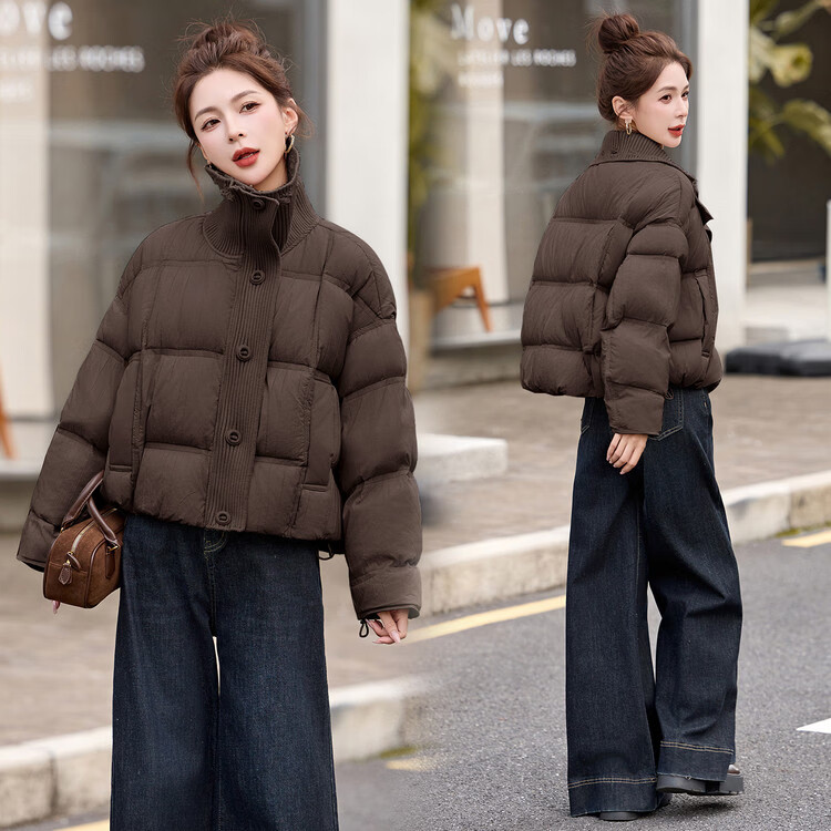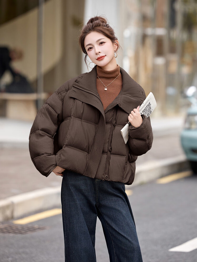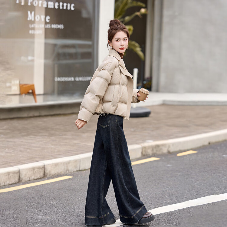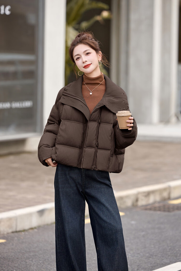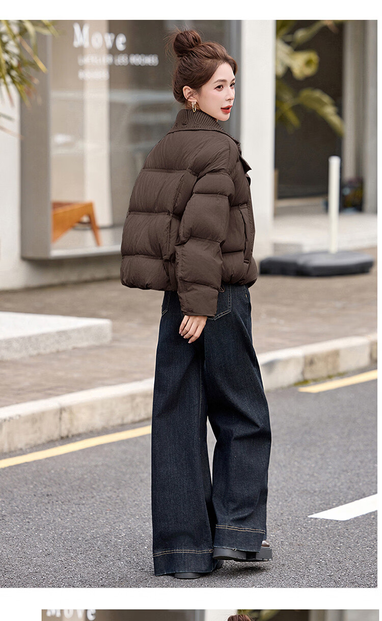 Hengyuanxiang knitted stitching large lapel short down jacket for women 2026 winter fashionable white duck down thickened warm jacket beige M
