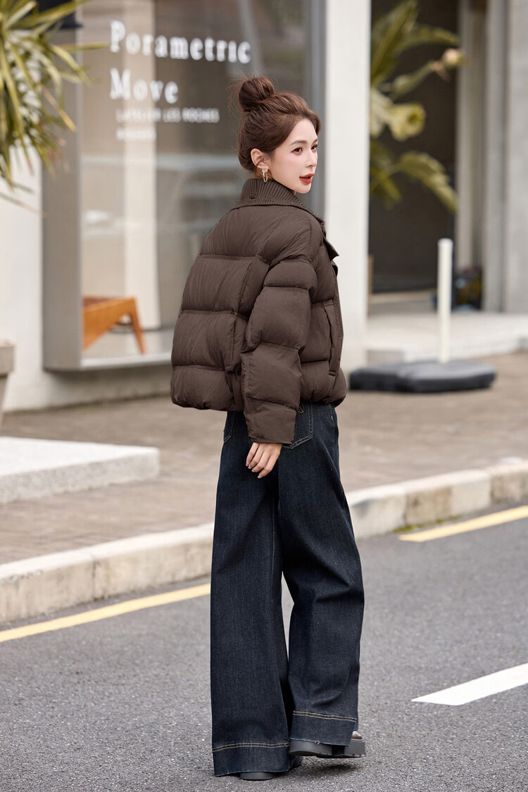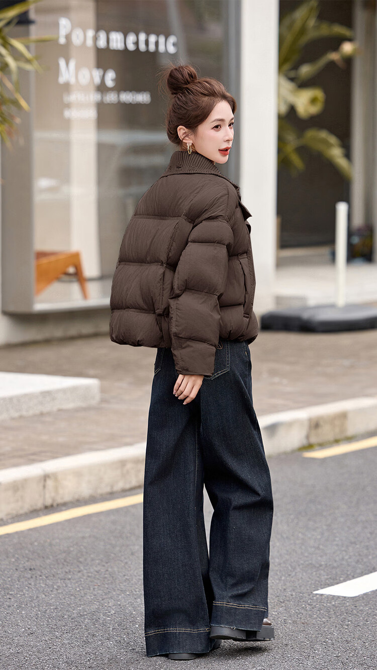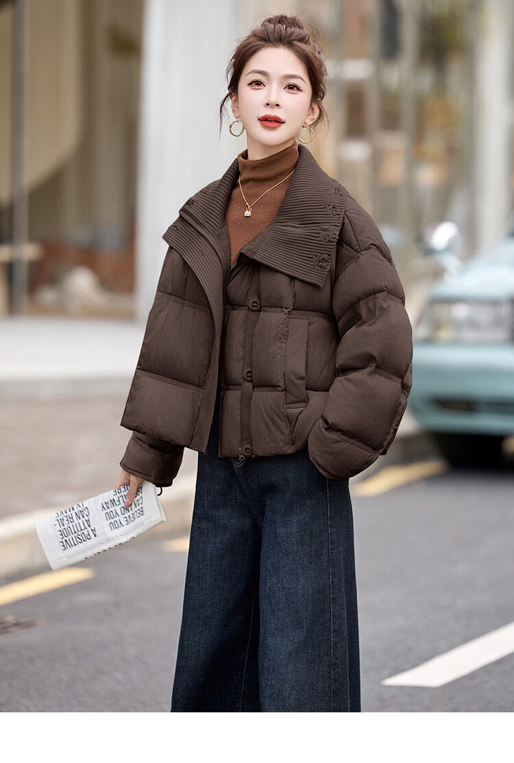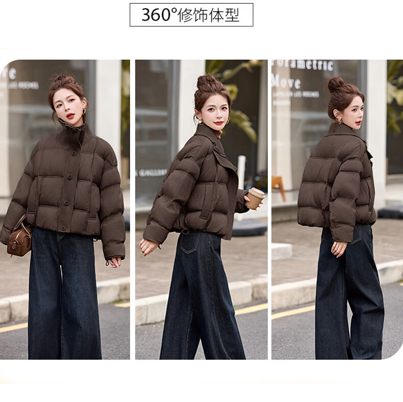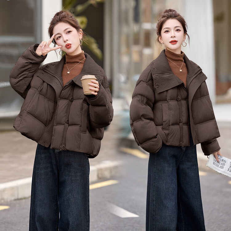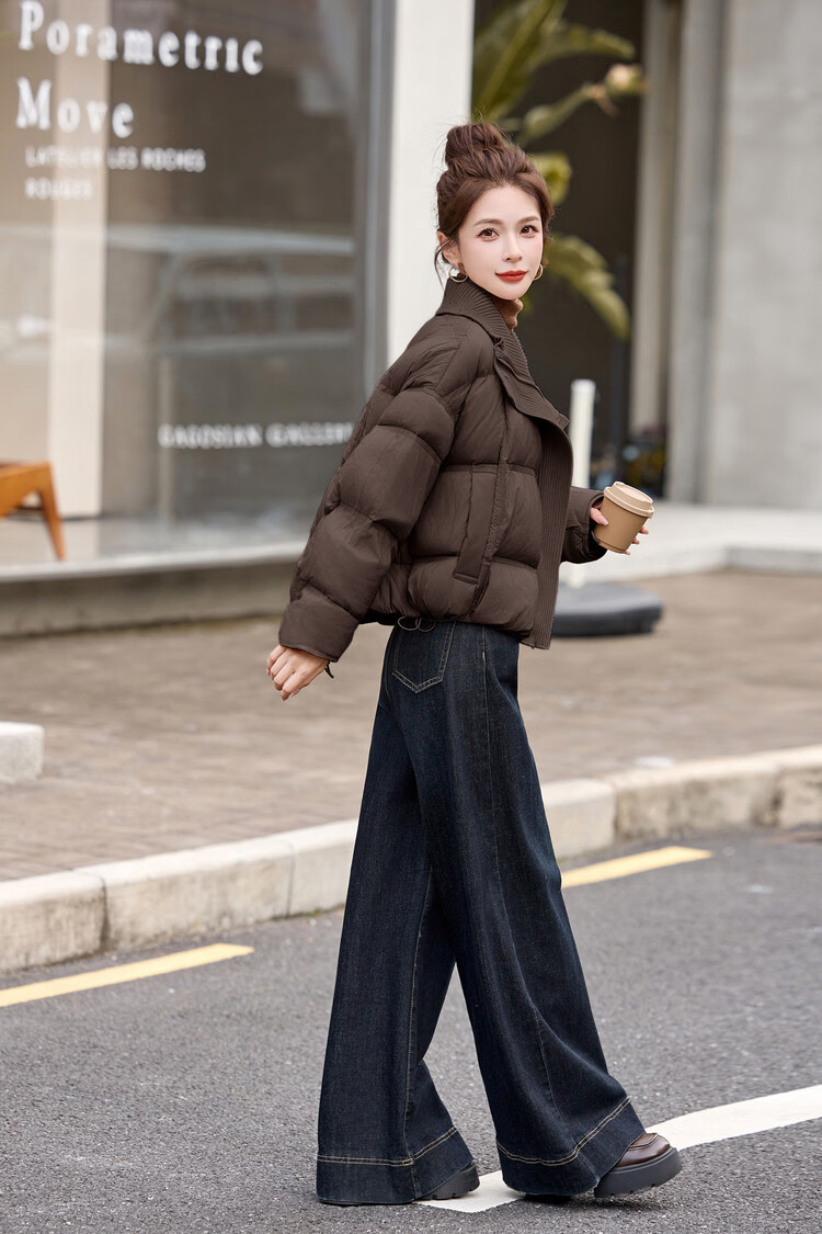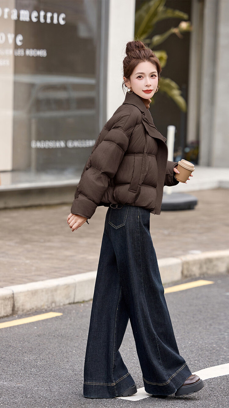 Hengyuanxiang knitted stitching large lapel short down jacket for women 2026 winter fashionable white duck down thickened warm jacket beige M