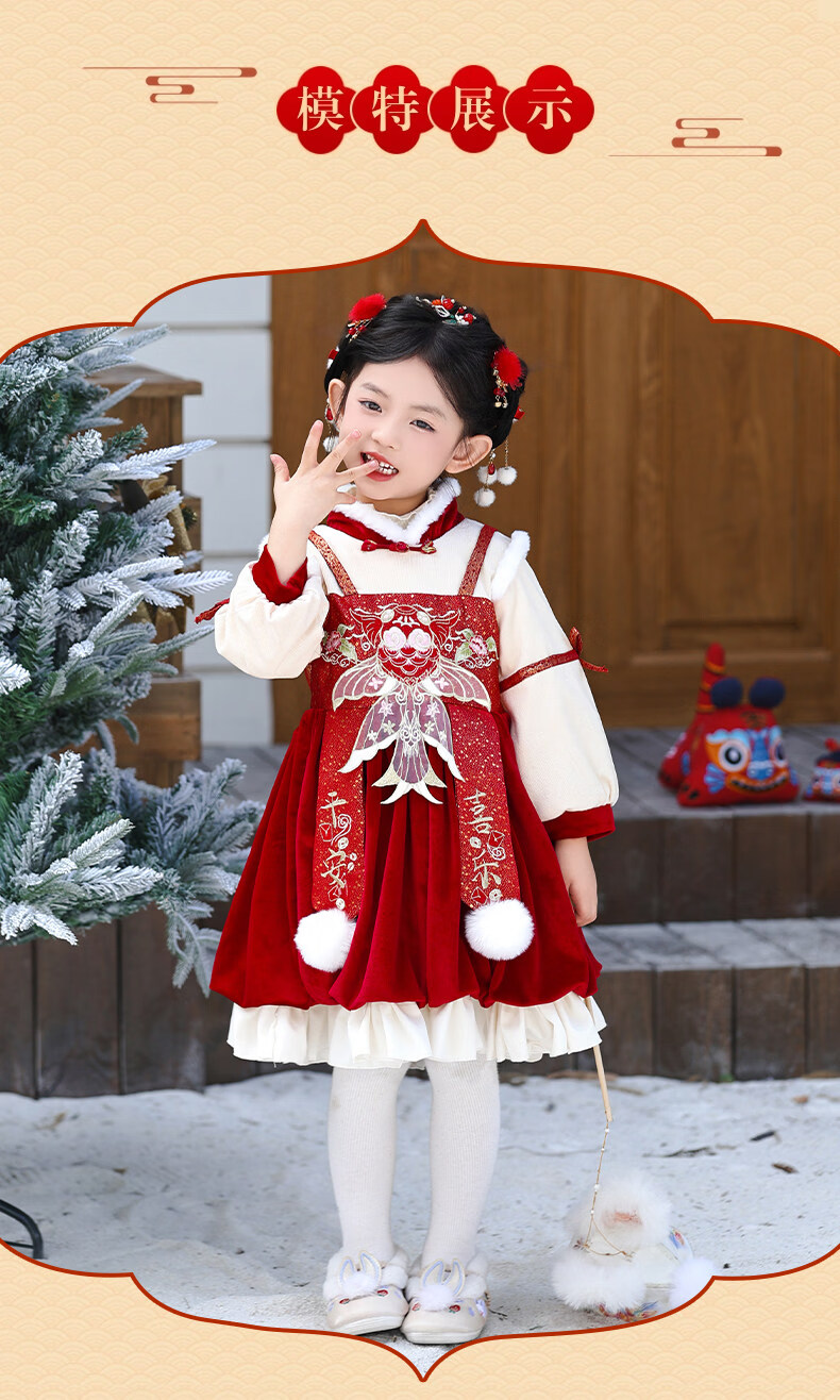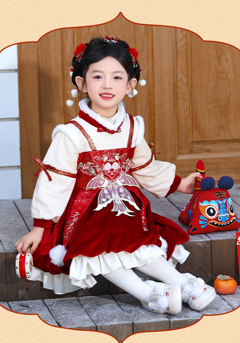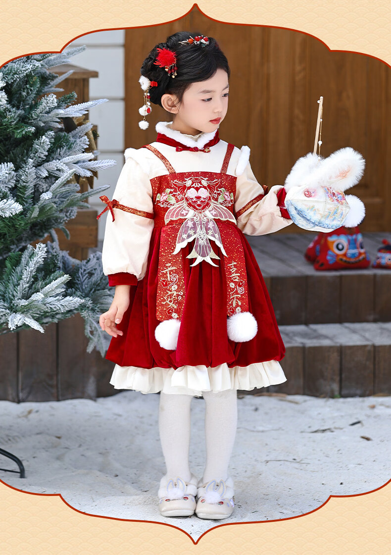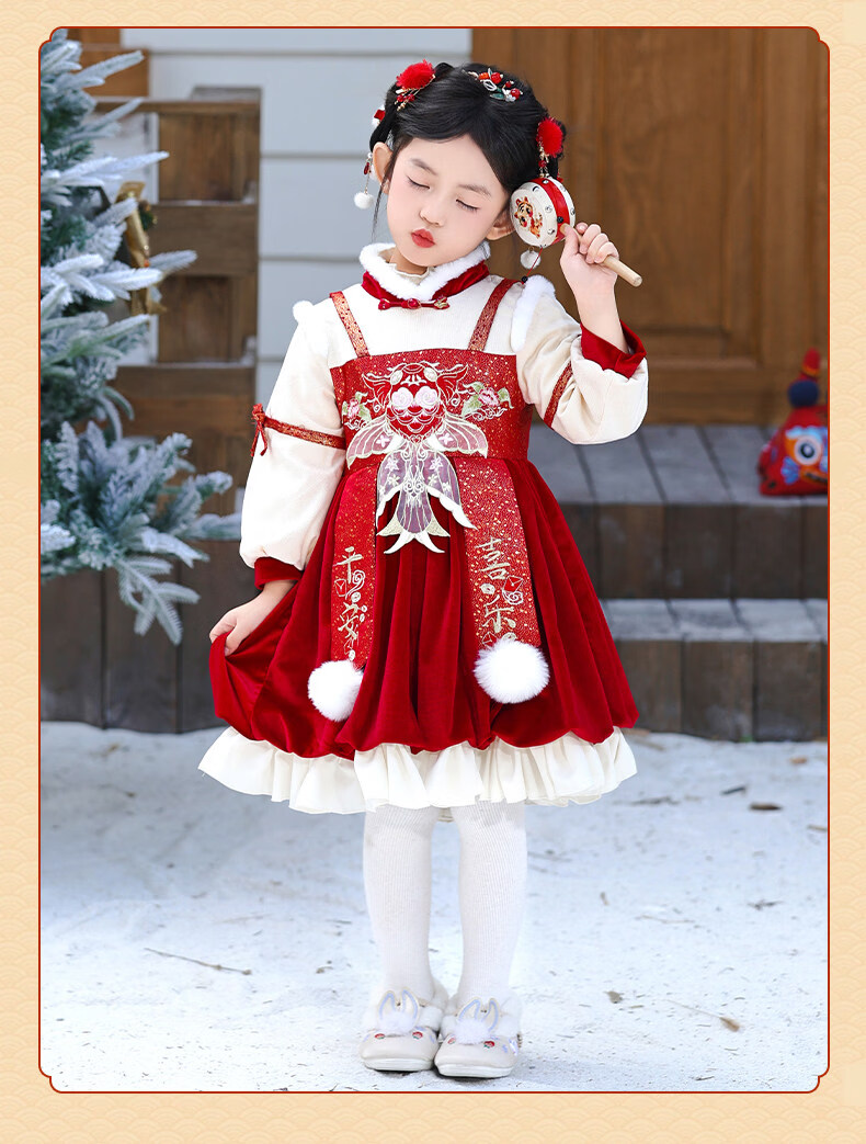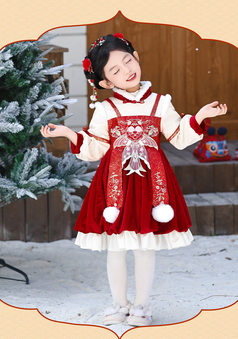 Disney Girls New Year Clothes Han Clothing Girls New Year Clothes 2025 New Velvet Autumn and Winter Clothes Baby Girls Dress Children Red Koi Dress + Pantyhose + Red Boots (Headgear + Eyebrow Stickers) Plus Velvet 90