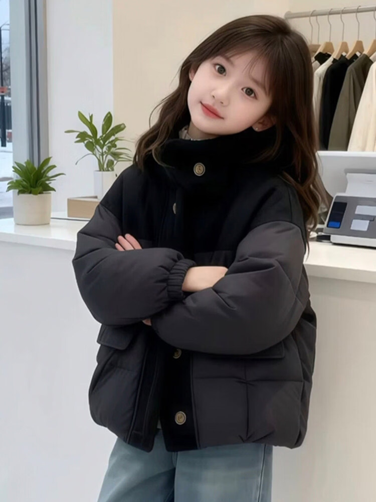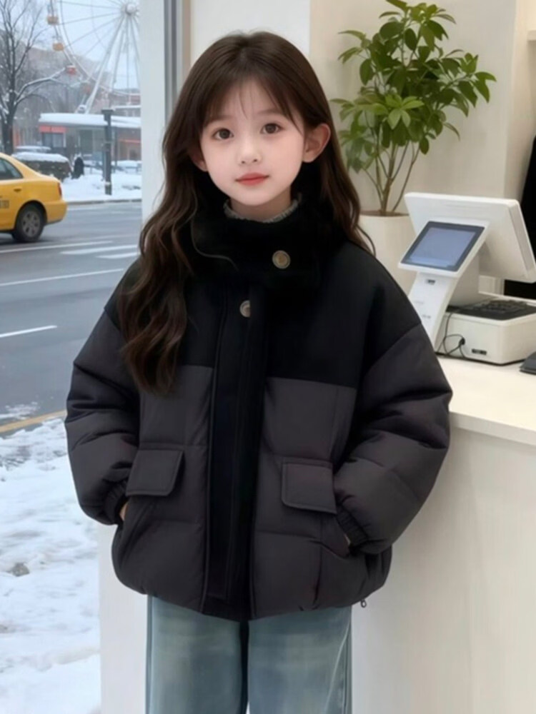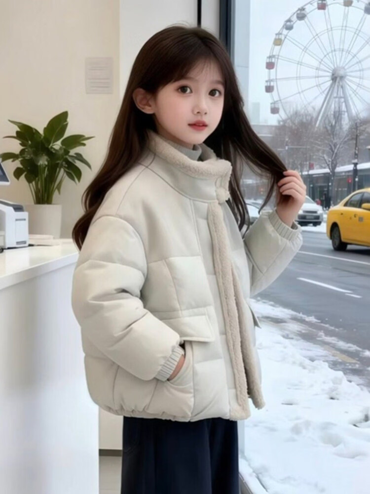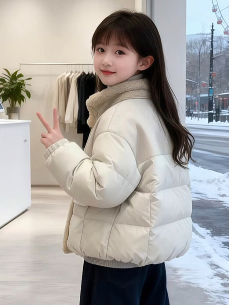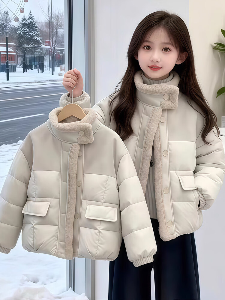 Disney Down Jacket Girls' Cotton Clothes Winter New Style Children's Style Korean Style Spliced Cotton Clothes Winter Girls' Padded Clothes Thickened Outer Cotton Clothes Style Beige Color 120 cm Card Code Take One Size Larger