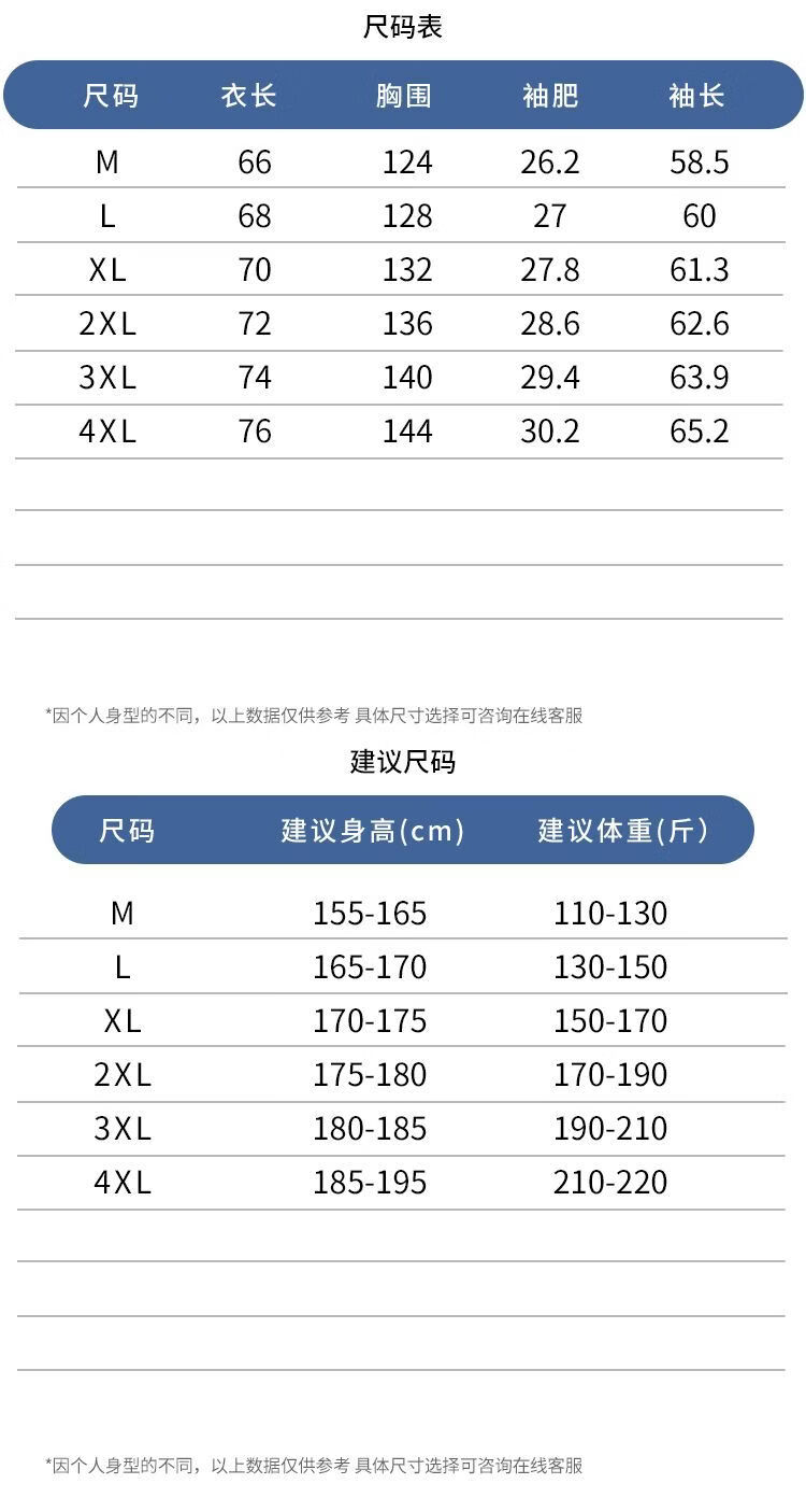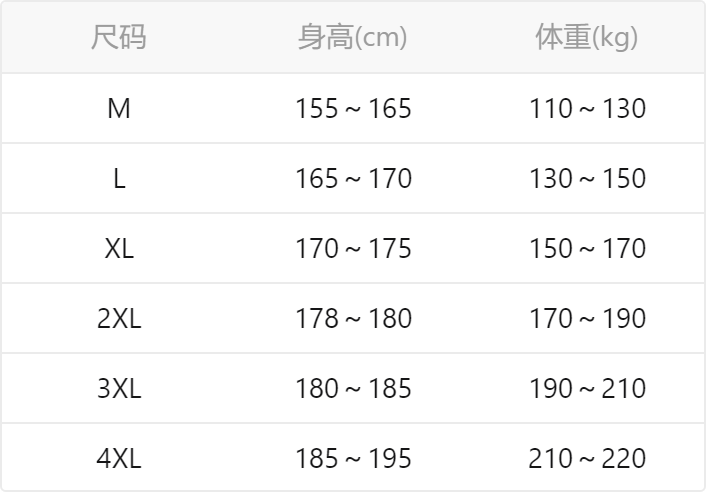 China (cm) 165 / 88-90 170 / 96-98 175 / 108-110 180 / 118-122 185 / 126-130