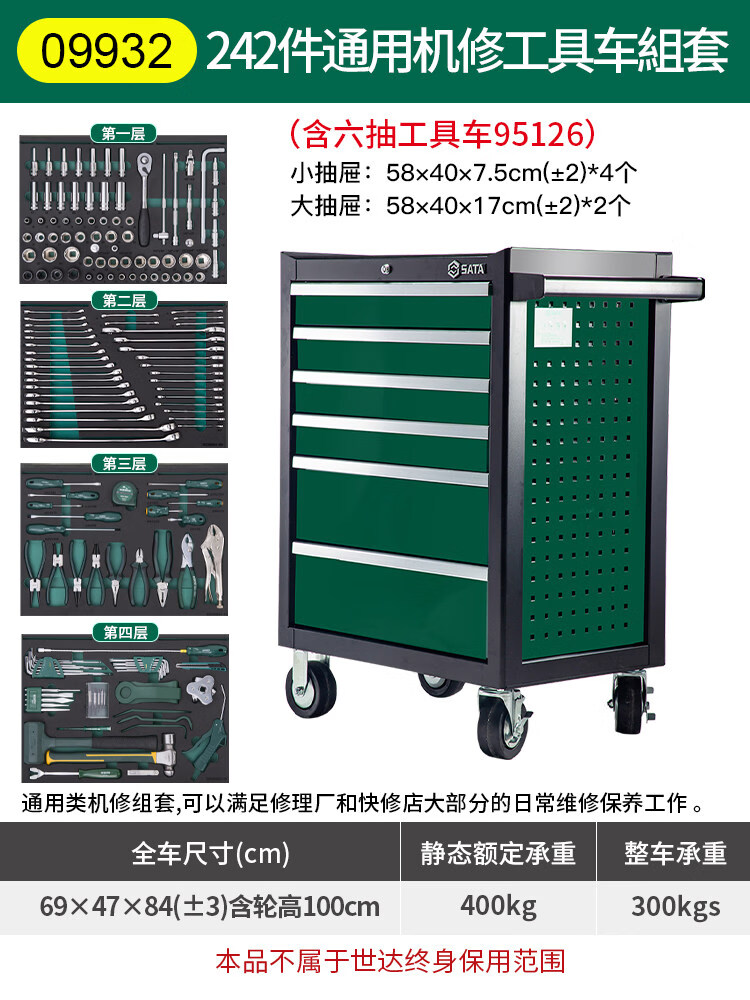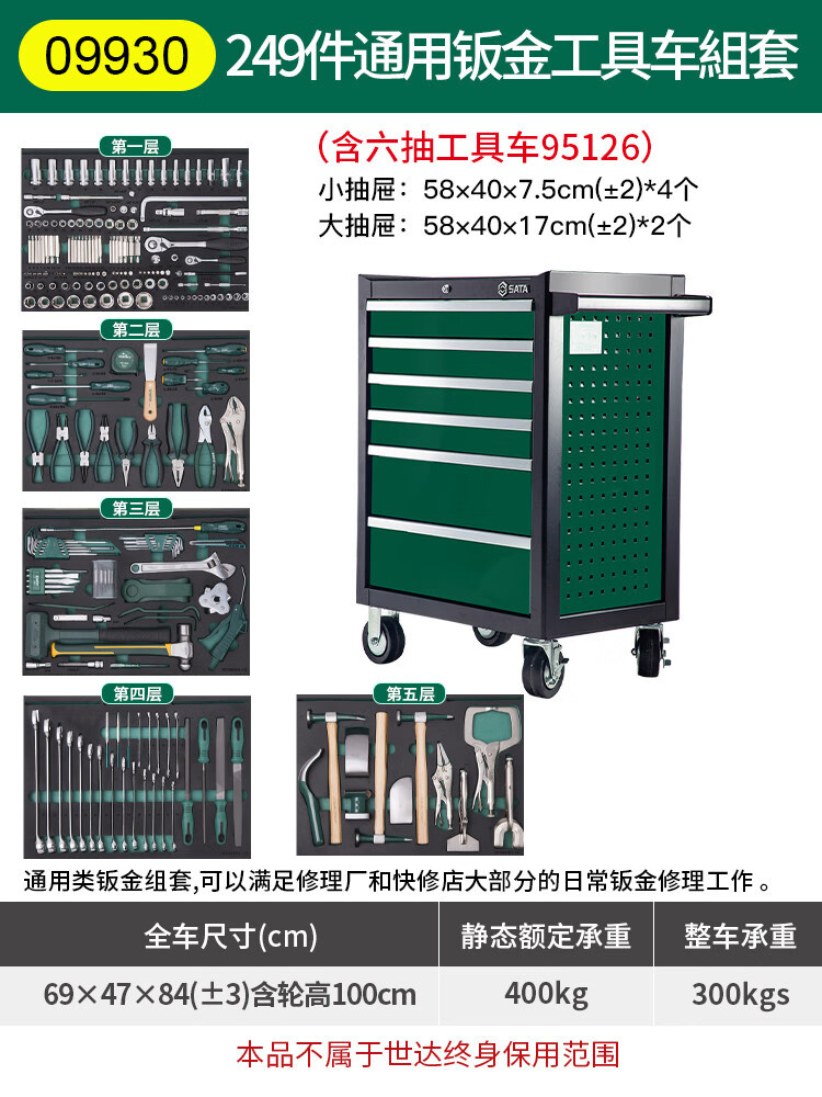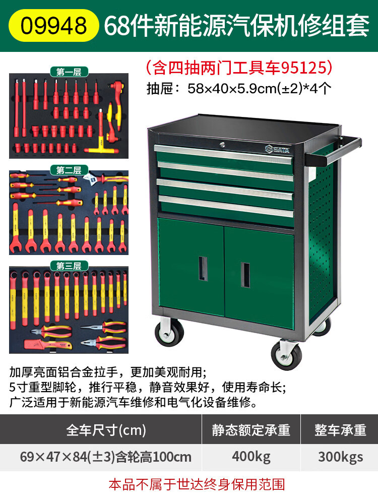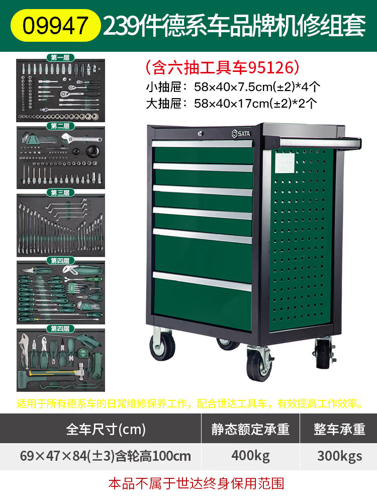 SATA Auto Repair Tool Cart Set Sheet Metal Machine Repair Heavy-Duty Mobile Cabinet Contains Tools Factory Workshop Repair Box 09947_239 Pieces German Car Auto Maintenance Machine Repair Set (Including Six Drawing Tools