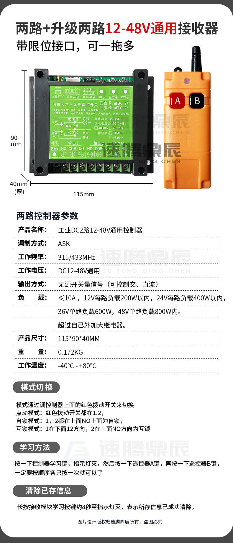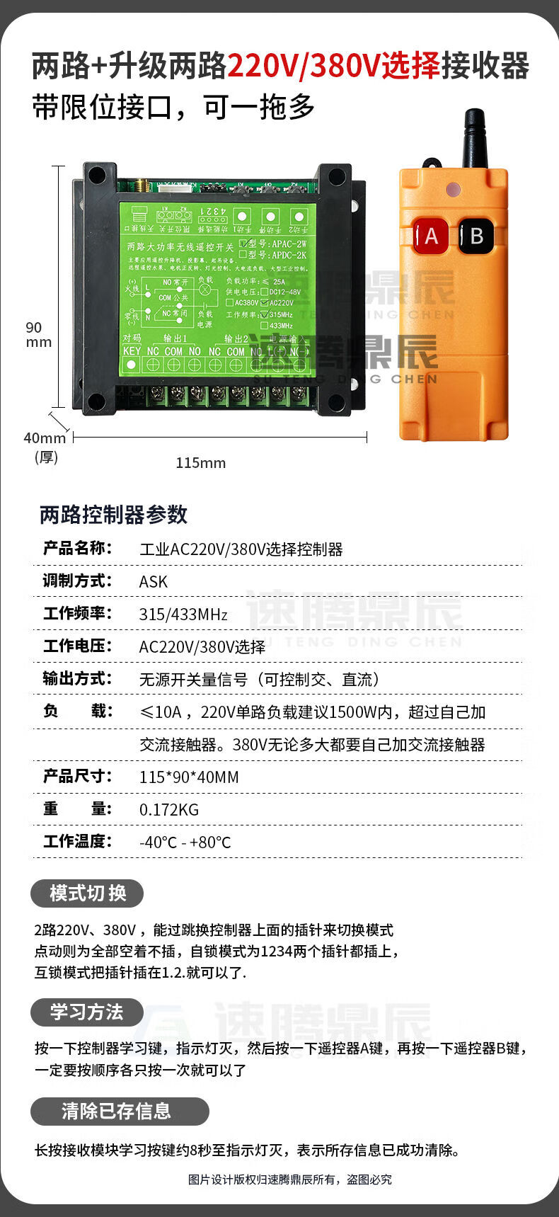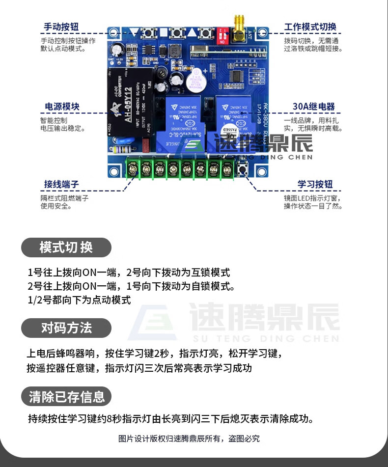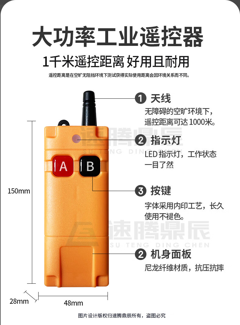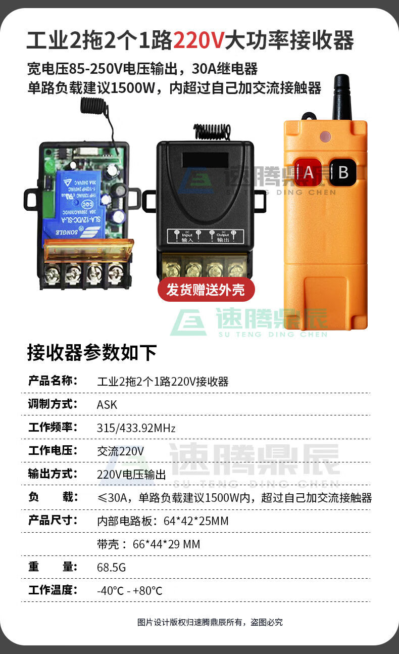 Industrial 220V-380V wireless remote control switch water pump motor forward and reverse electric cabinet button curtain 24V controller upgrade industrial 2-button handle + 2-way 12V10A passive