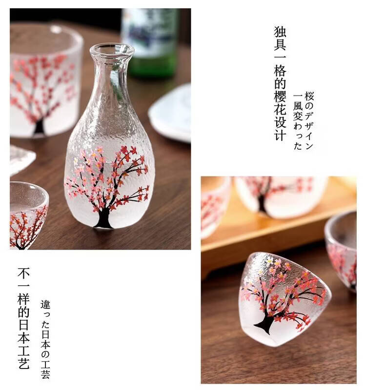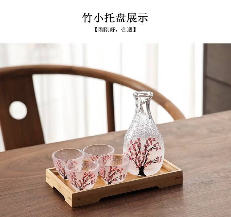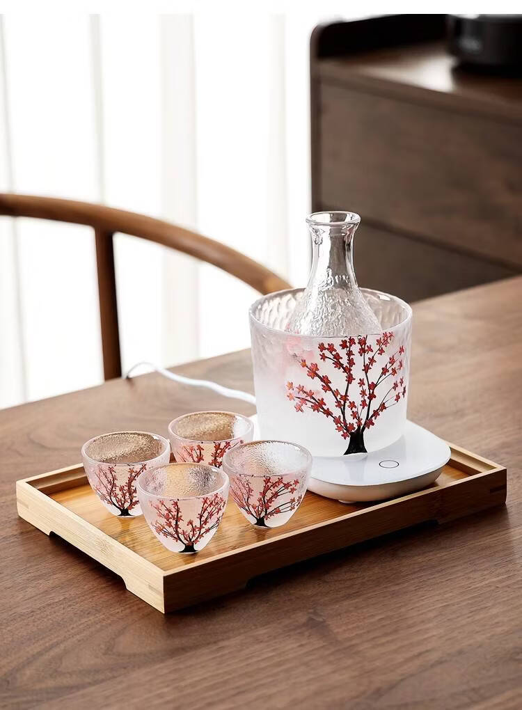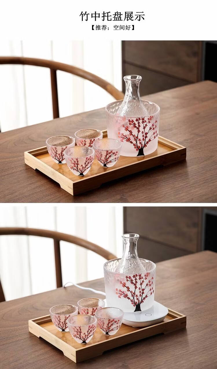 Fantasy hand-painted cherry blossom tree glass wine set white wine rice wine cup household one or two spirit cups warmer jug sake jug cherry blossom tree 1 pot 4 cups + wine warmer + bamboo middle plate + thermostat