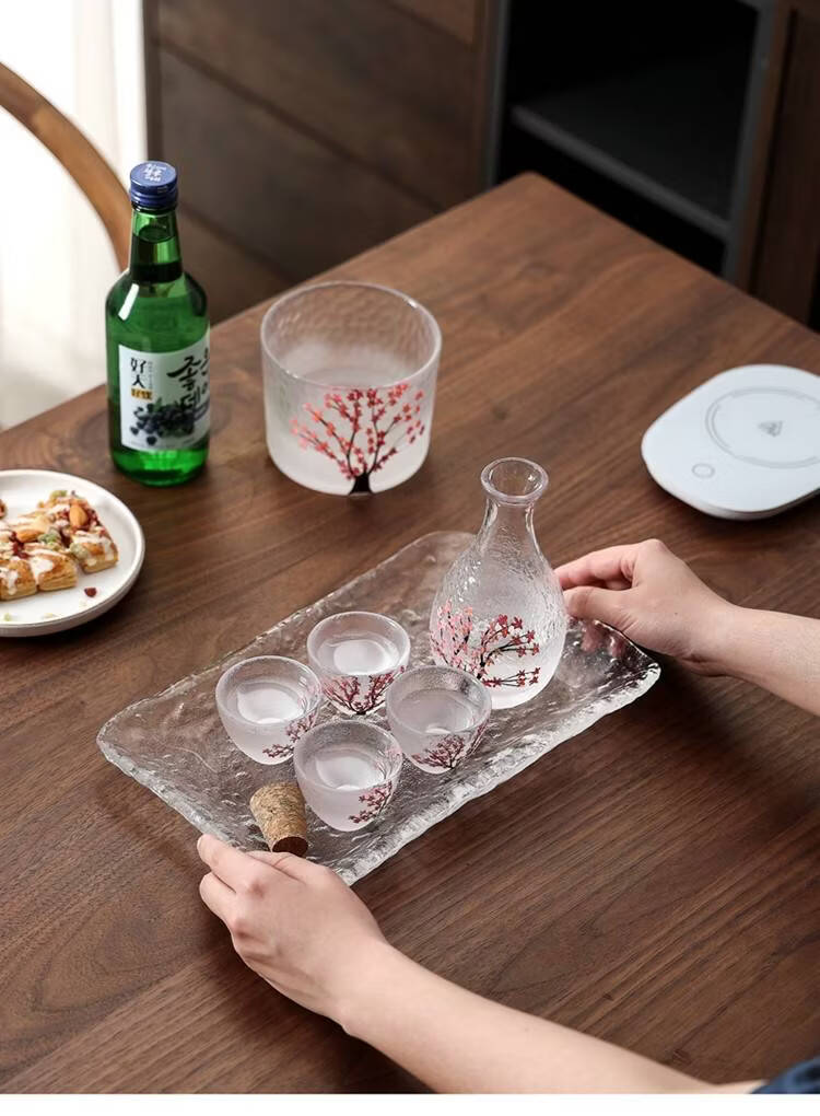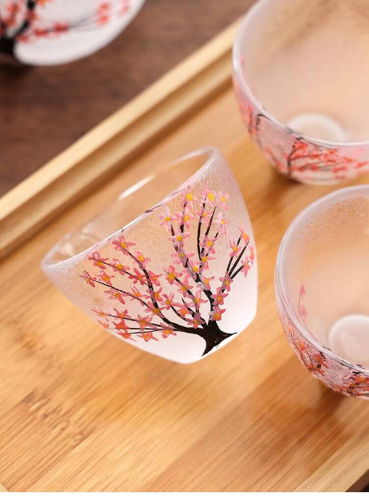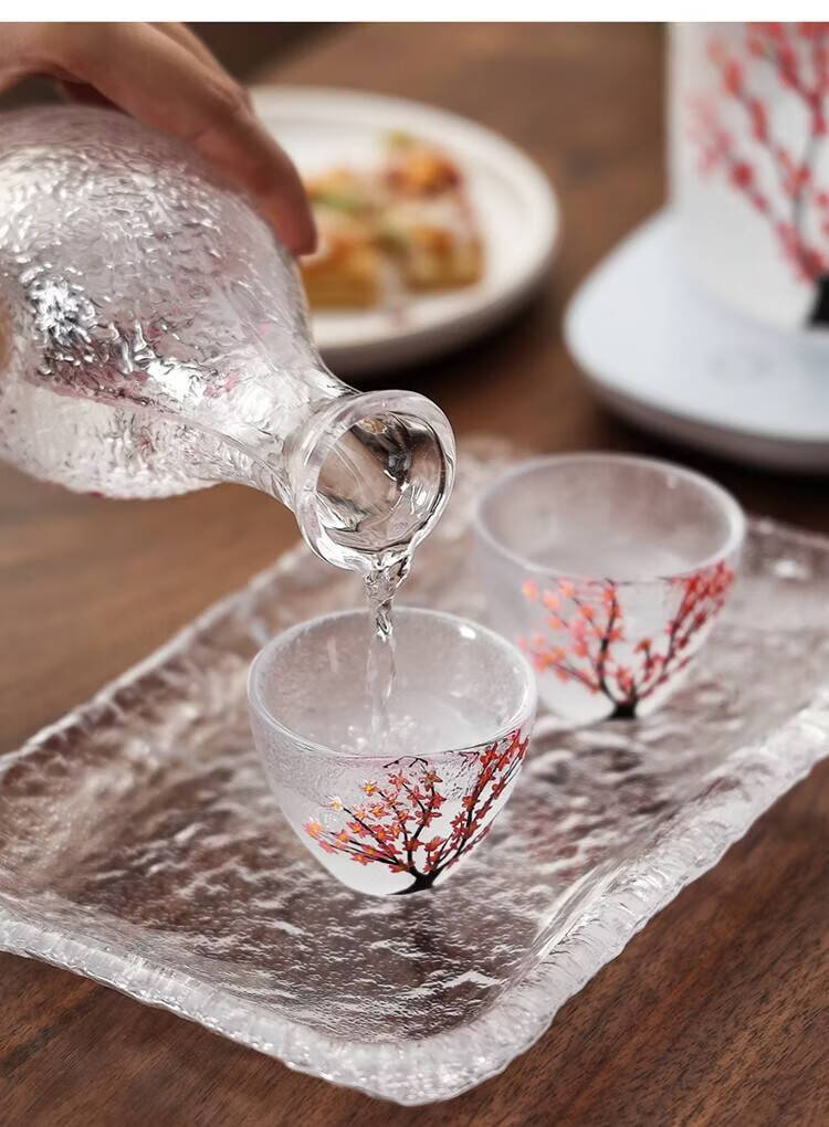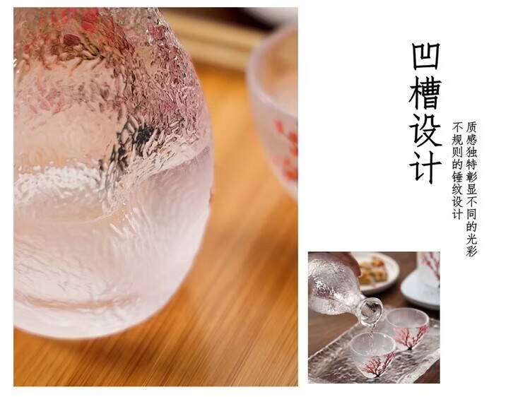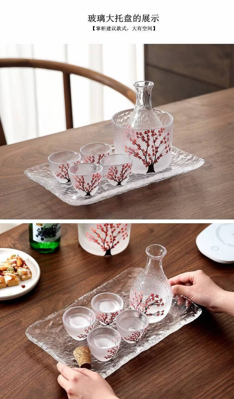 Fantasy hand-painted cherry blossom tree glass wine set white wine rice wine cup household one or two spirit cups warmer jug sake jug cherry blossom tree 1 pot 4 cups + wine warmer + bamboo middle plate + thermostat