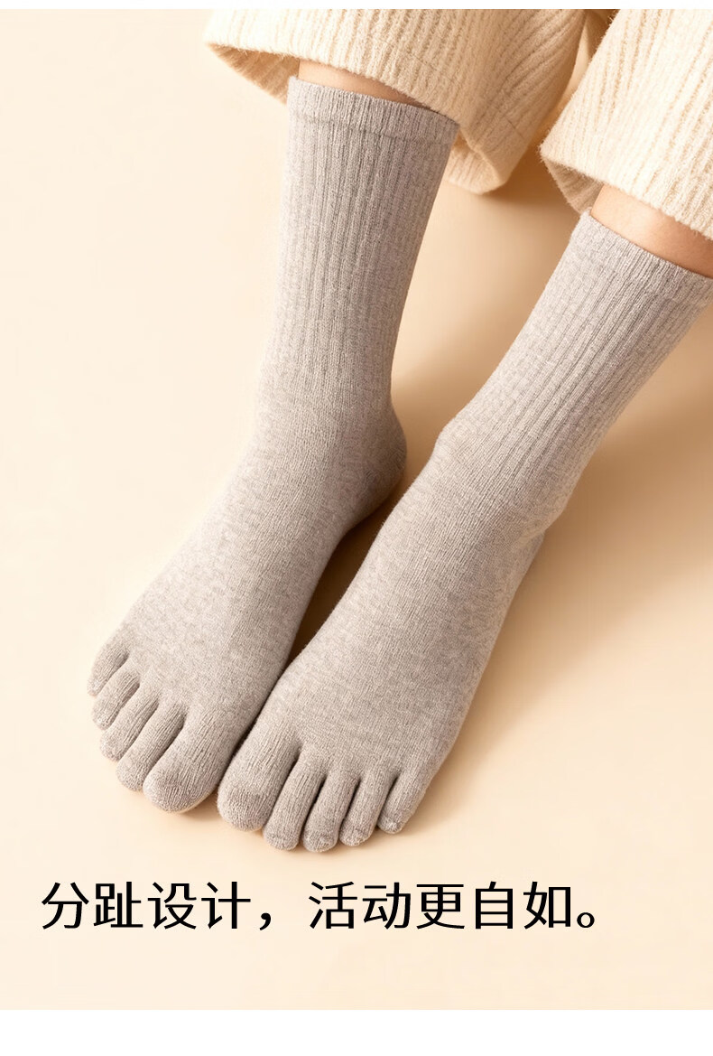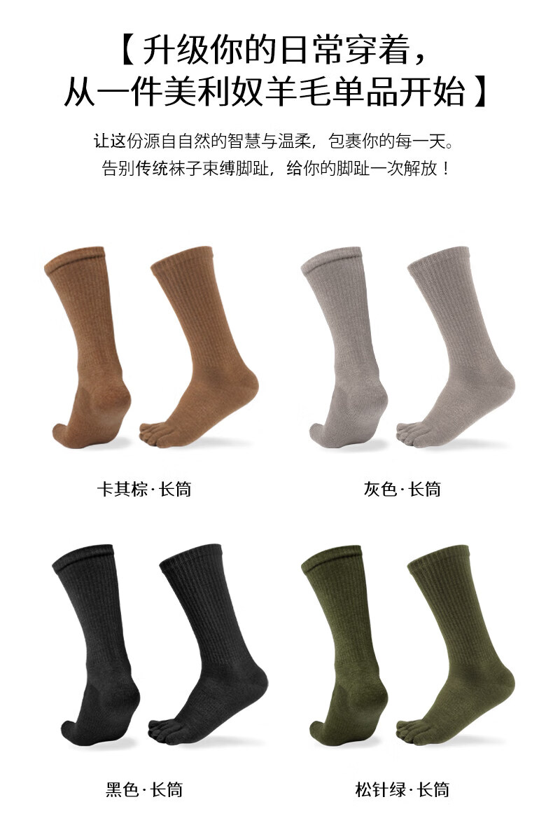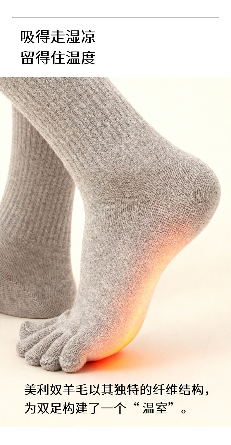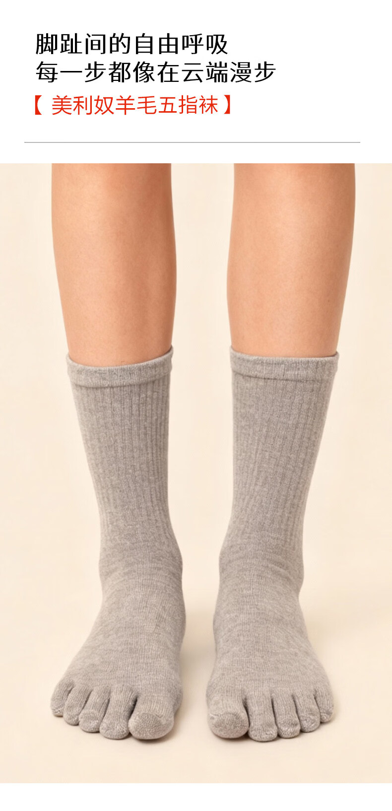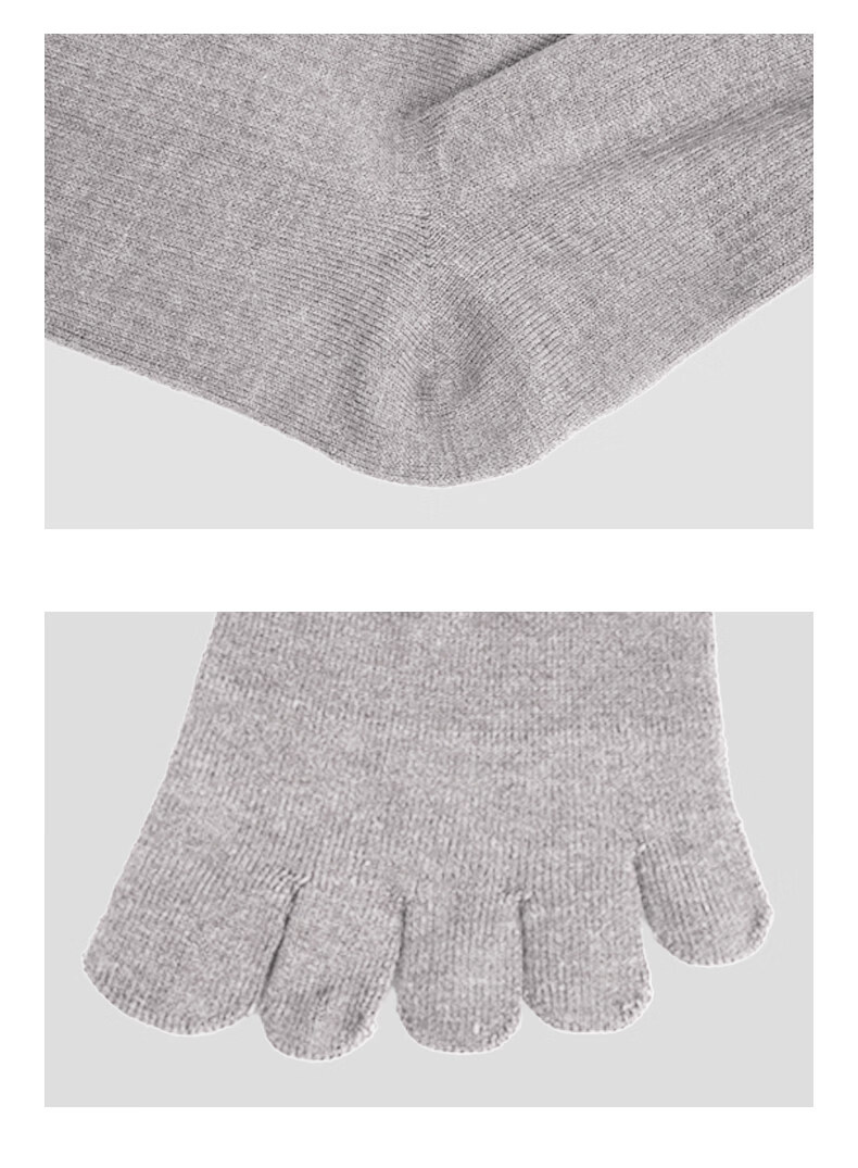 Gray shell merino wool five-finger socks for men and women, deodorant warm mid-calf socks, breathable sports split toe socks, long tube, light gray M