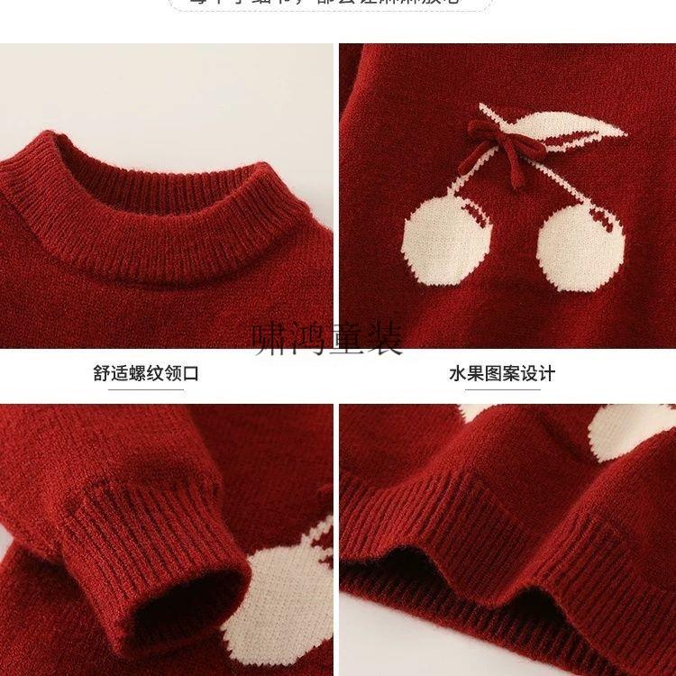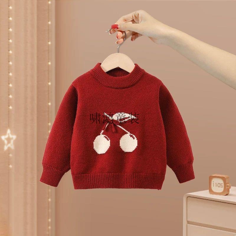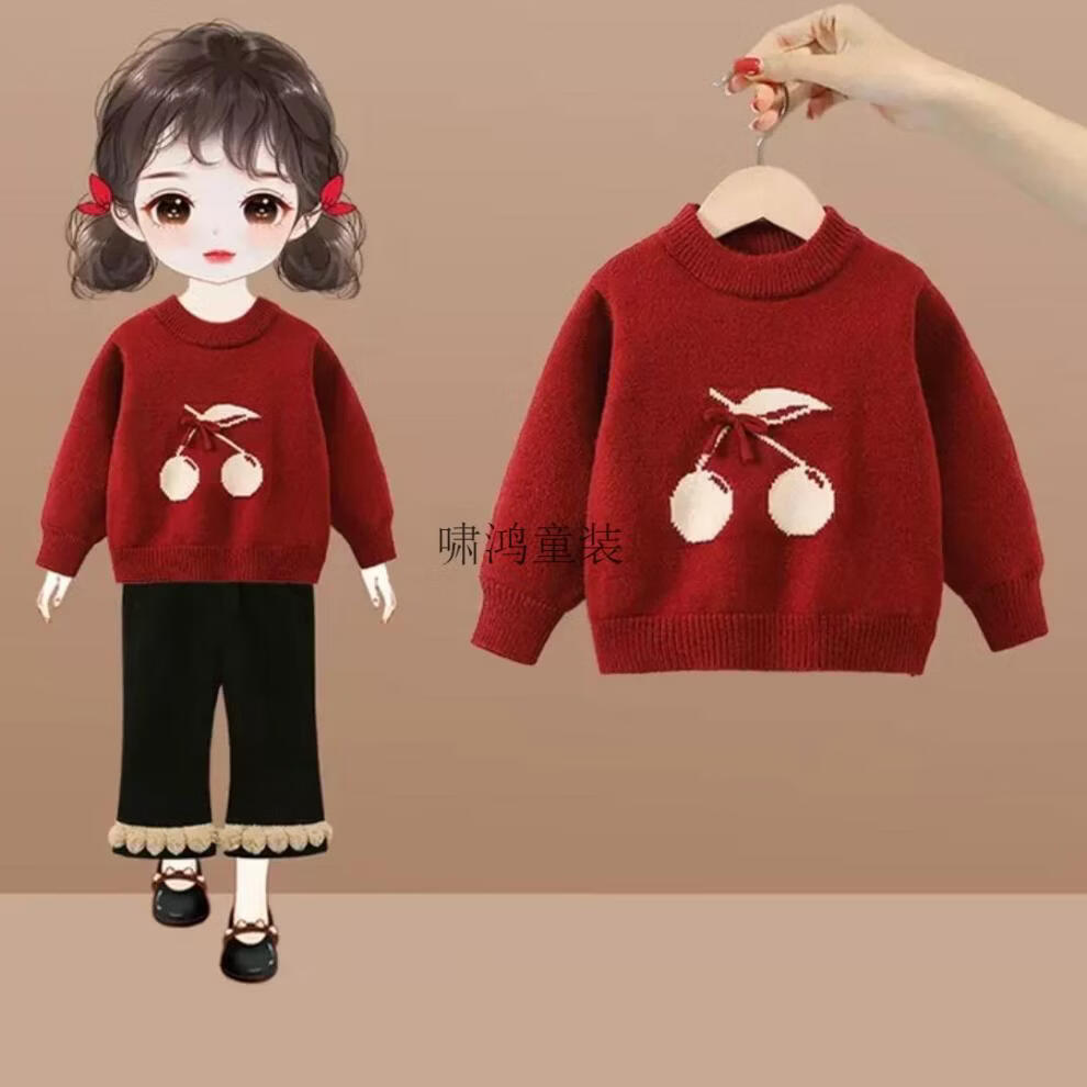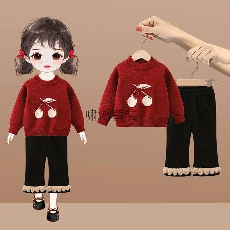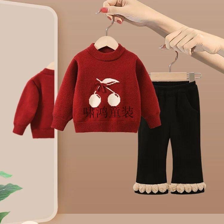 Wooden house girls suit 2026 new autumn and winter clothing children's fashionable festive sweater baby plus fleece pants two-piece set red sweater 90