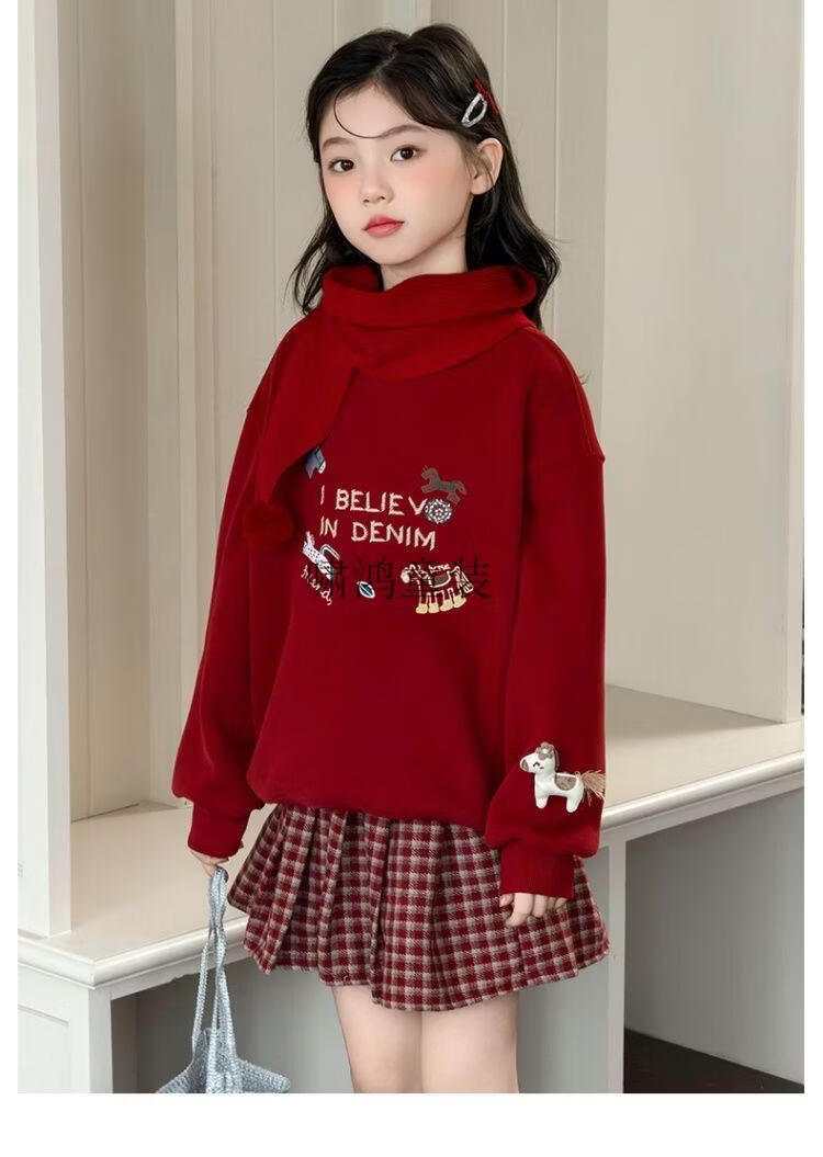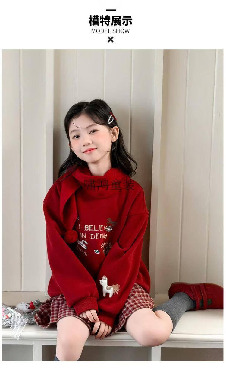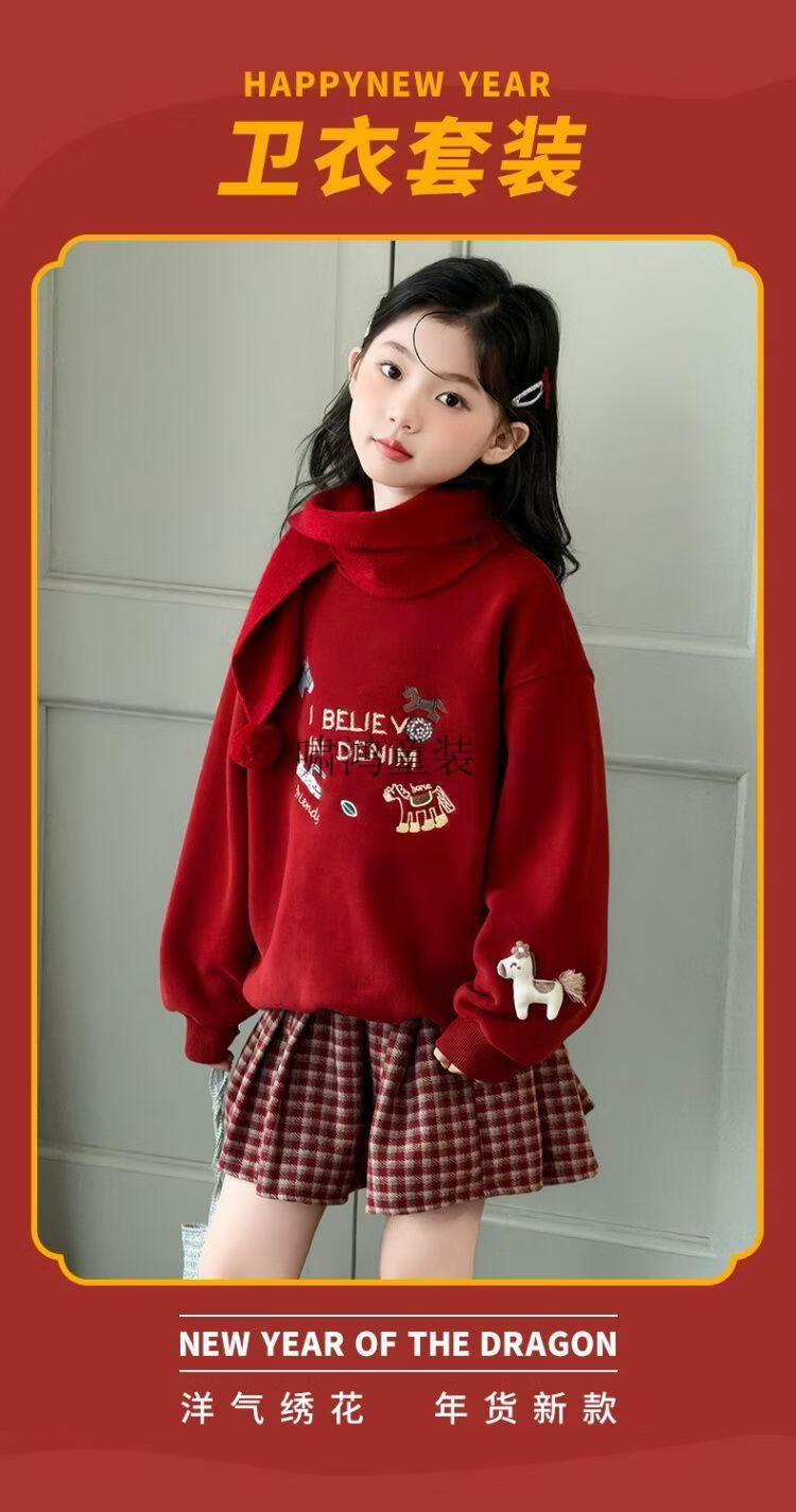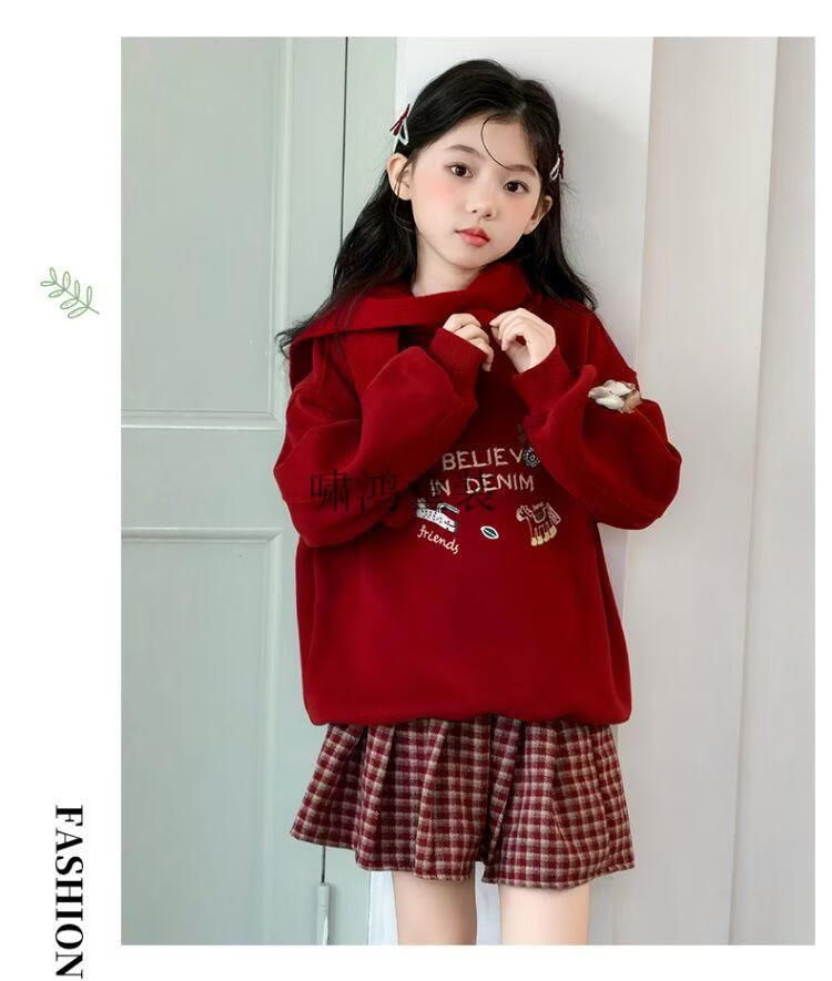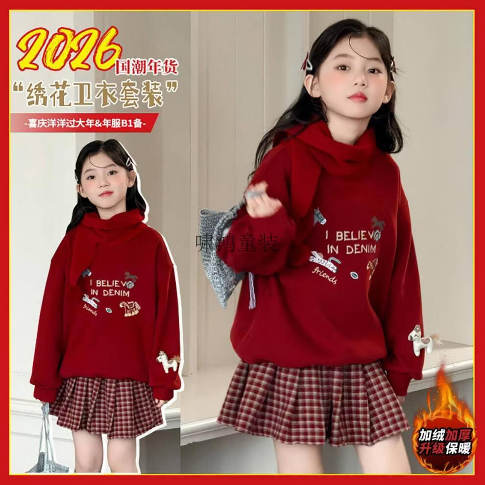 Wooden house girls' velvet sweatshirt suit autumn and winter 2026 foreign-style children's New Year all-in-one velvet winter thickened New Year greetings two-piece set red sweatshirt with scarf plus velvet 160