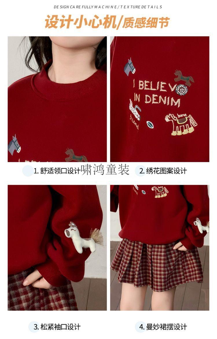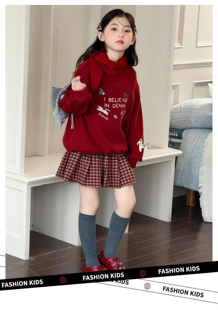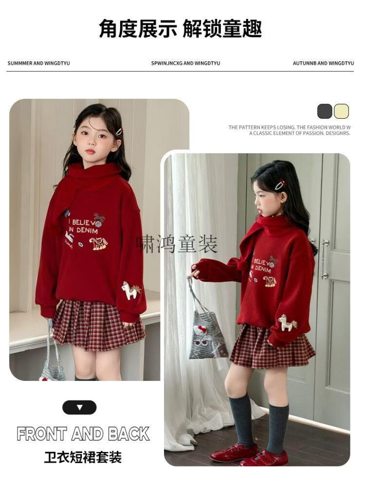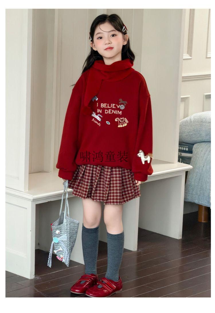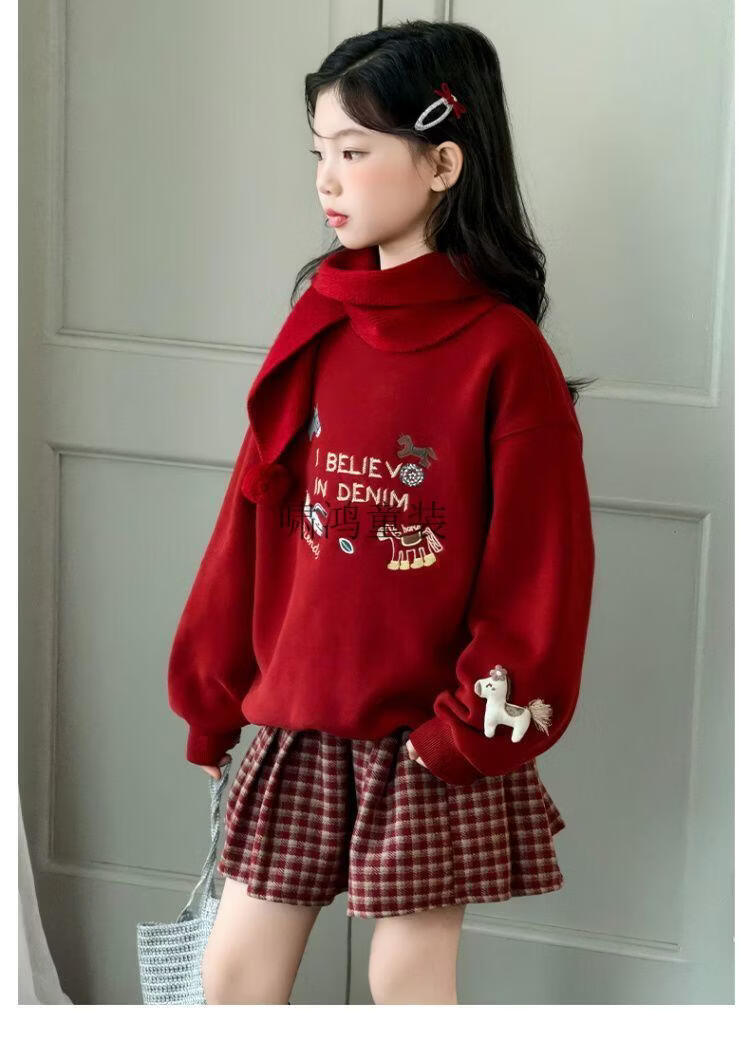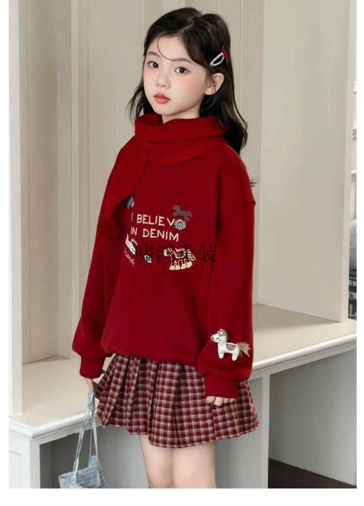 Wooden house girls' velvet sweatshirt suit autumn and winter 2026 foreign-style children's New Year all-in-one velvet winter thickened New Year greetings two-piece set red sweatshirt with scarf plus velvet 160