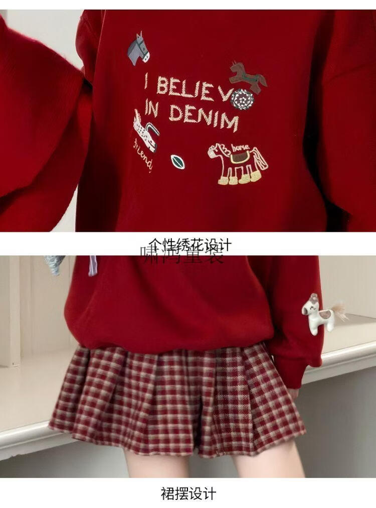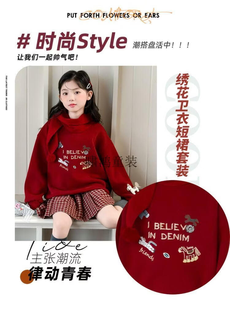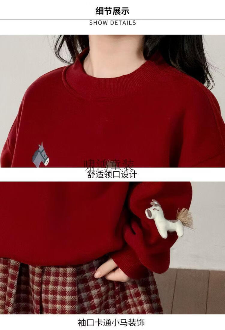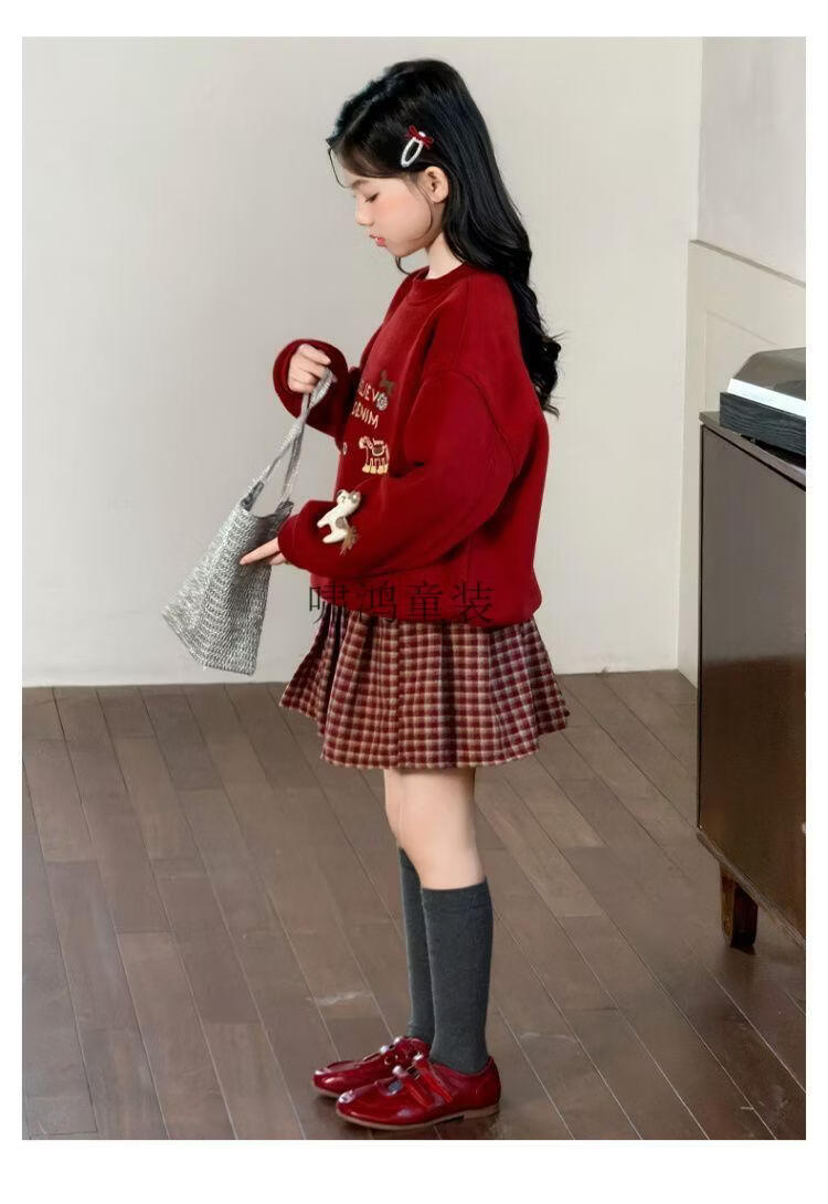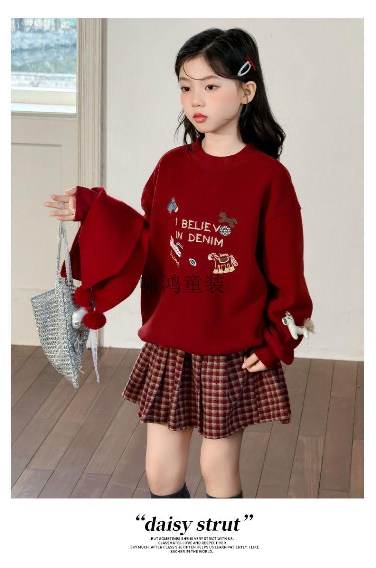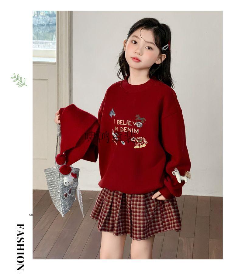 Wooden house girls' velvet sweatshirt suit autumn and winter 2026 foreign-style children's New Year all-in-one velvet winter thickened New Year greetings two-piece set red sweatshirt with scarf plus velvet 160