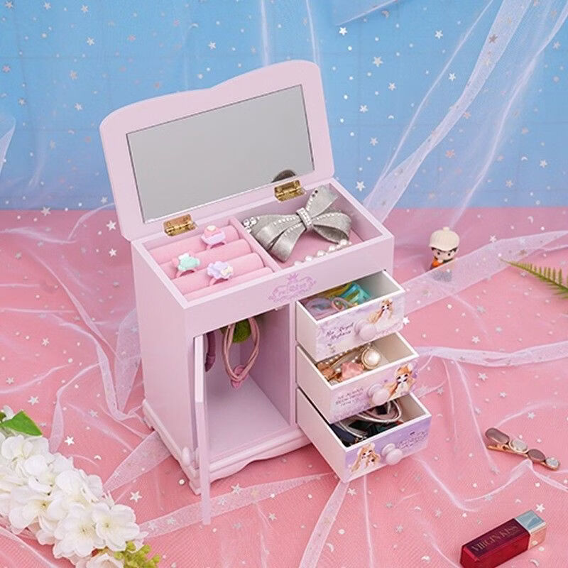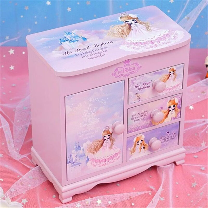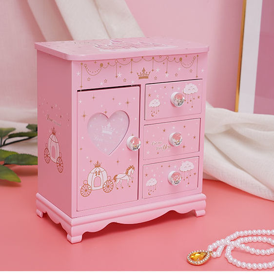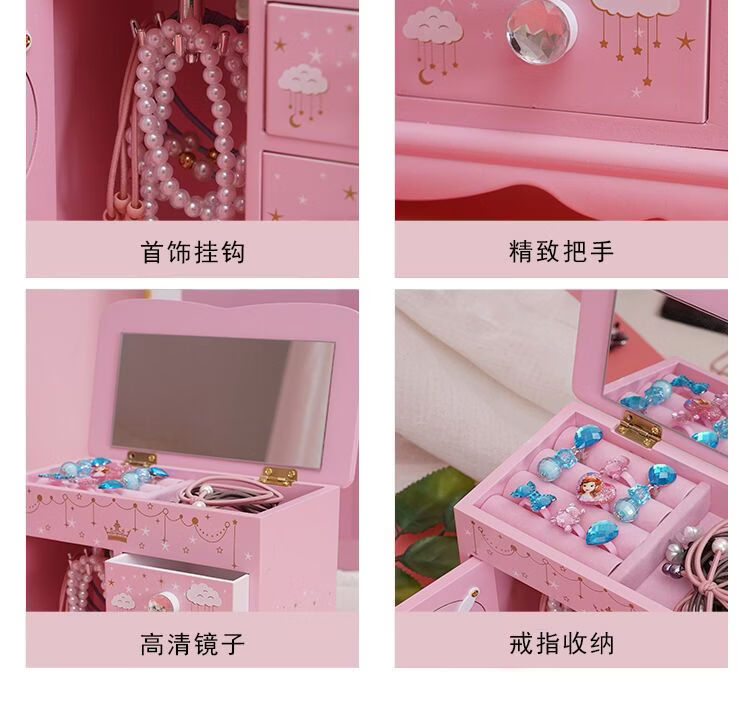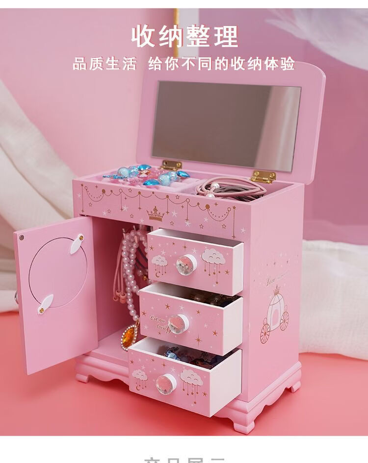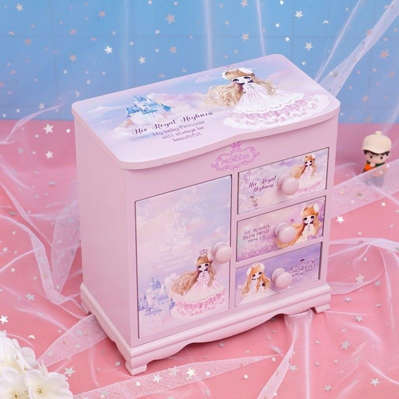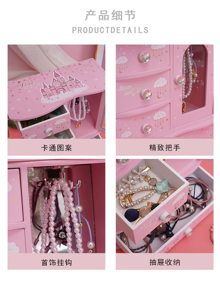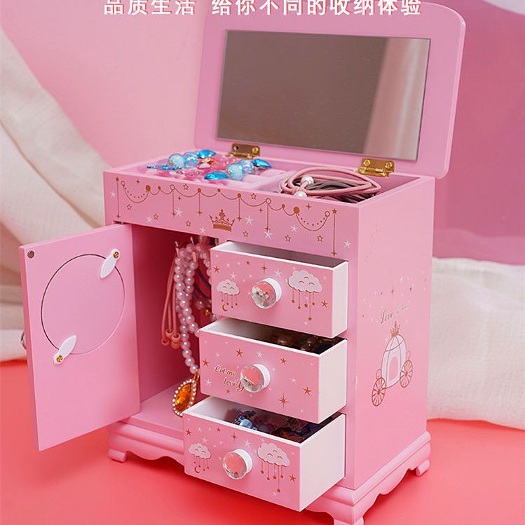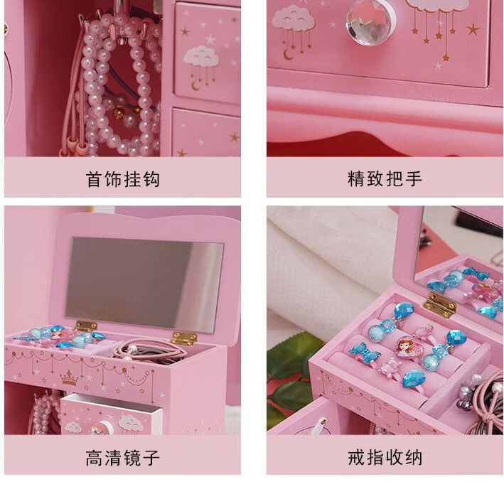 Fantasy Pink Castle Cartoon Wooden Jewelry Box Girl Jewelry Box Hairpin Storage Princess Tiara Drawer Cosmetic Box Kaicat Cat Three Drawers and One Door