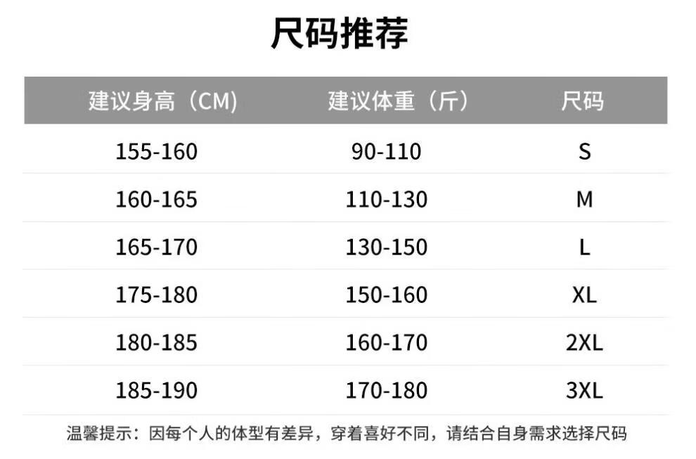 China (cm) 165 / 88-90 170 / 96-98 175 / 108-110 180 / 118-122 185 / 126-130