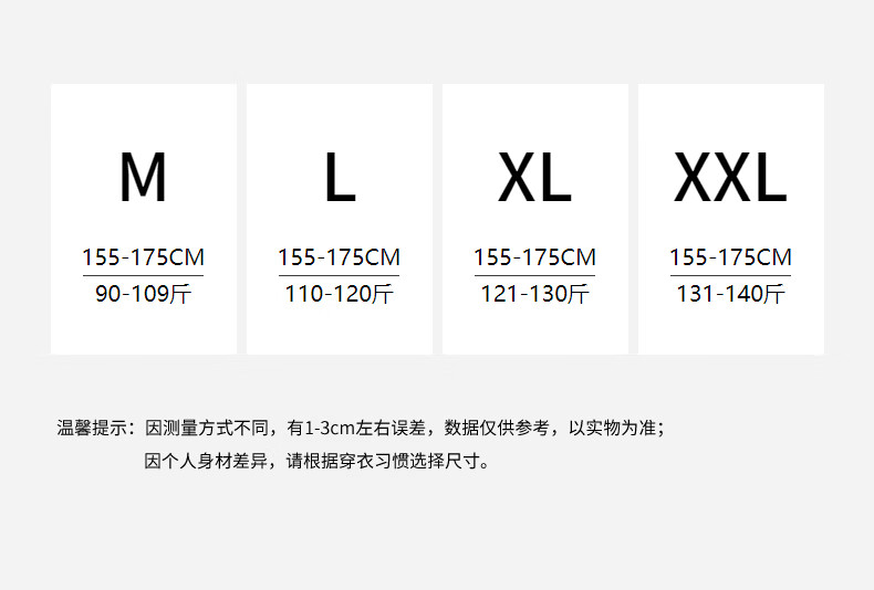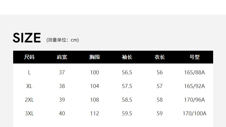 China (cm) 165 / 88-90 170 / 96-98 175 / 108-110 180 / 118-122 185 / 126-130