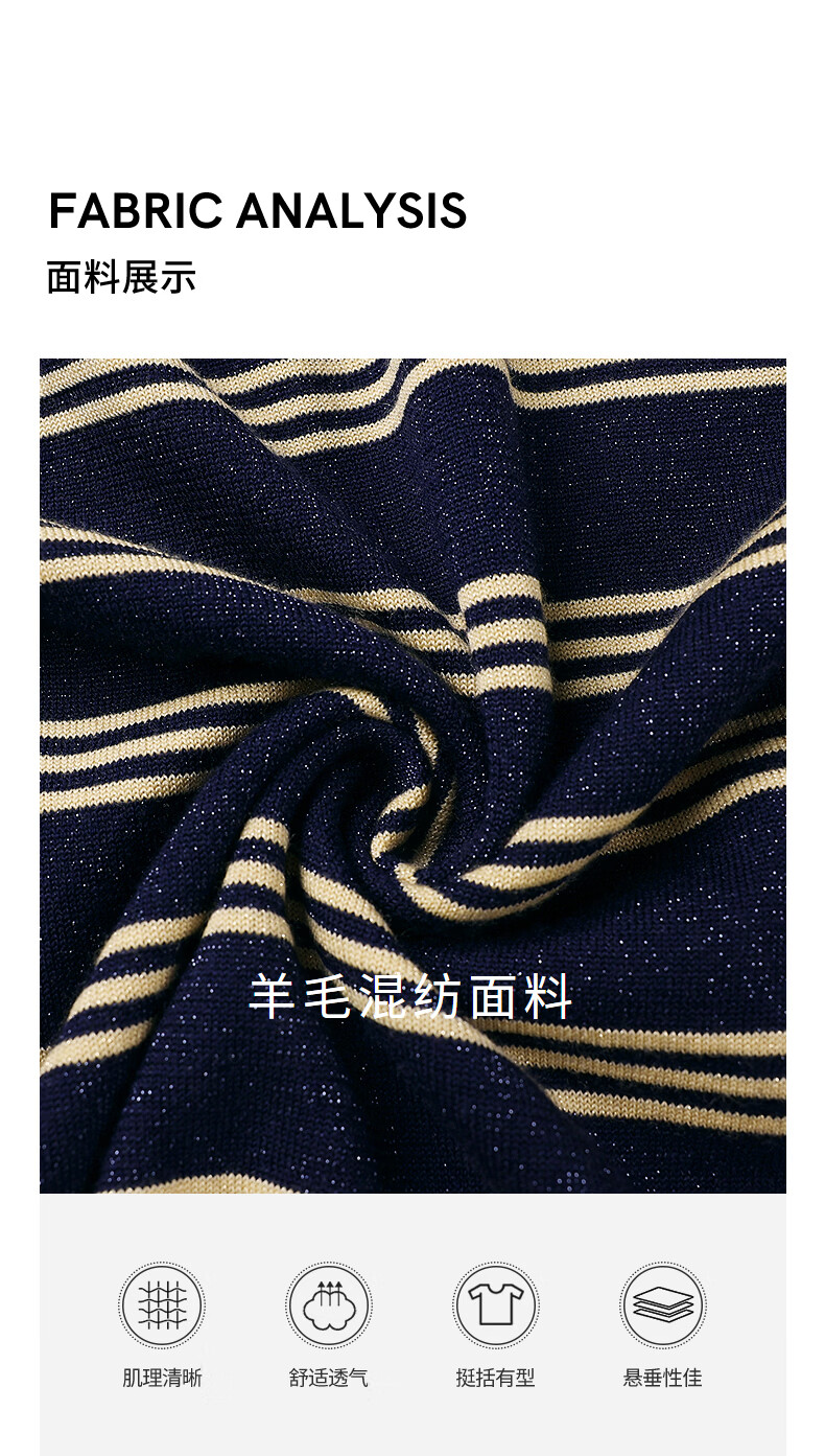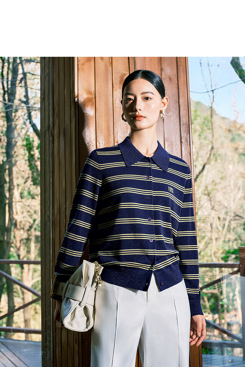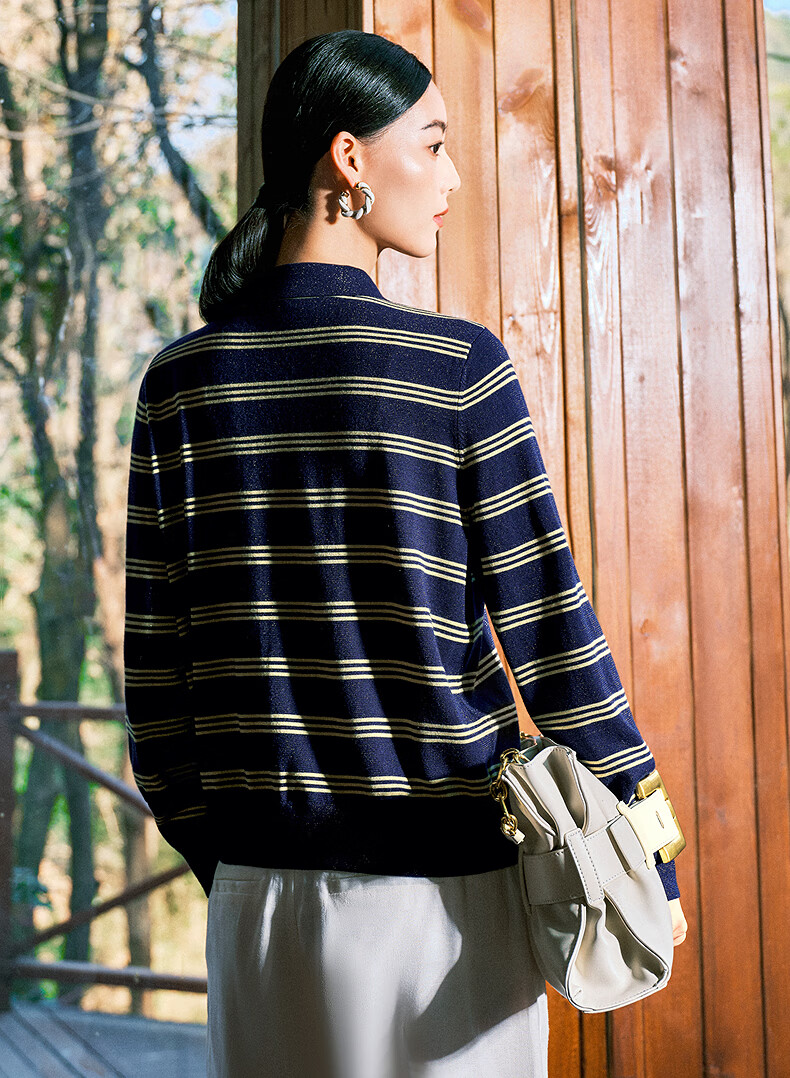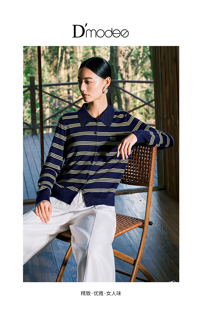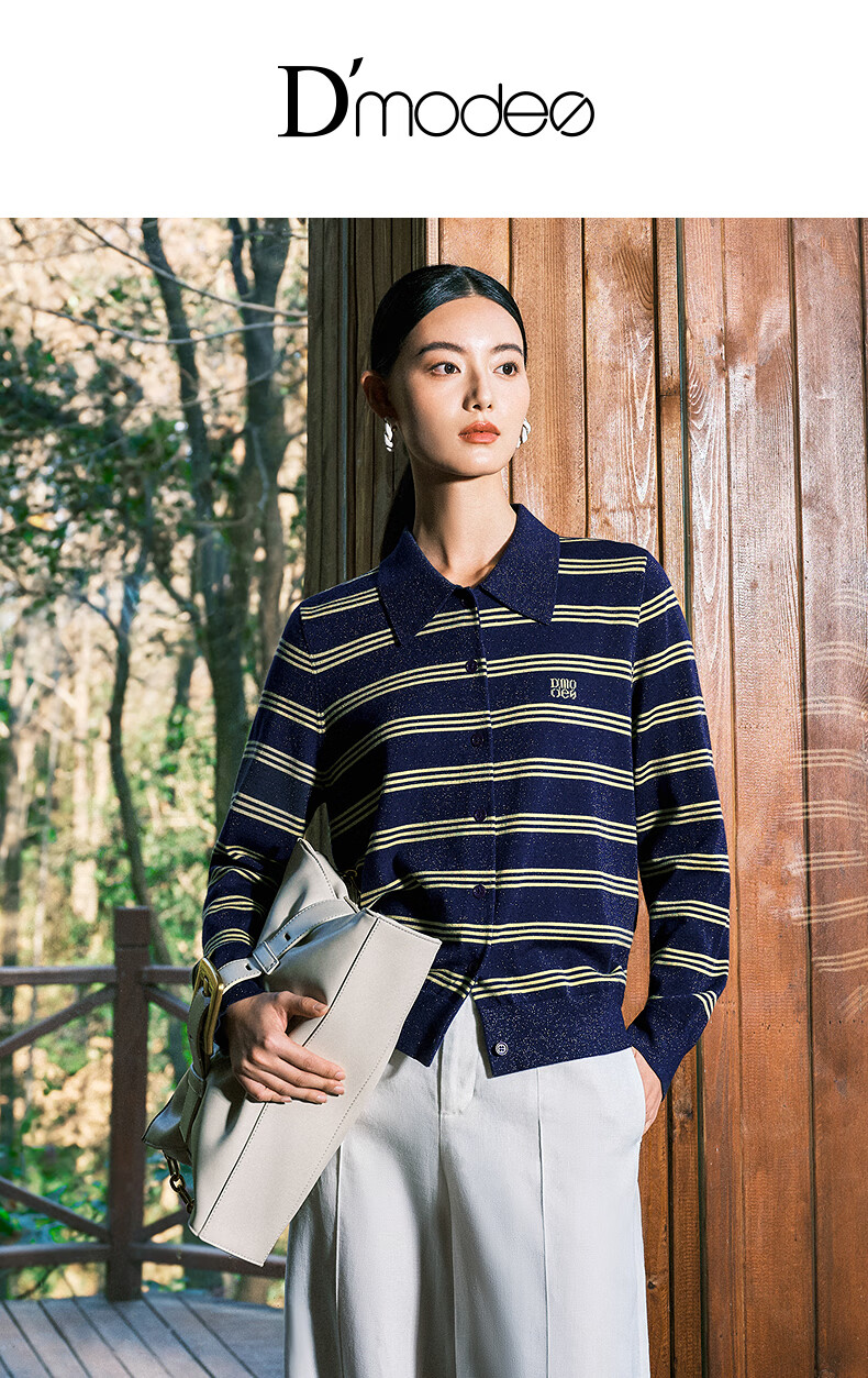 Daimashi Shopping Mall's same style 2026 spring new classic striped comfortable blended wool knitted cardigan for women, navy blue L