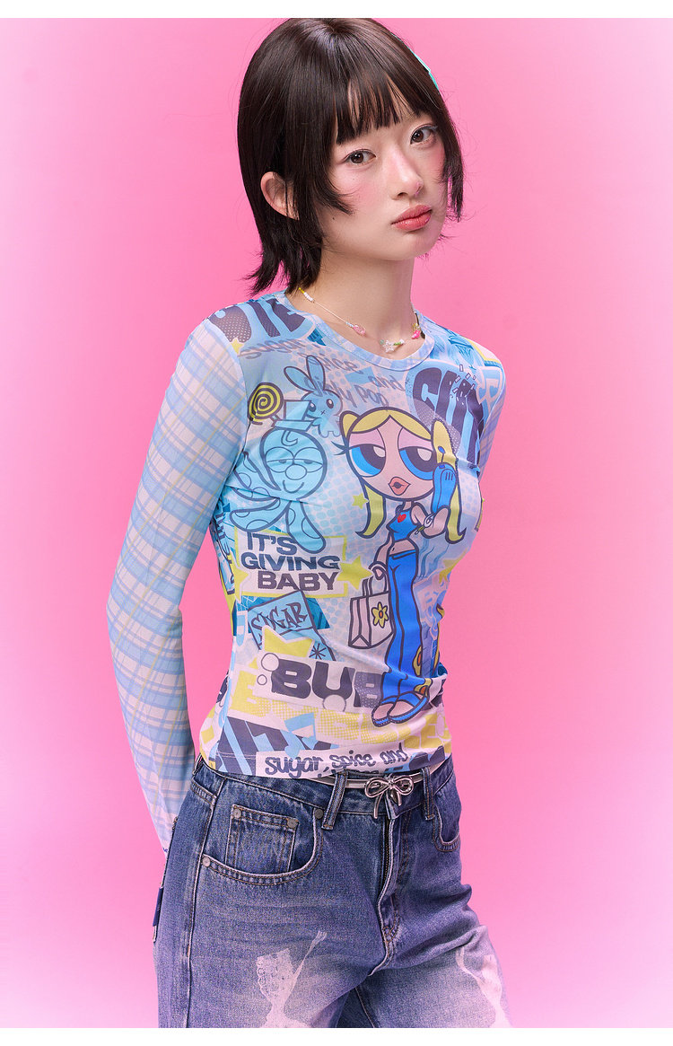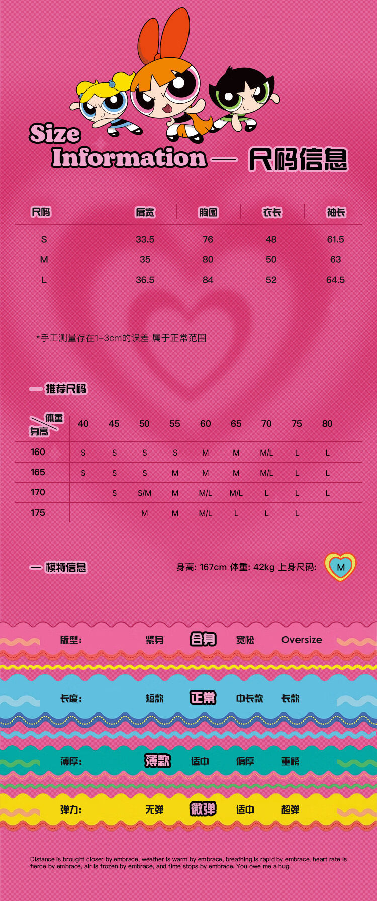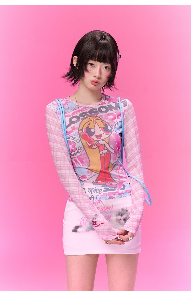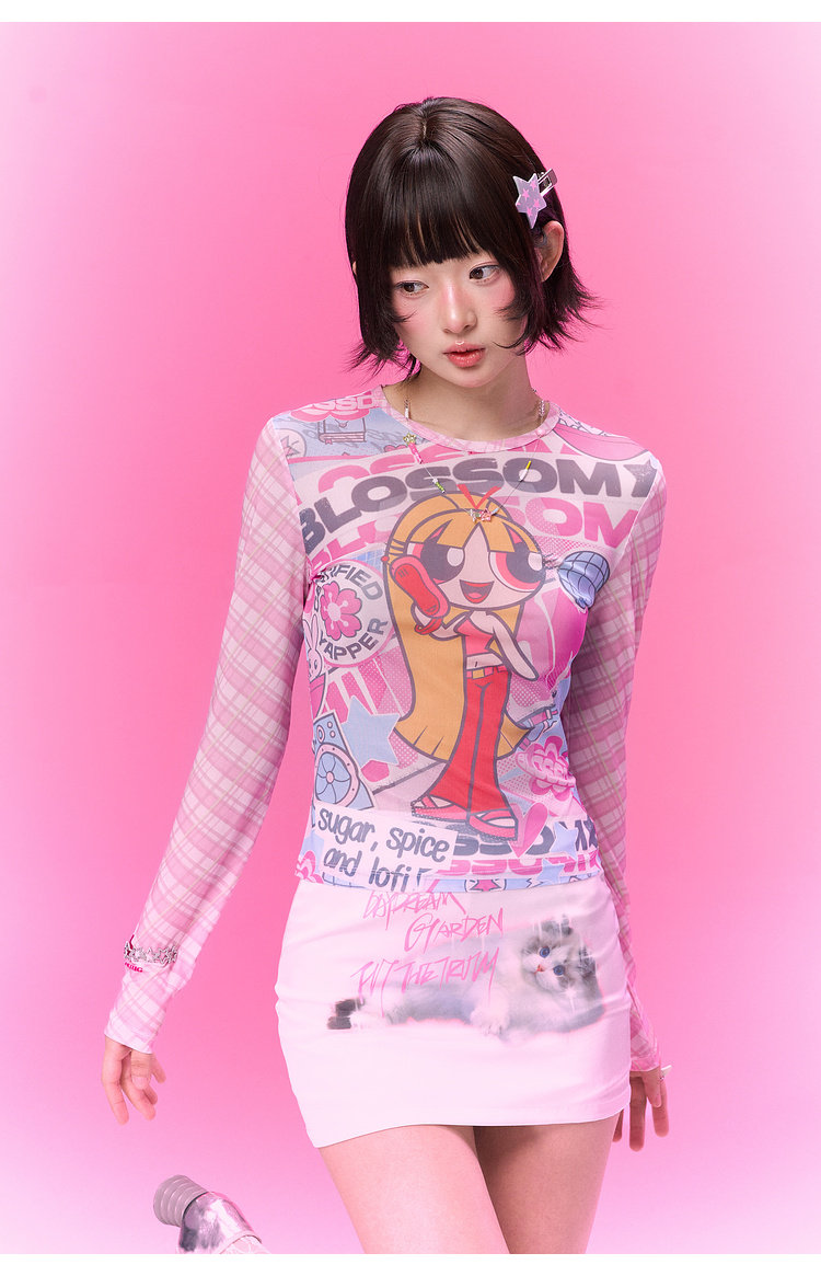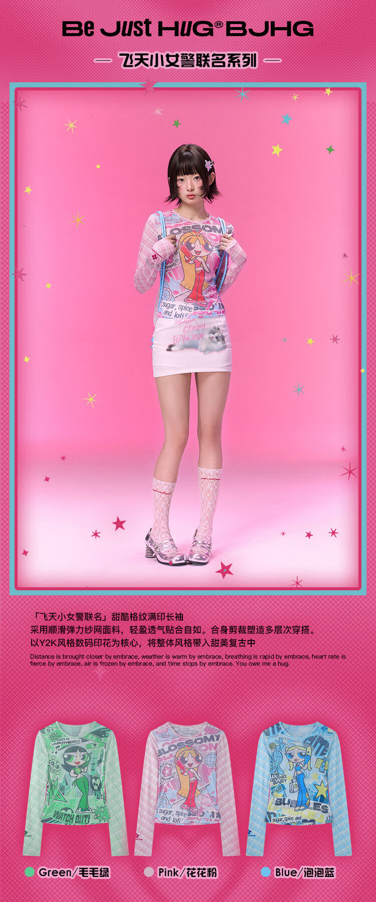 BJHG Powerpuff Girls co-branded reckless retro cartoon y2k long-sleeved T-shirt women's spring slim top Huahua-Pink L 130-160Jin Jin equals 0.5 kg