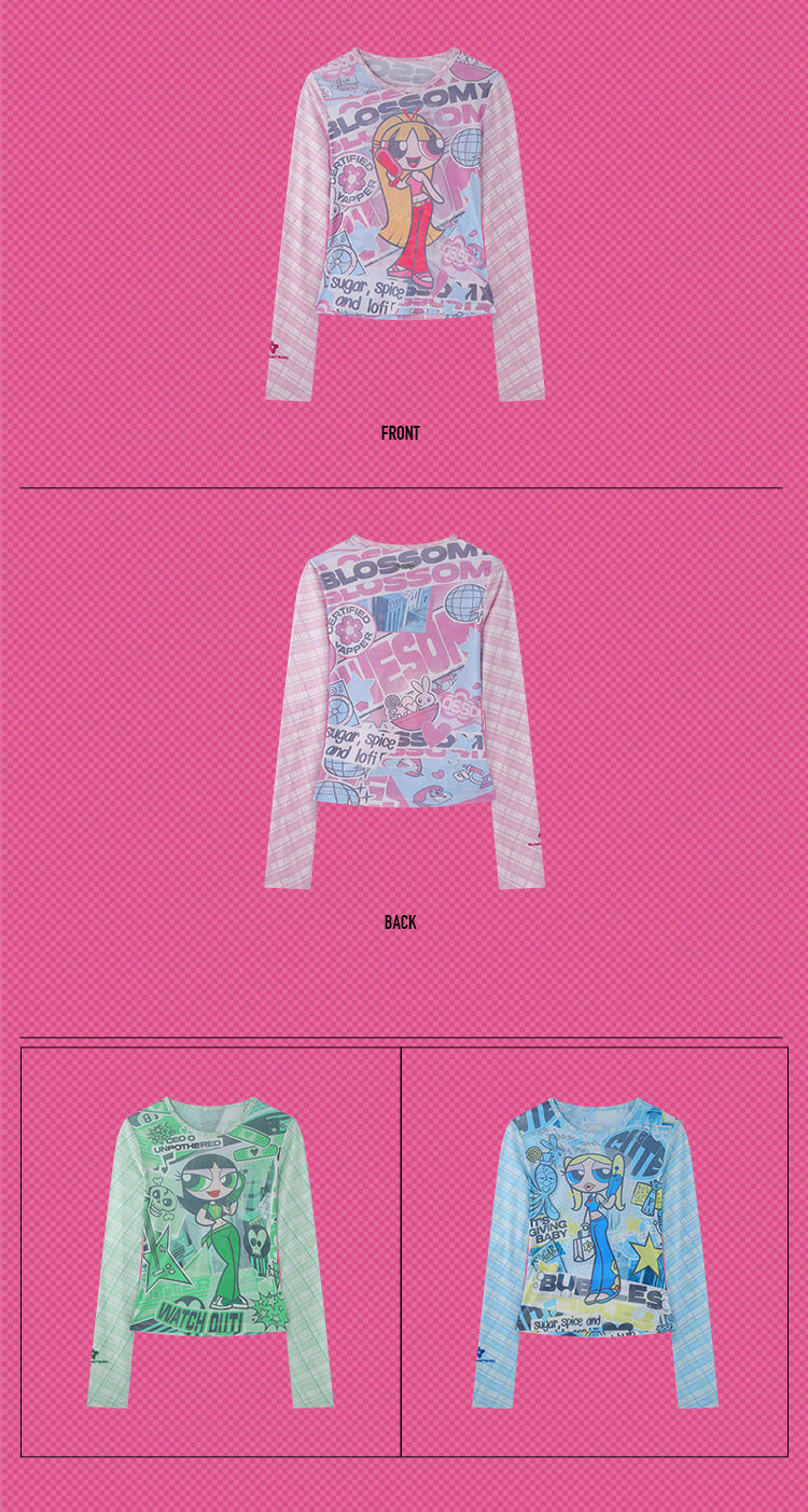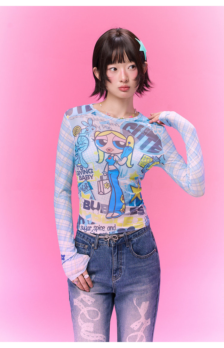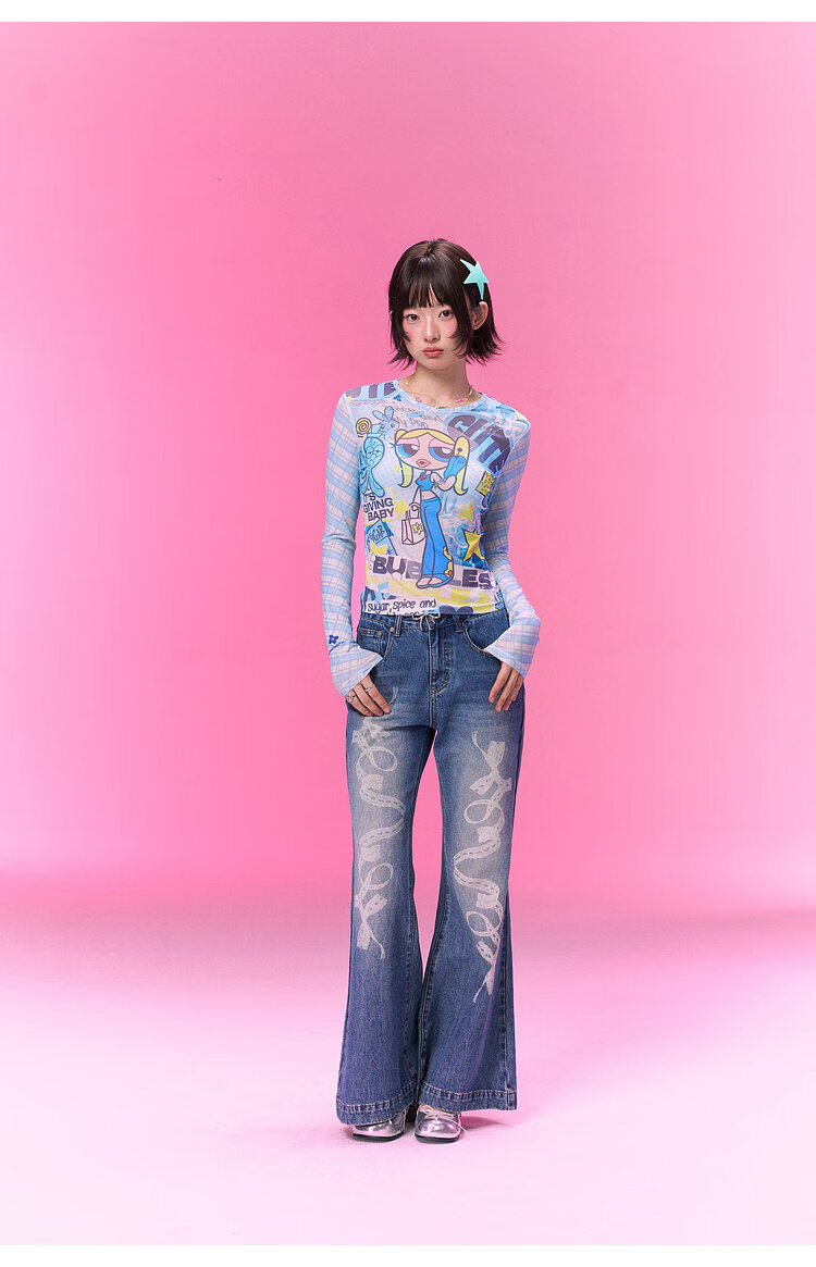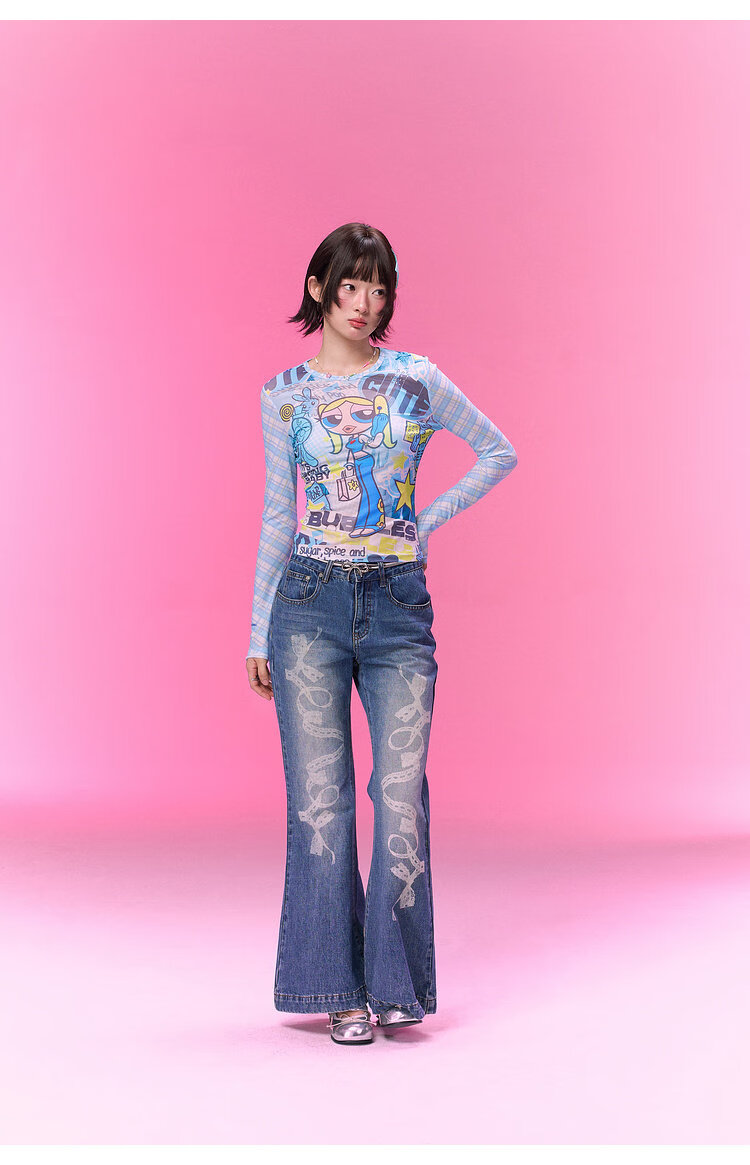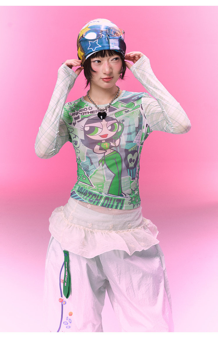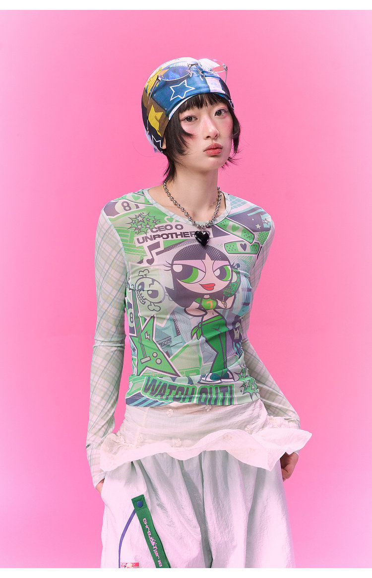 BJHG Powerpuff Girls co-branded reckless retro cartoon y2k long-sleeved T-shirt women's spring slim top Huahua-Pink L 130-160Jin Jin equals 0.5 kg