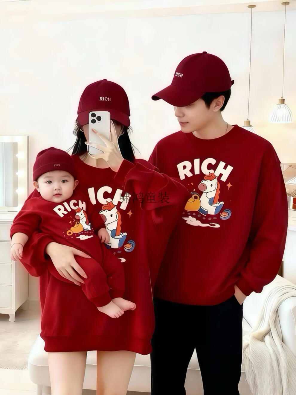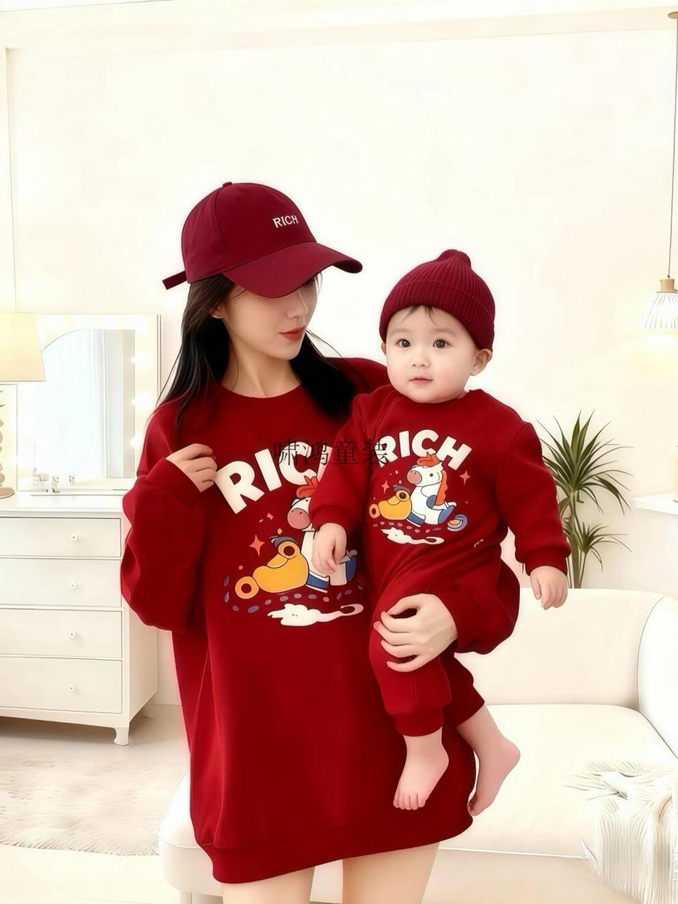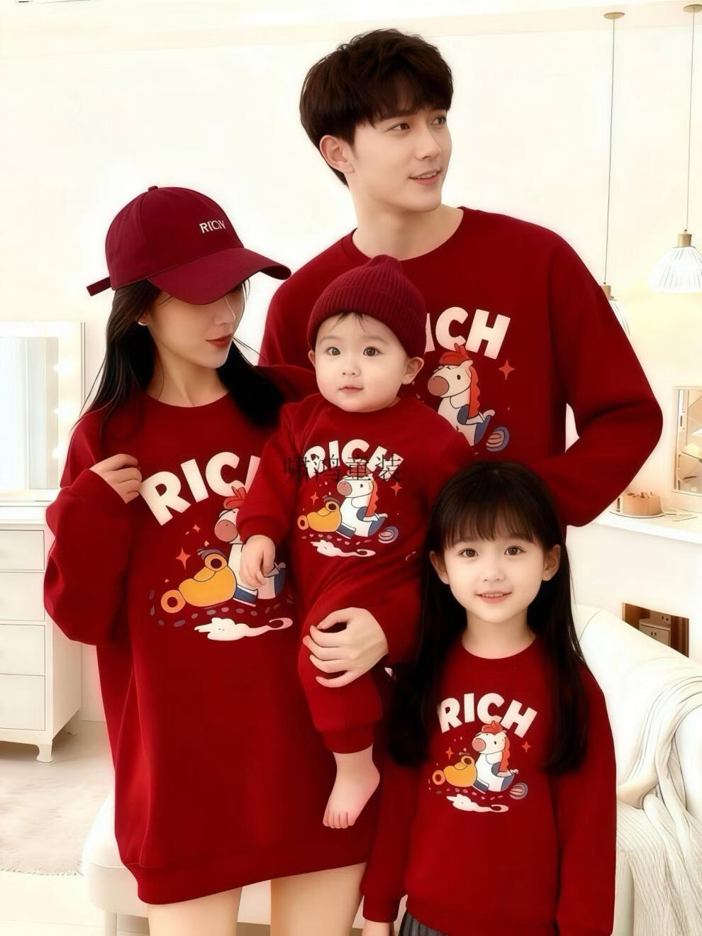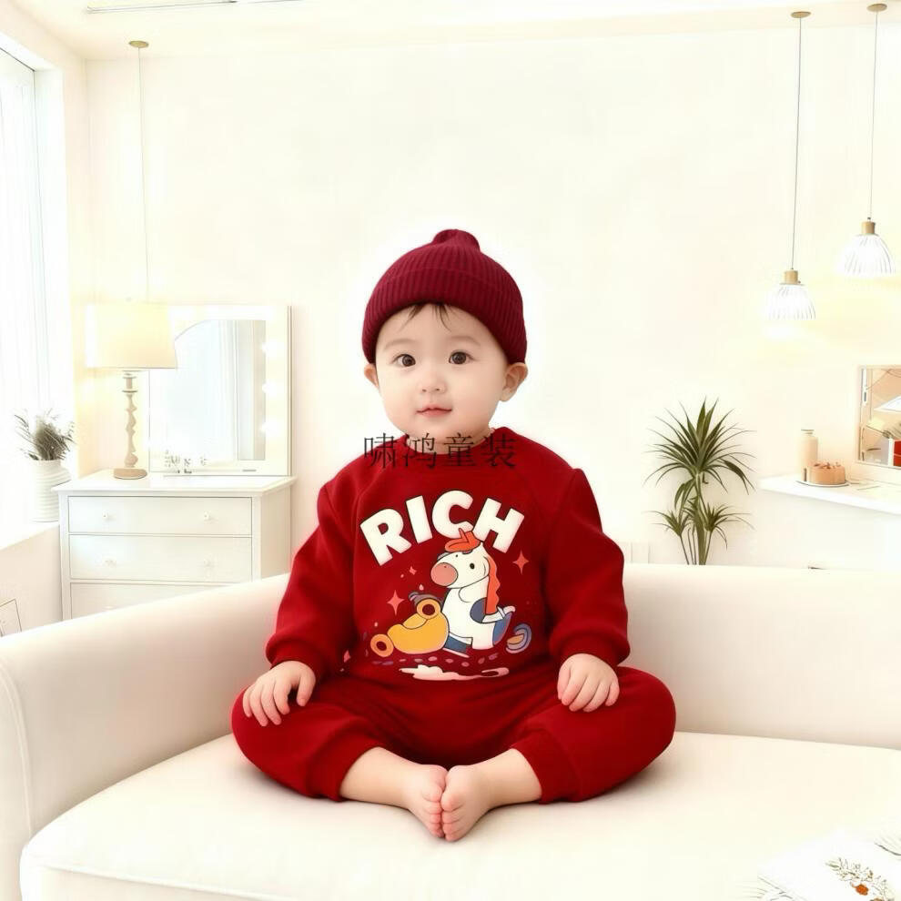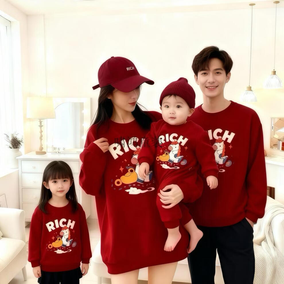 Wooden house small month old New Year's Year of the Horse parent-child outfit red sweatshirt plus velvet for a family of three or four animal year family outfit mother and daughter outfit without velvet wine red 90 cm children's clothing