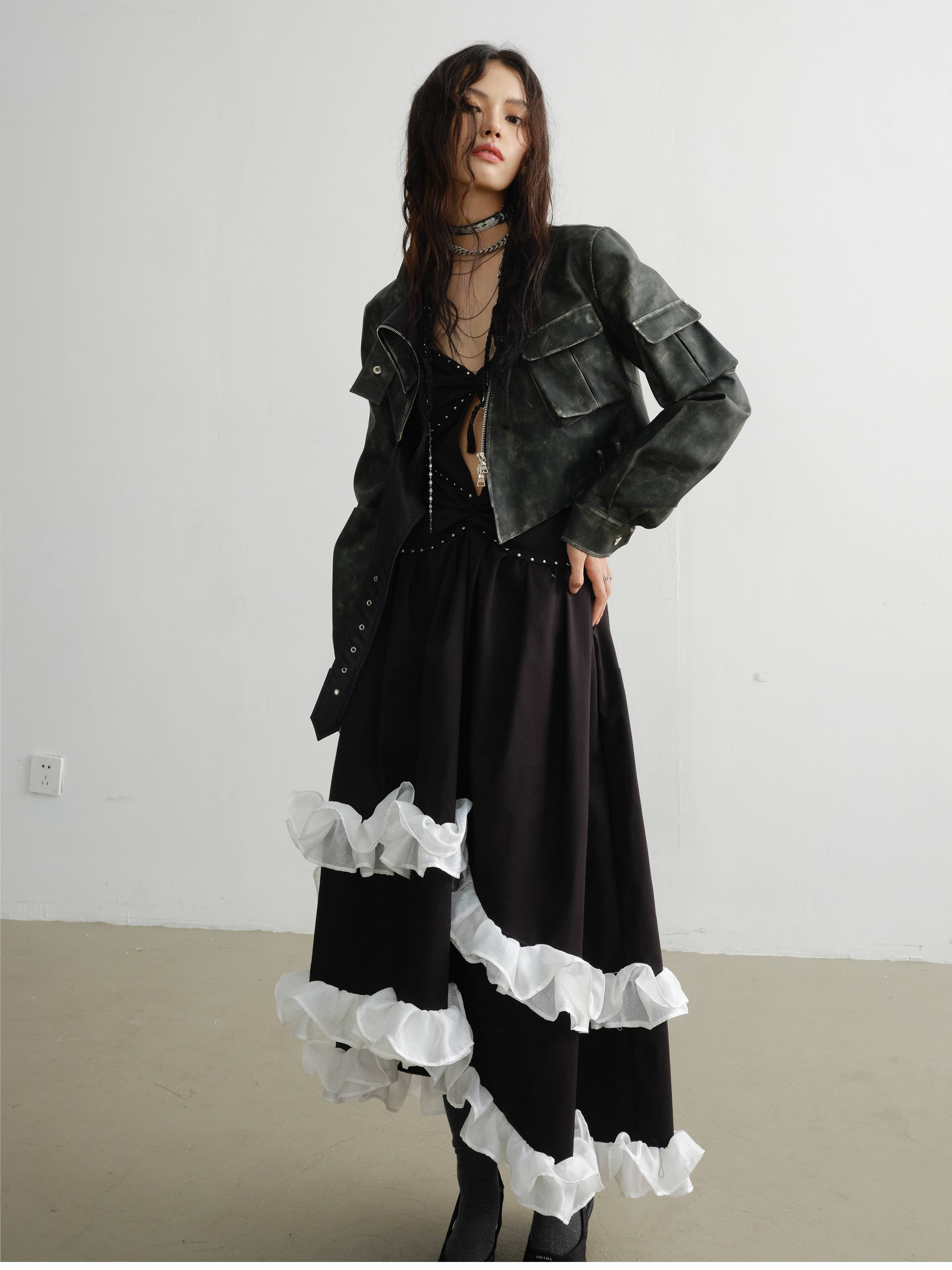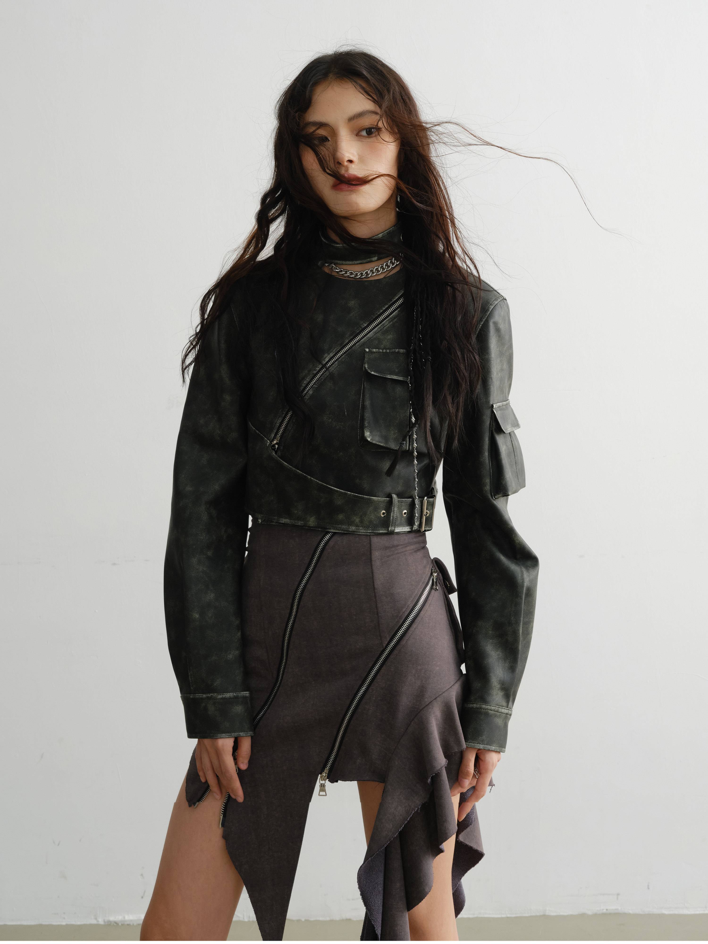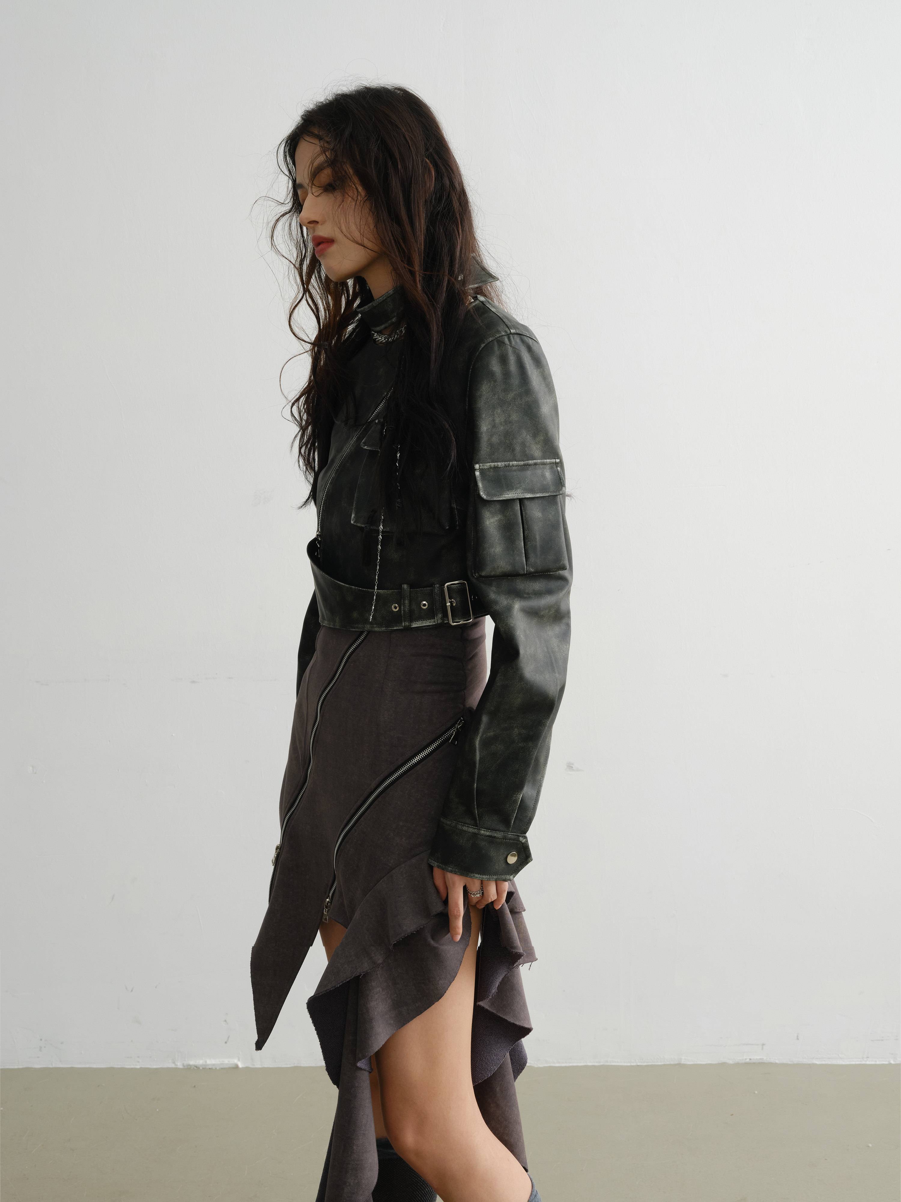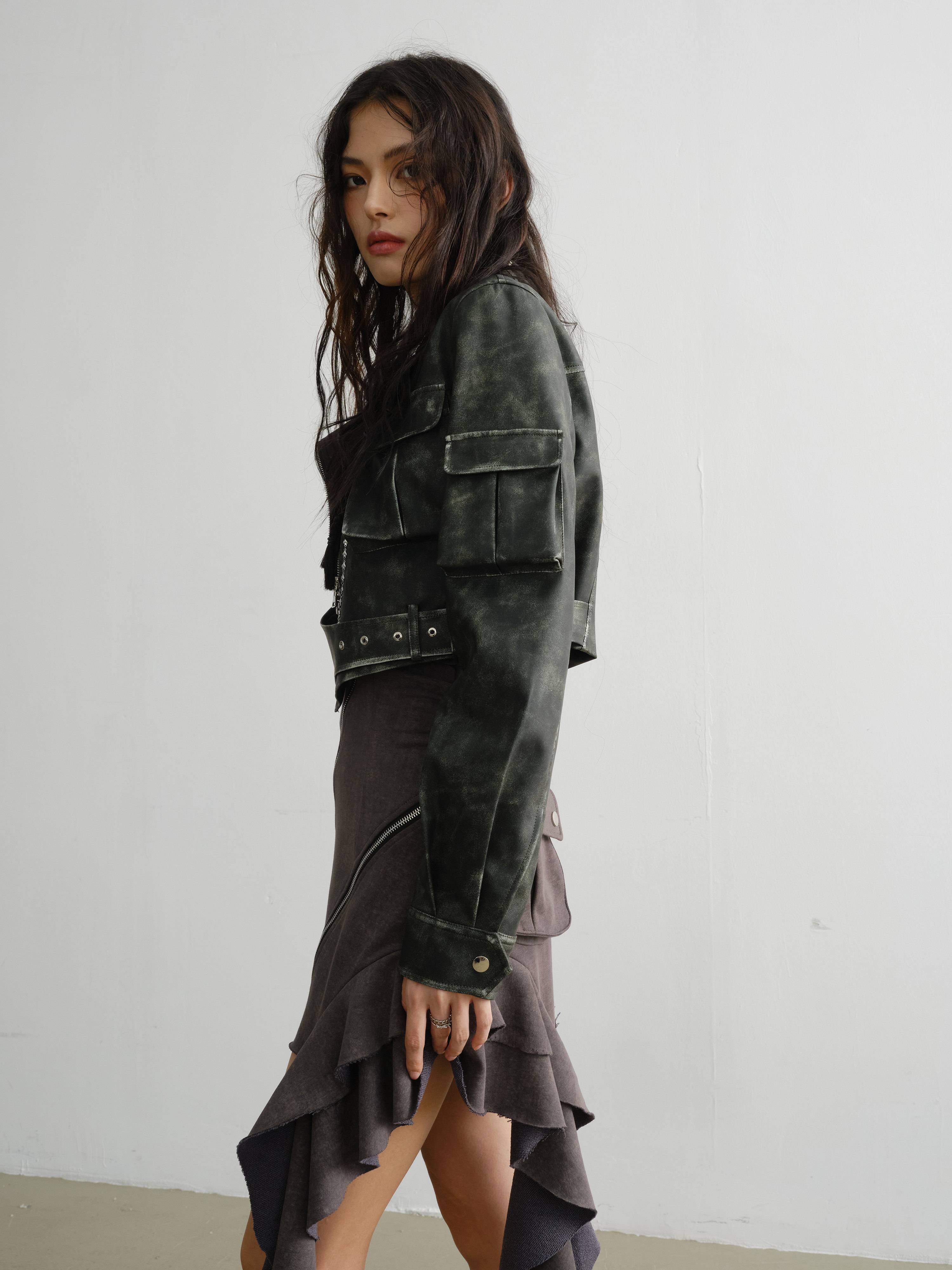 RAINNAN STUDIOS new season's new retro green cool motorcycle girl color rubbing process PU jacket green S