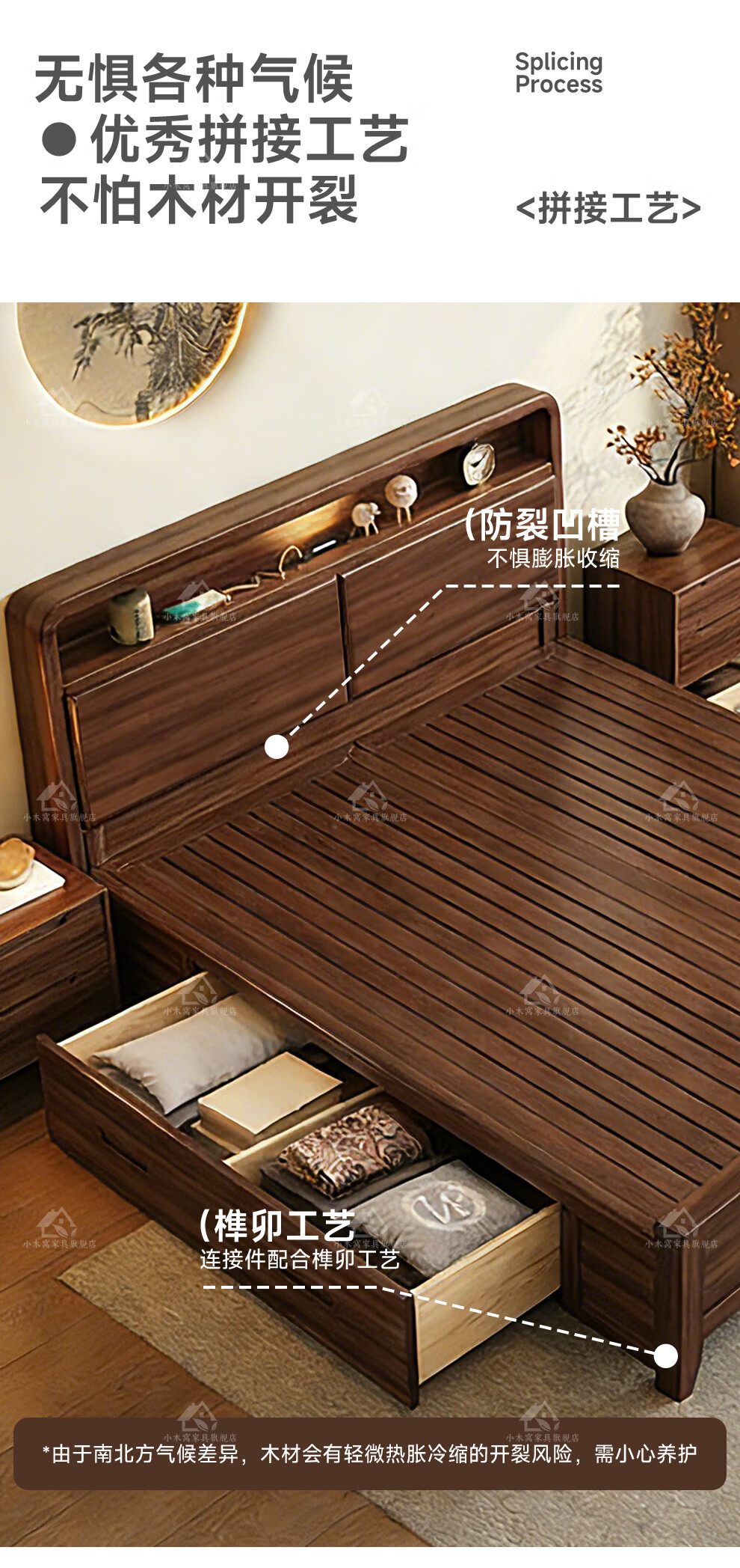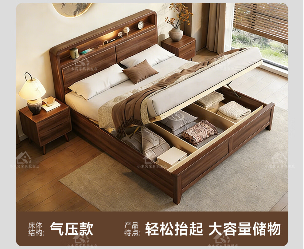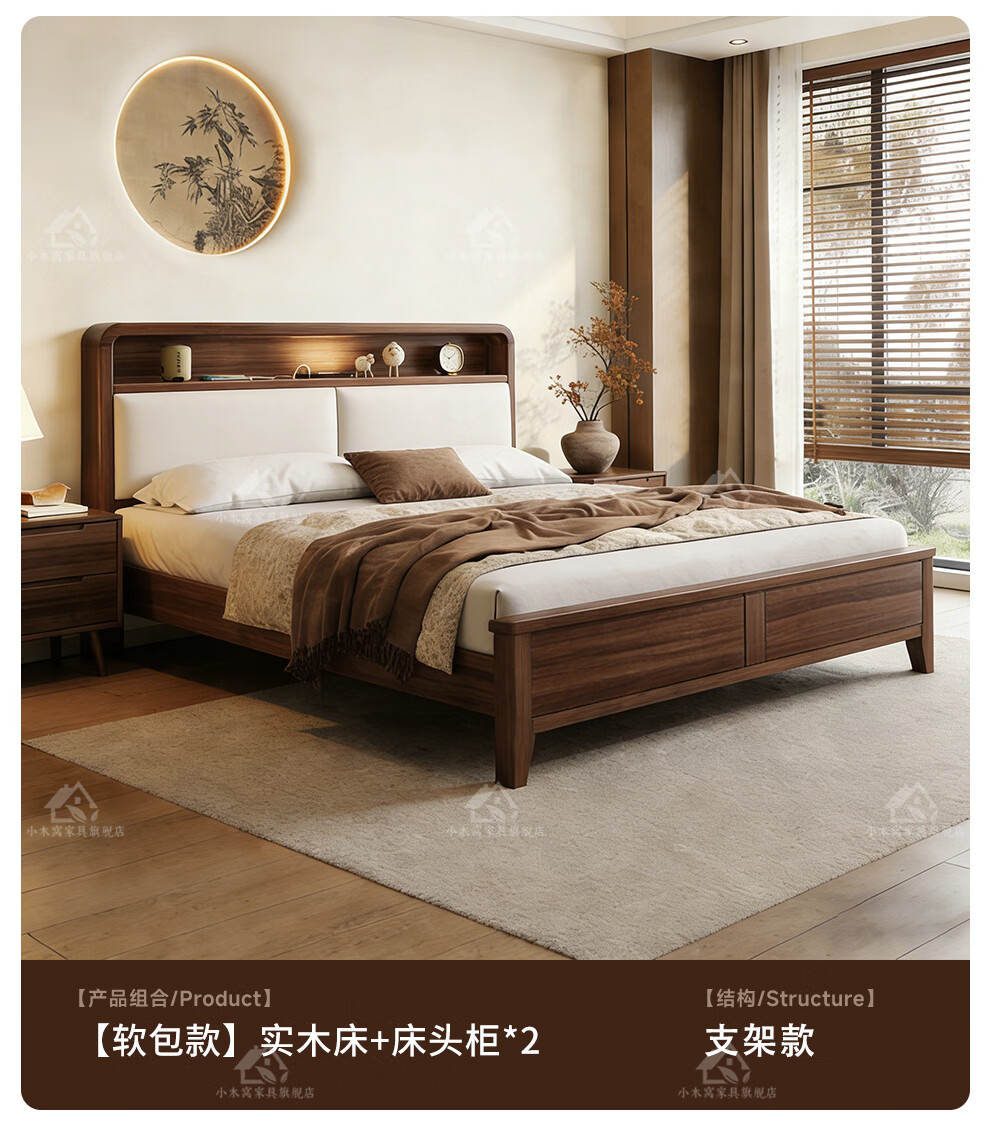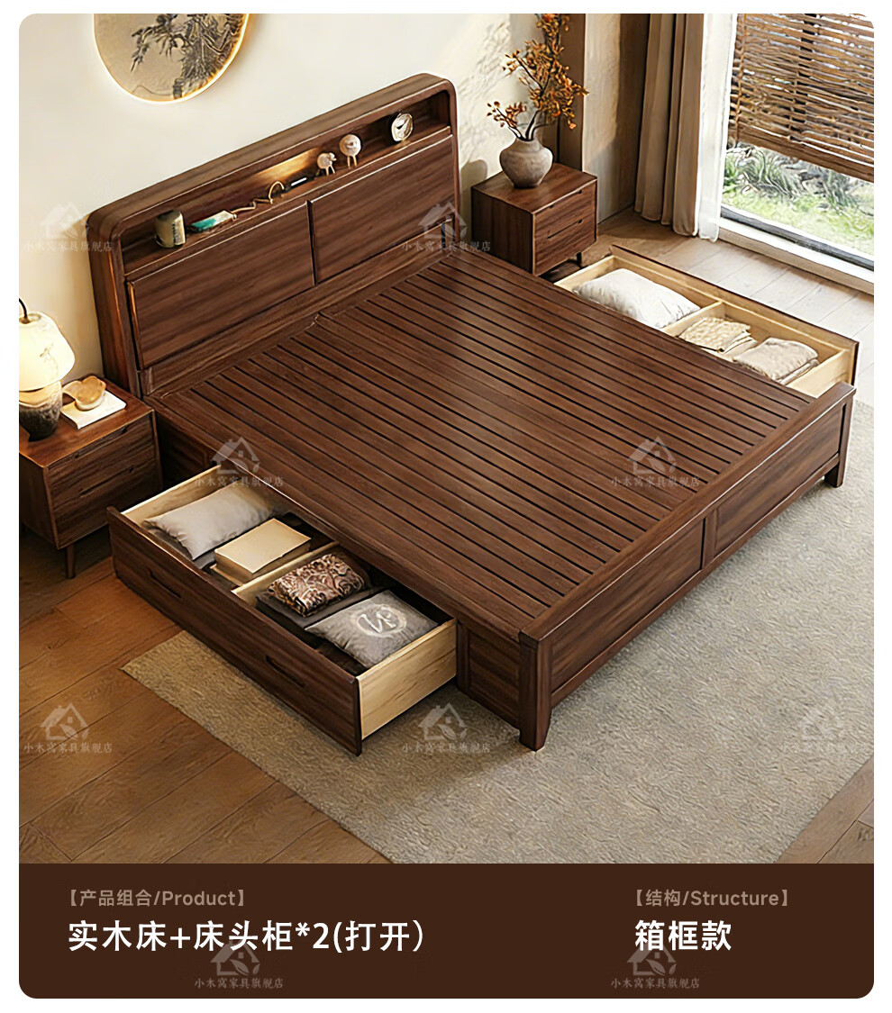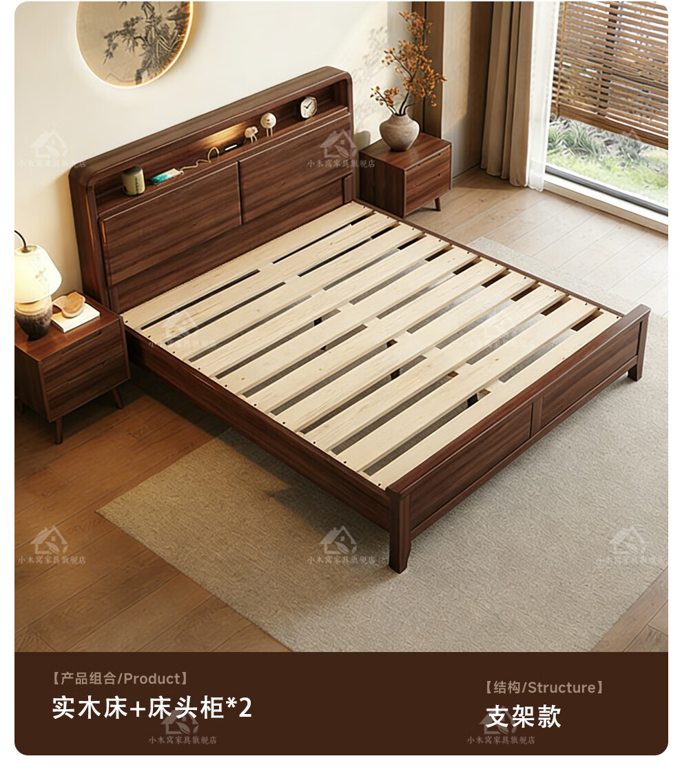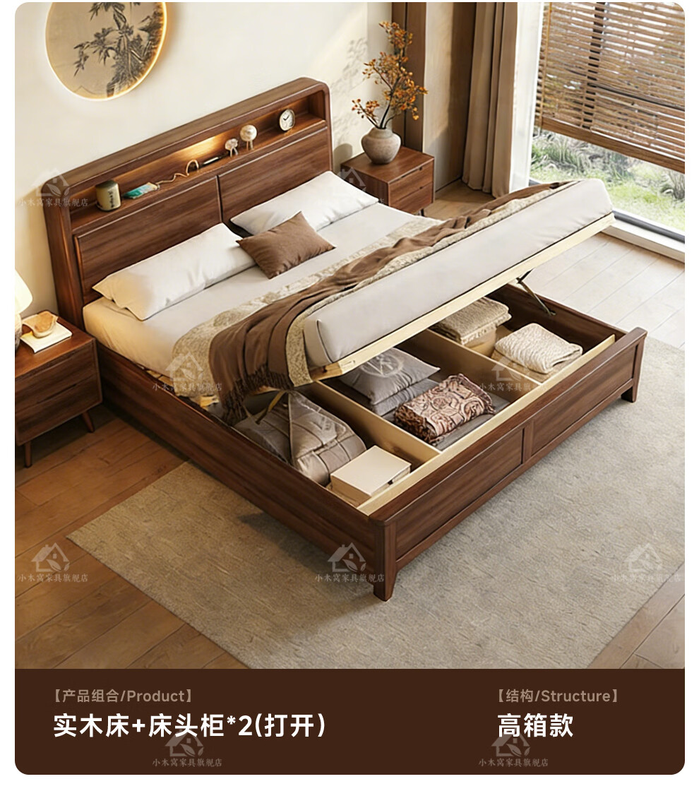 Small wooden nest solid wood bed black walnut mid-century style 1.8m double bed bedroom with light soft package bedside high box storage bed bed silent dovetail bed board 1200*2000 solid wood bedside with light and sub charging