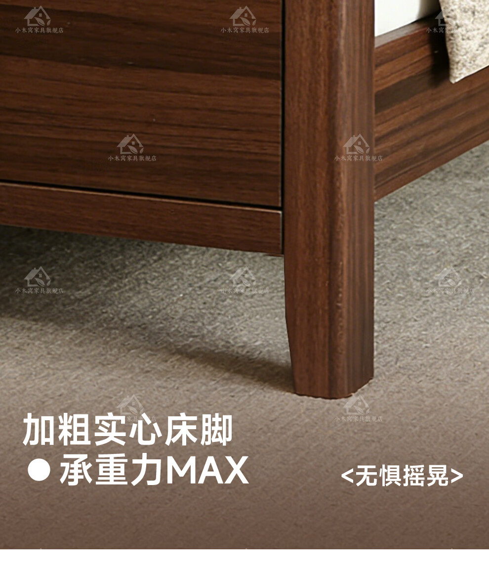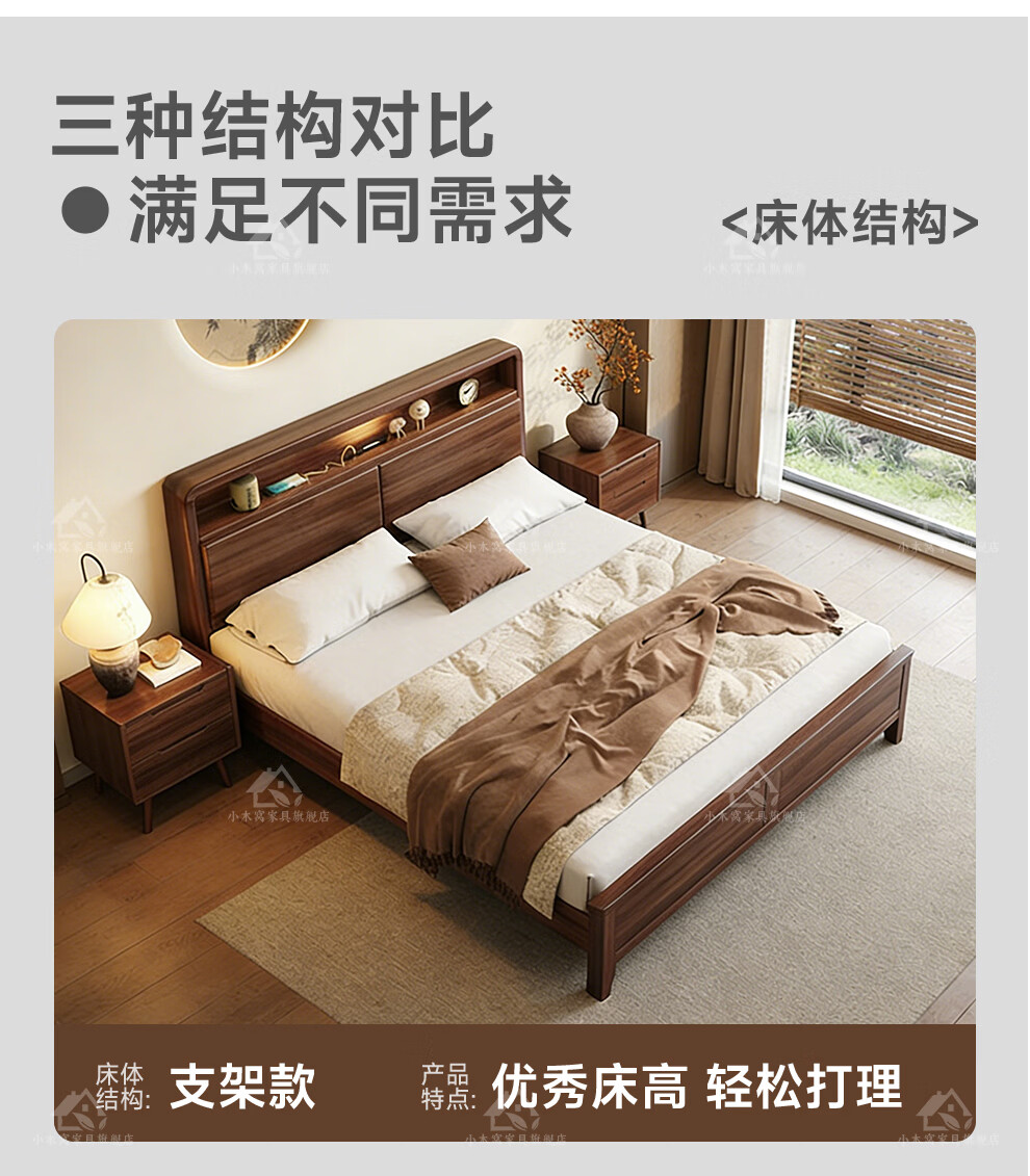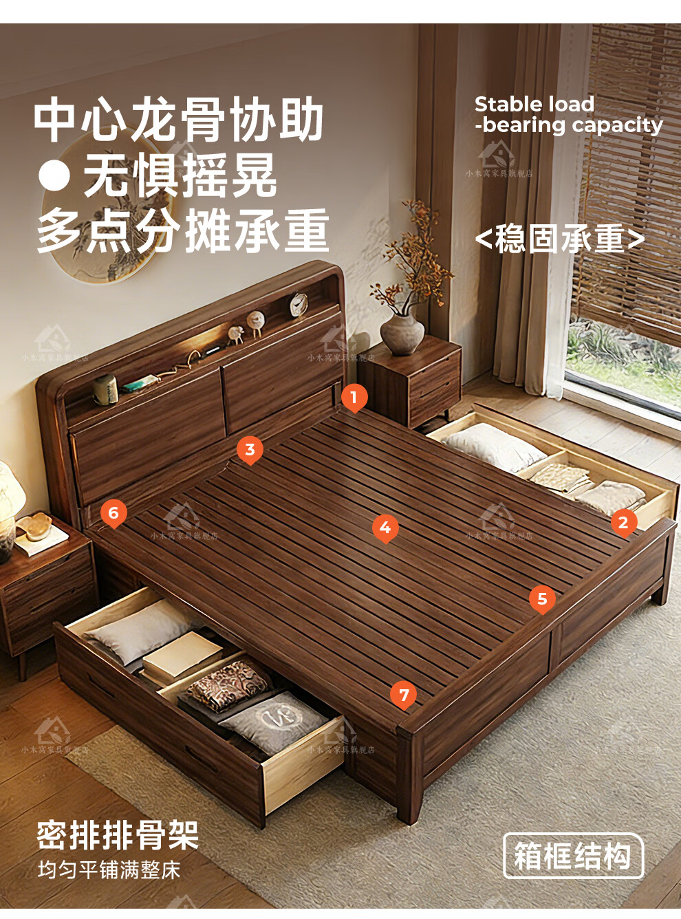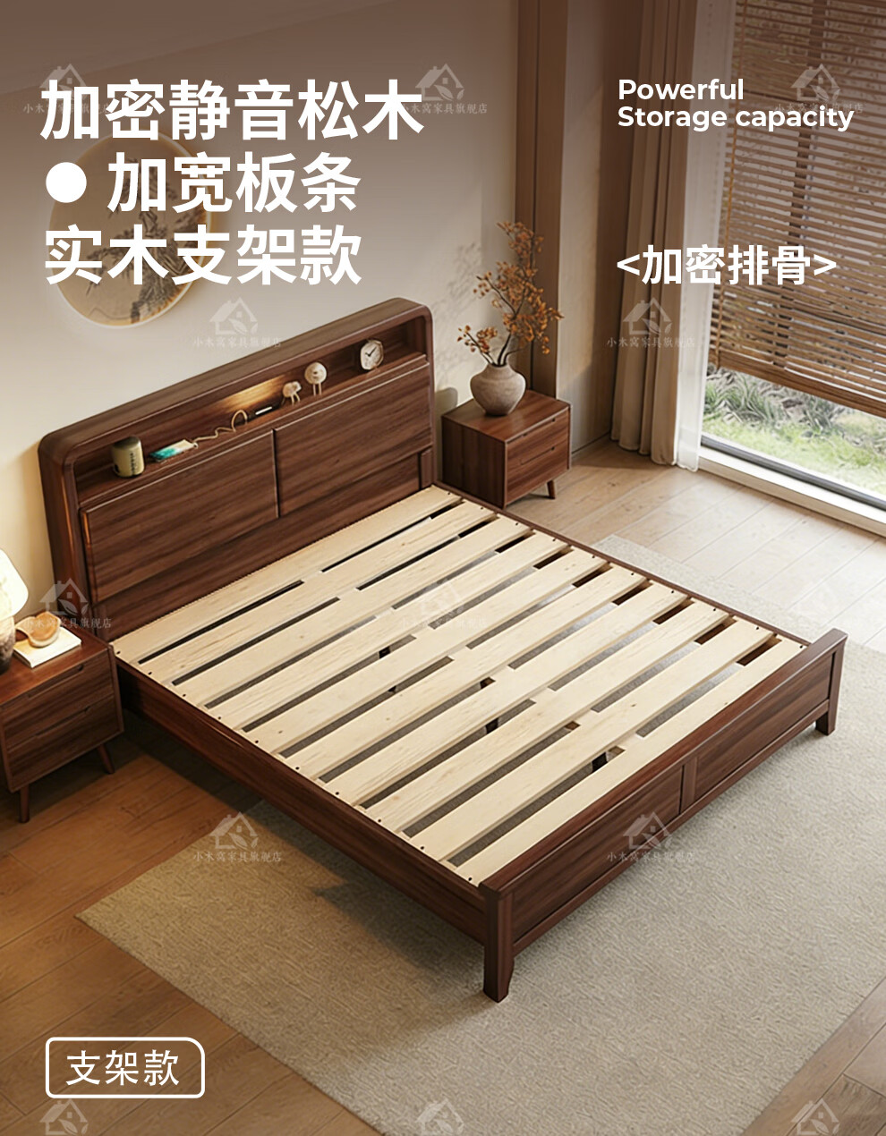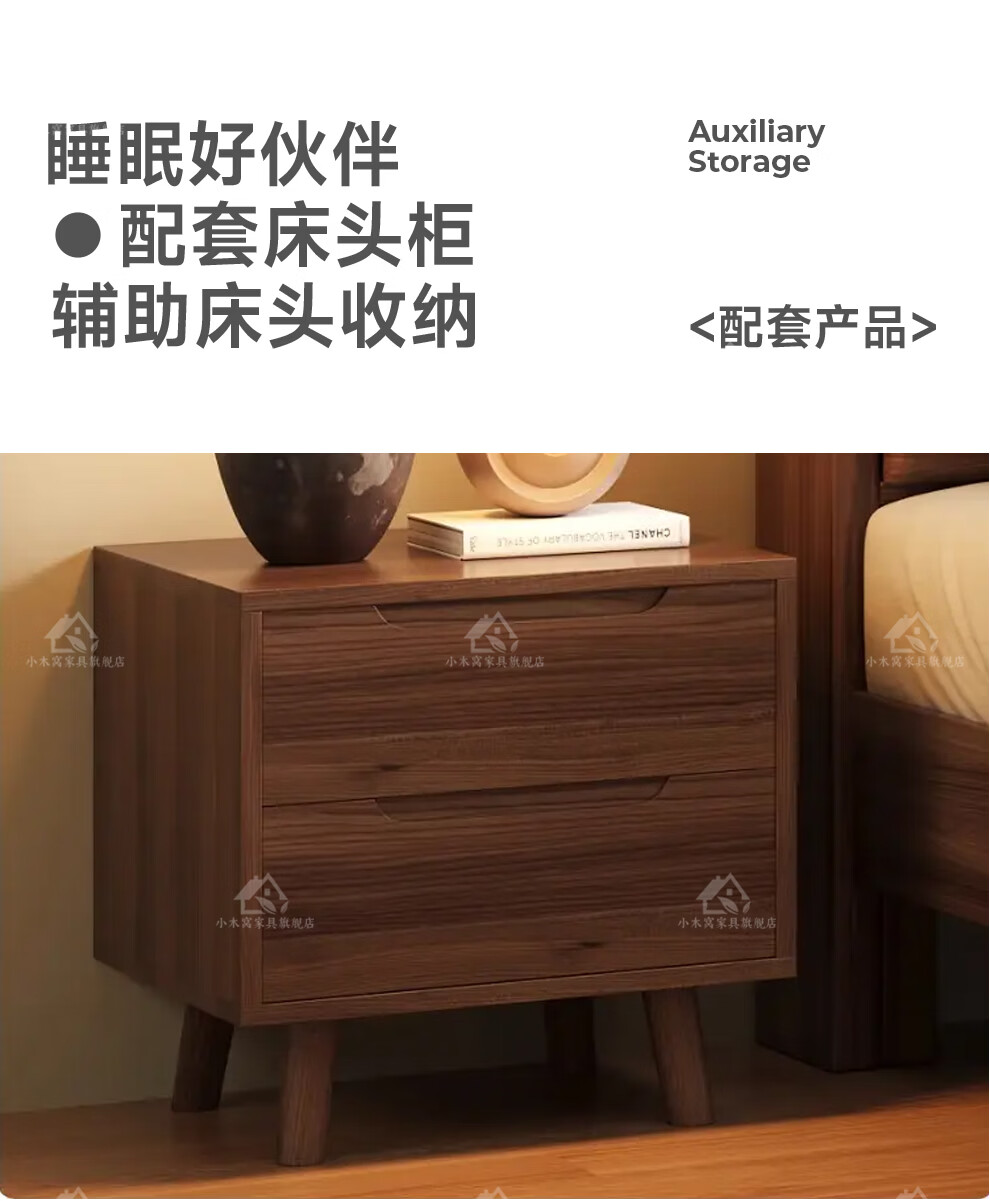 Small wooden nest solid wood bed black walnut mid-century style 1.8m double bed bedroom with light soft package bedside high box storage bed bed silent dovetail bed board 1200*2000 solid wood bedside with light and sub charging