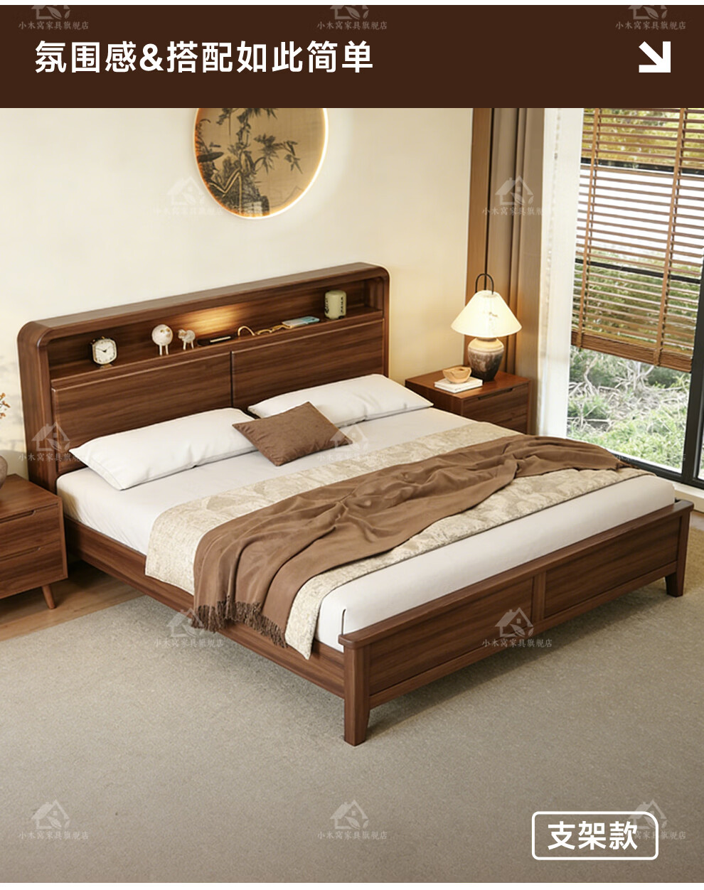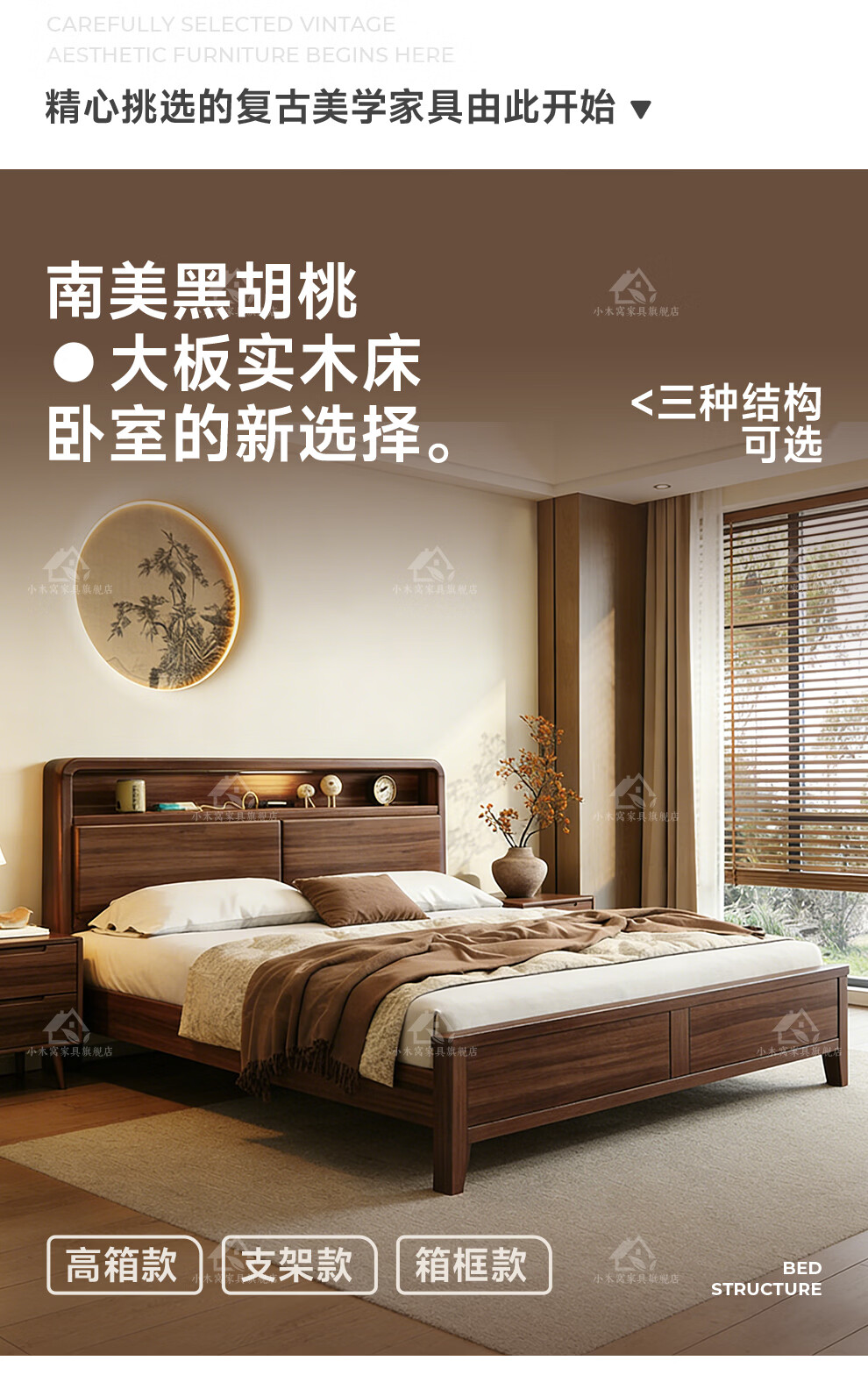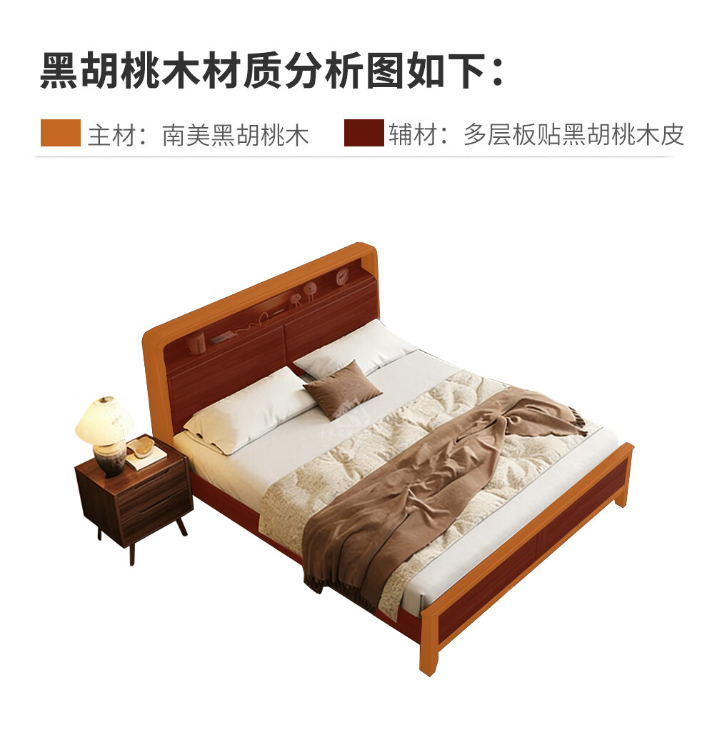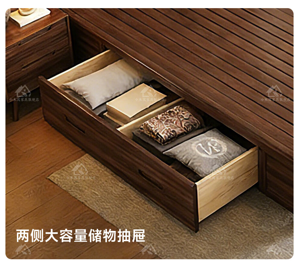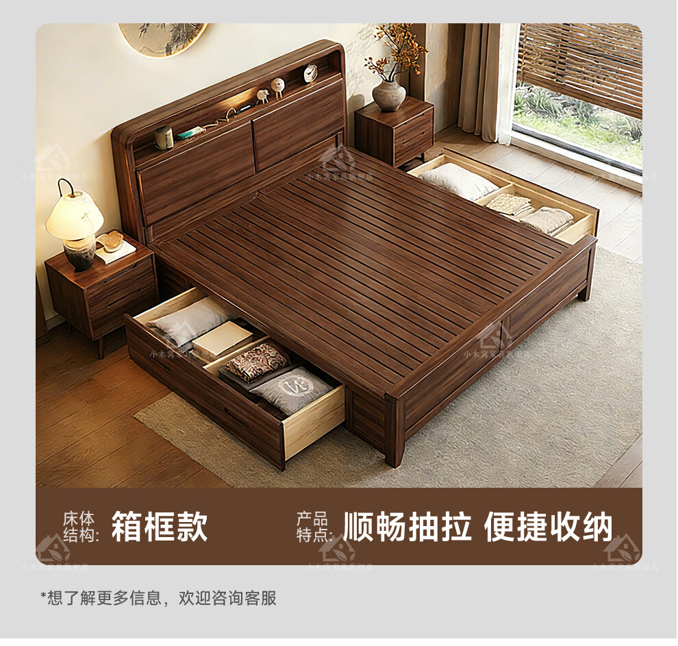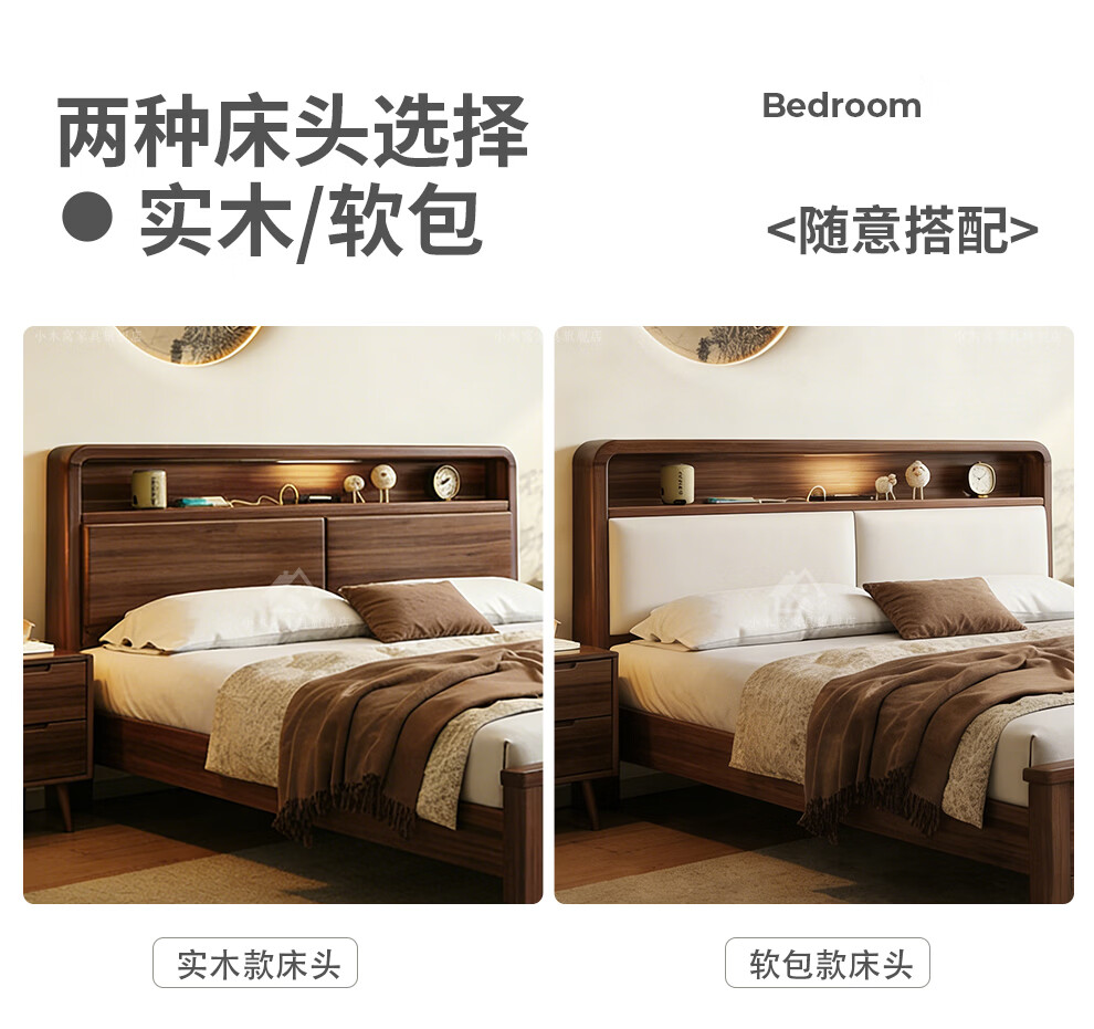 Small wooden nest solid wood bed black walnut mid-century style 1.8m double bed bedroom with light soft package bedside high box storage bed bed silent dovetail bed board 1200*2000 solid wood bedside with light and sub charging