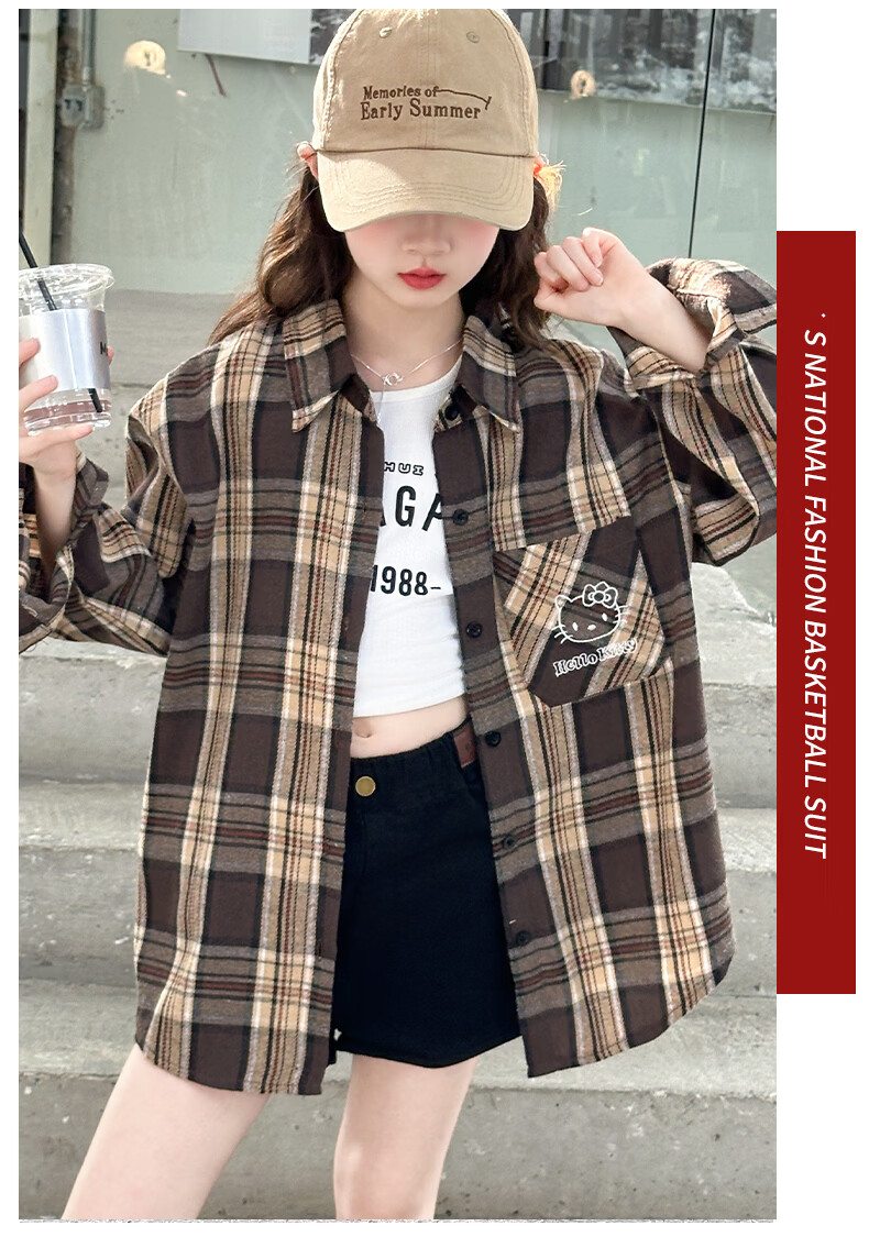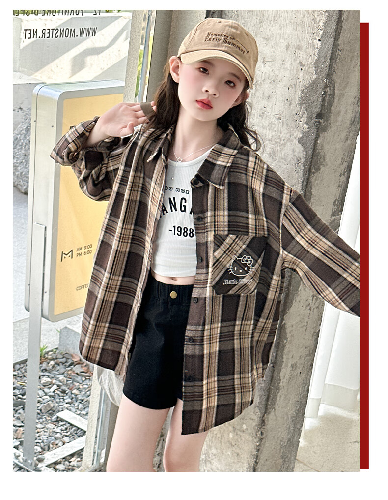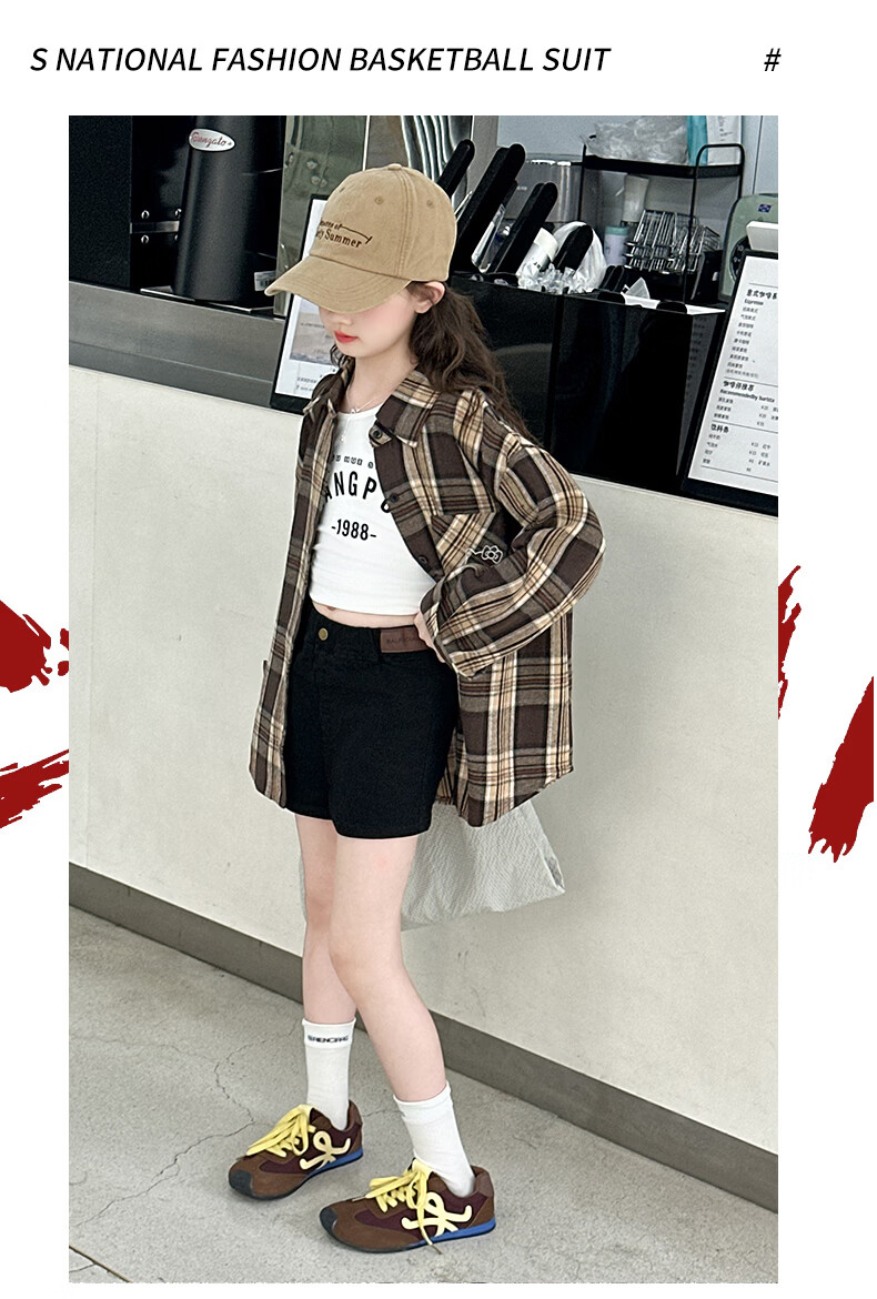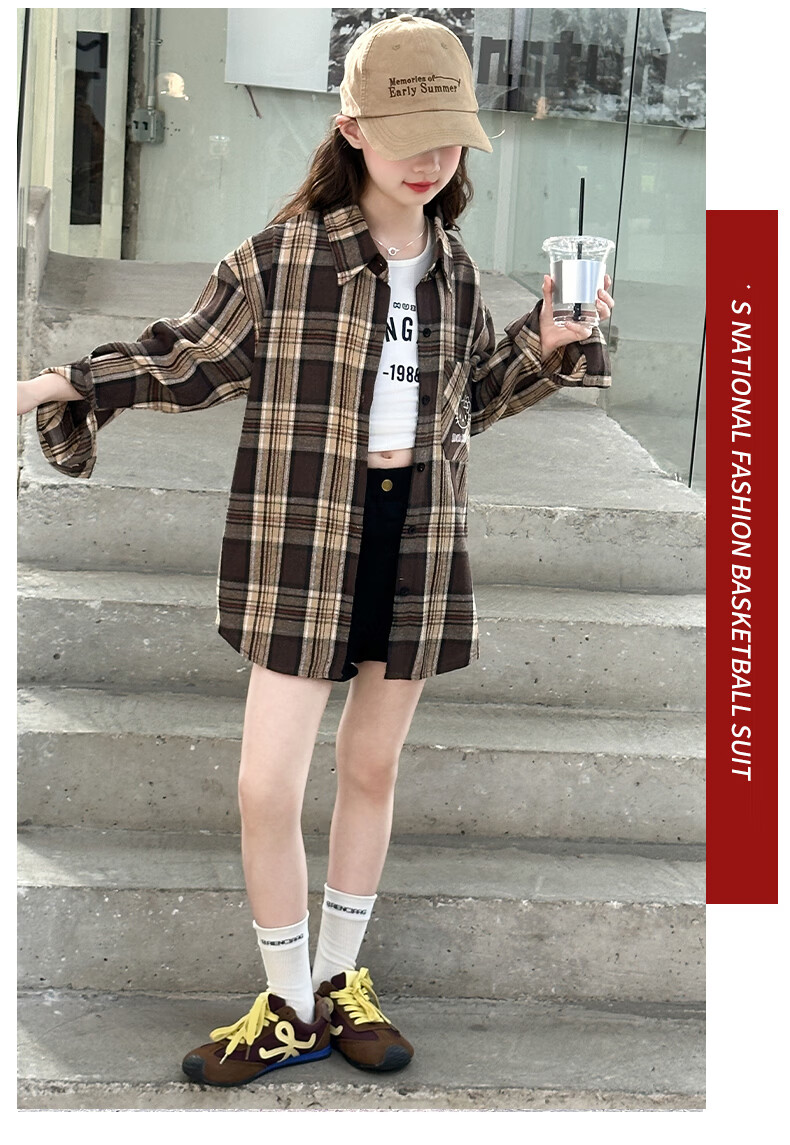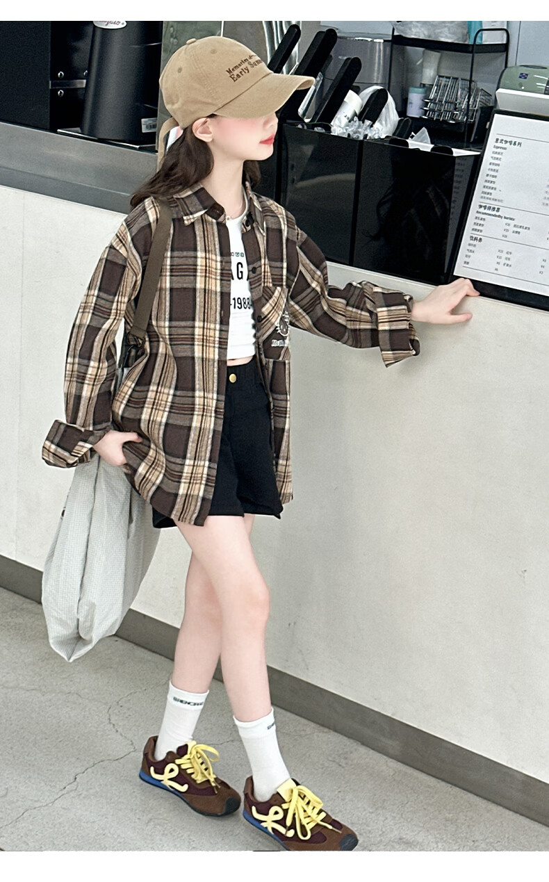 Girls Autumn Plaid Shirt 2025 New Style Casual Big Children Spring and Autumn Korean Style Shirt Loose Jacket Brown 170