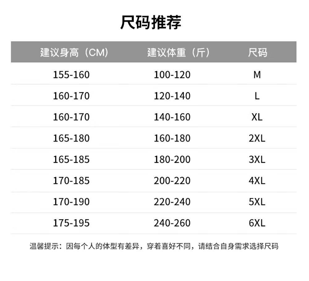 China (cm) 165 / 88-90 170 / 96-98 175 / 108-110 180 / 118-122 185 / 126-130
