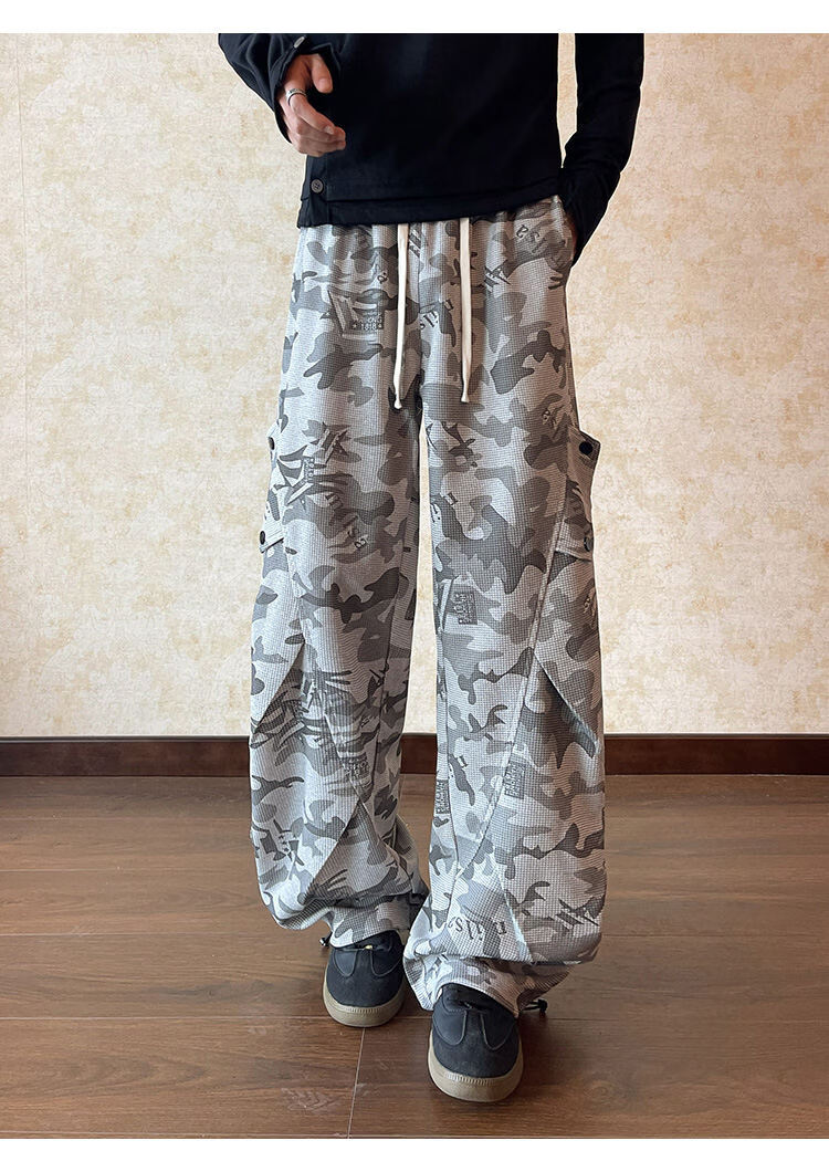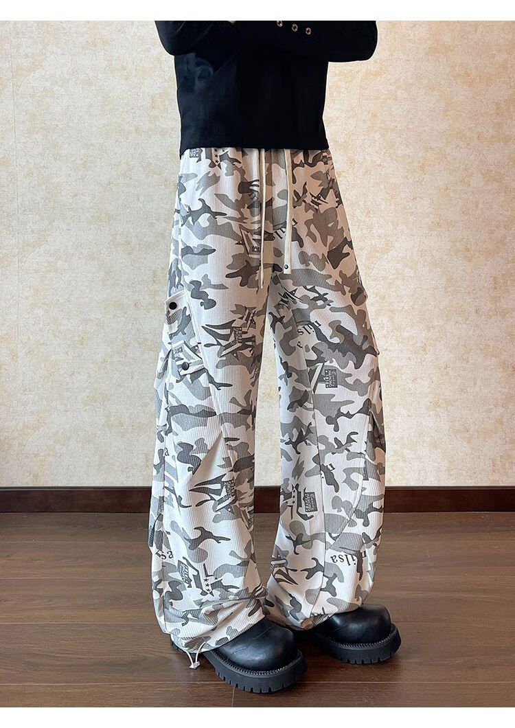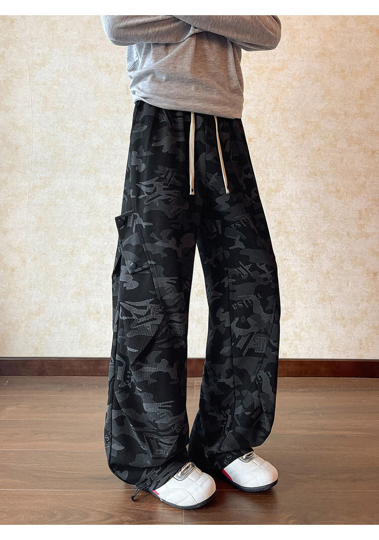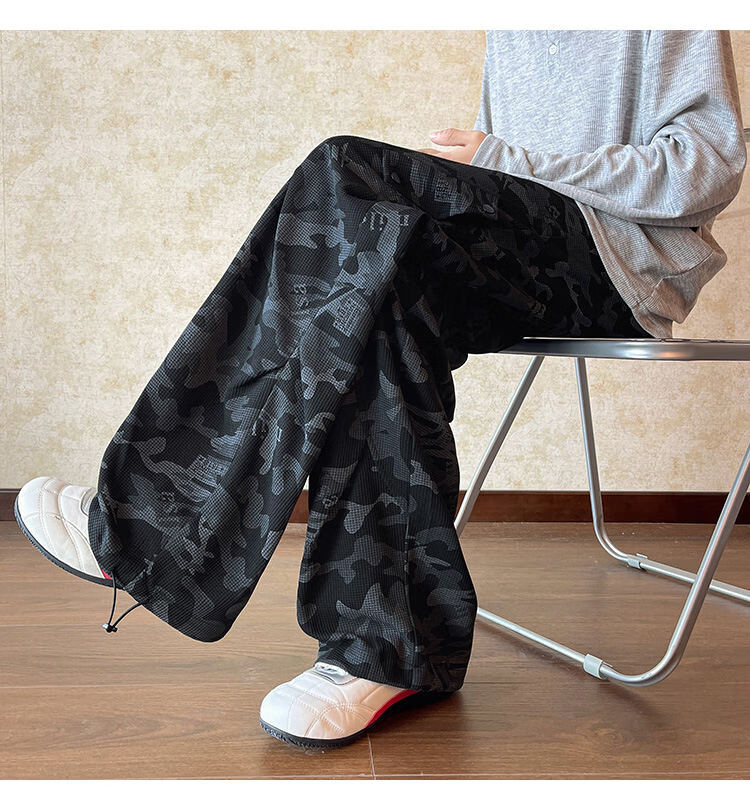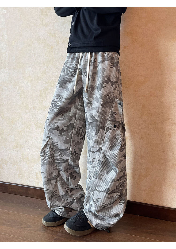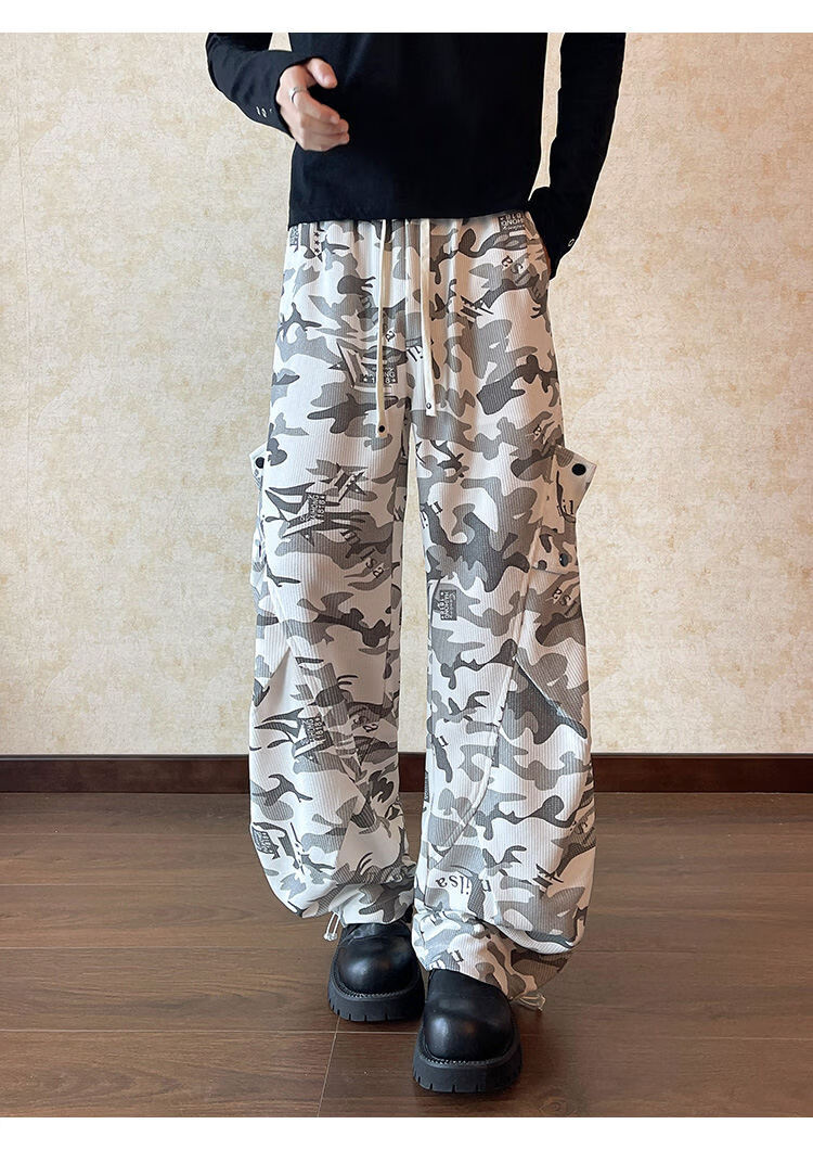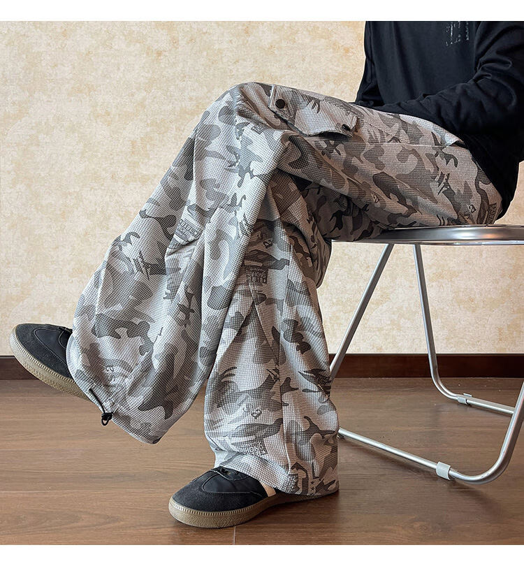 Playboy (PLAYBOY) American high street pleated casual pants for men in spring, plus size, trendy fat people, loose drawstring straight wide leg camouflage pants, gray M