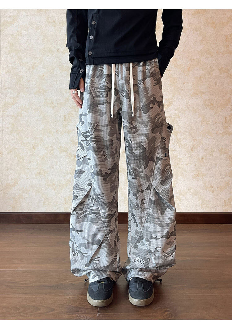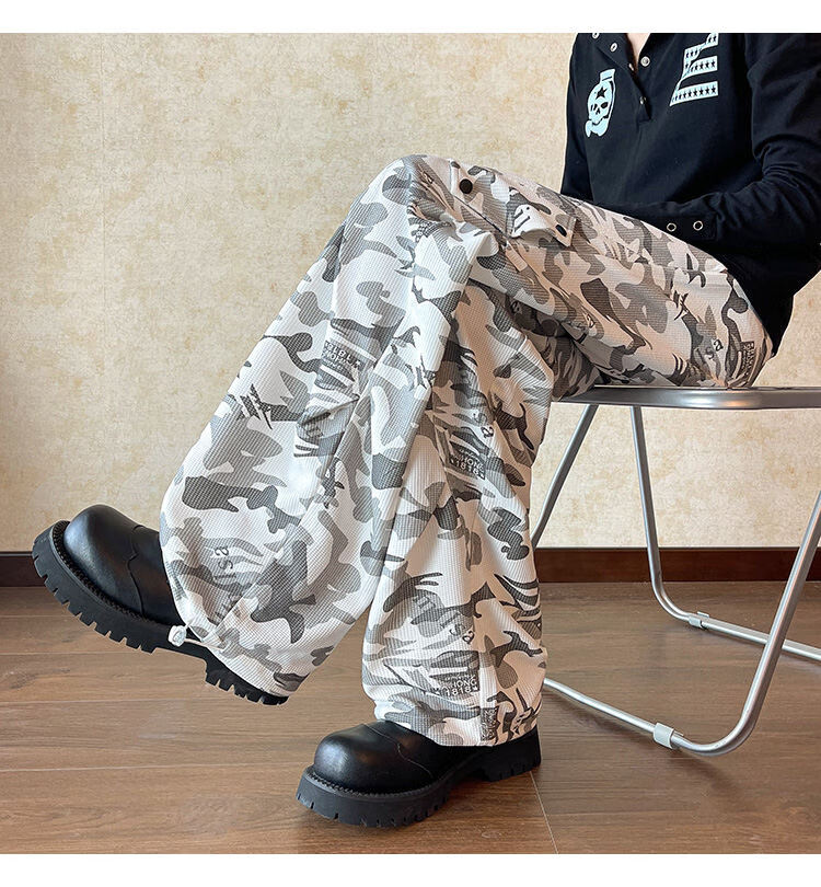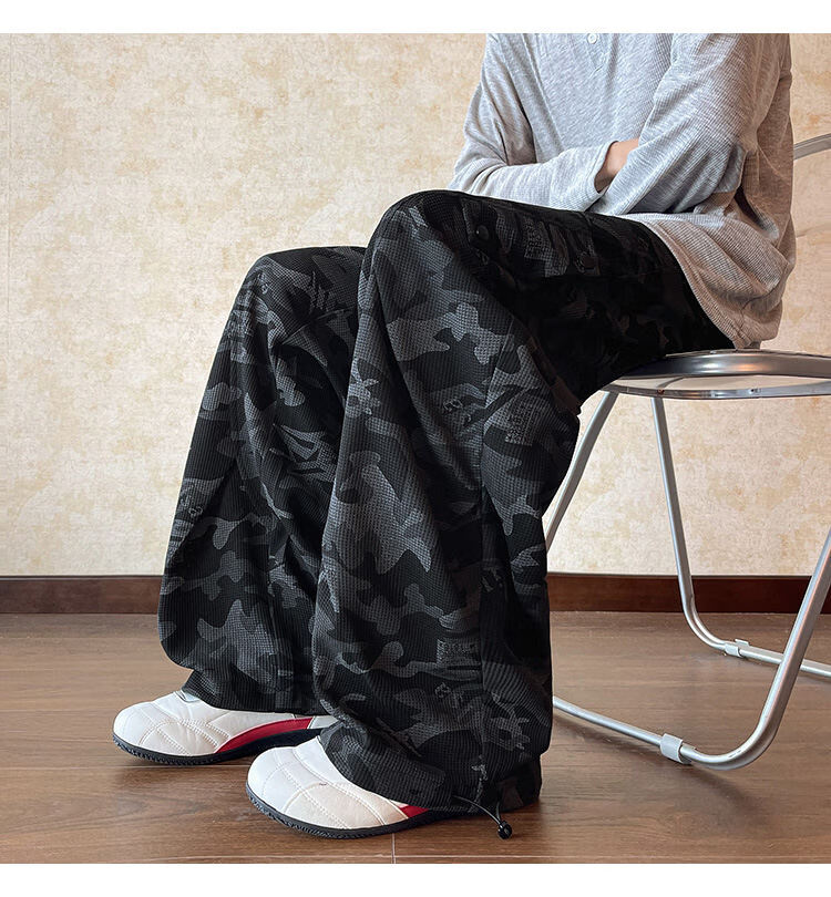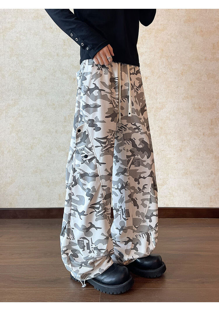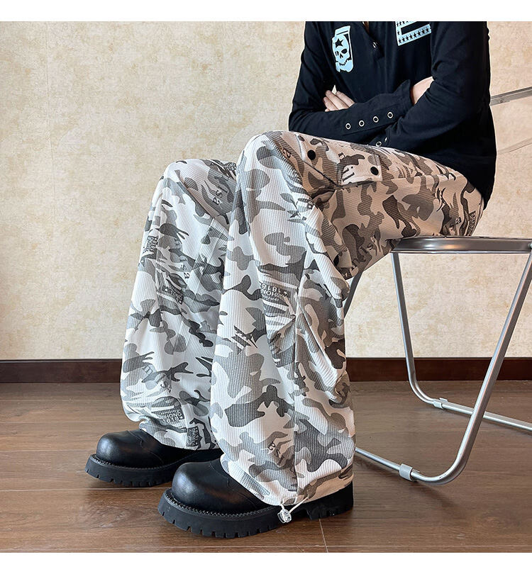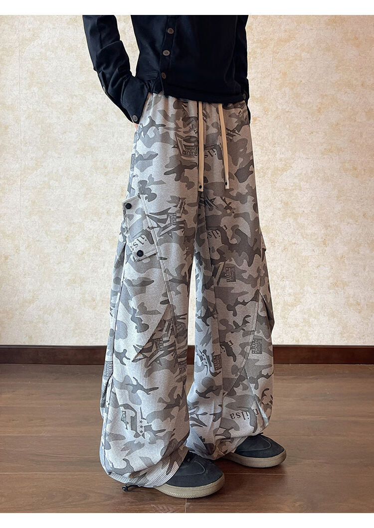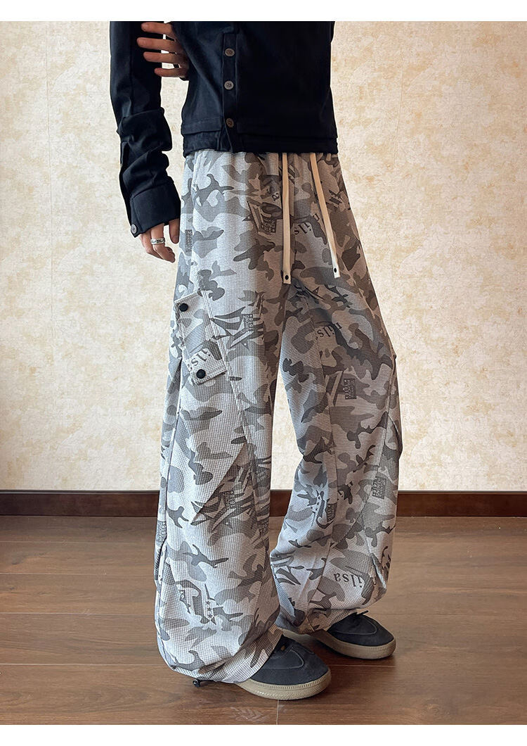 Playboy (PLAYBOY) American high street pleated casual pants for men in spring, plus size, trendy fat people, loose drawstring straight wide leg camouflage pants, gray M