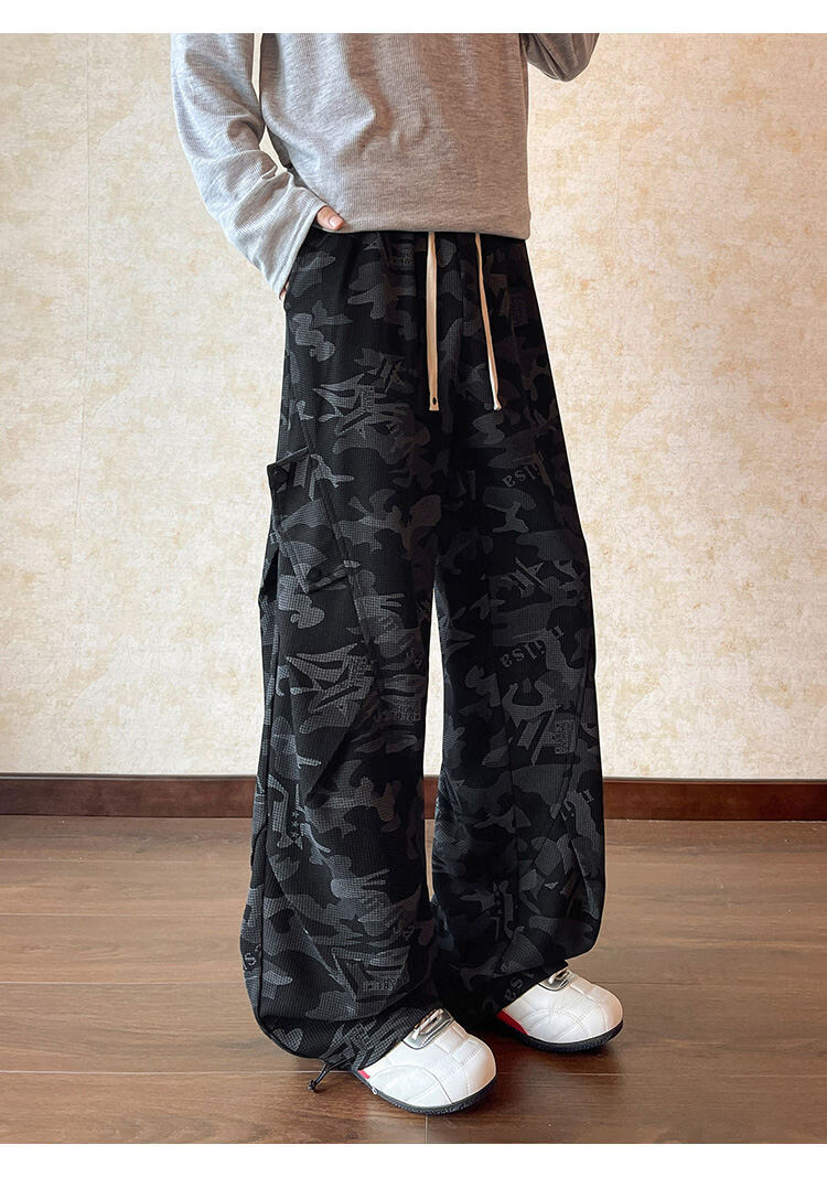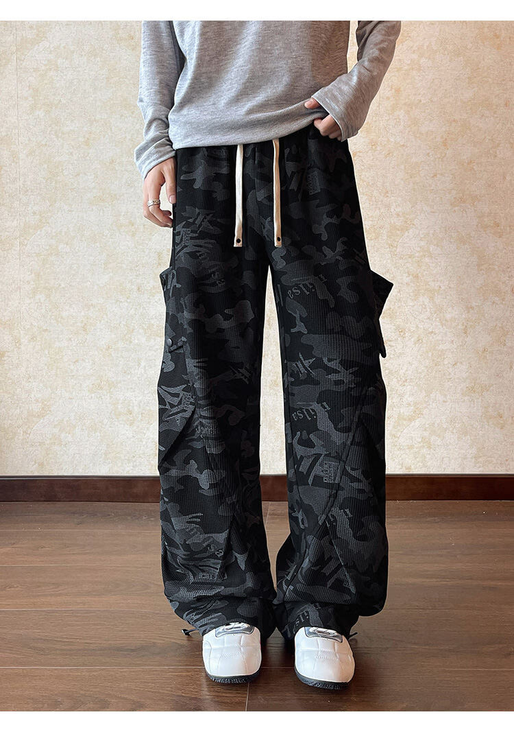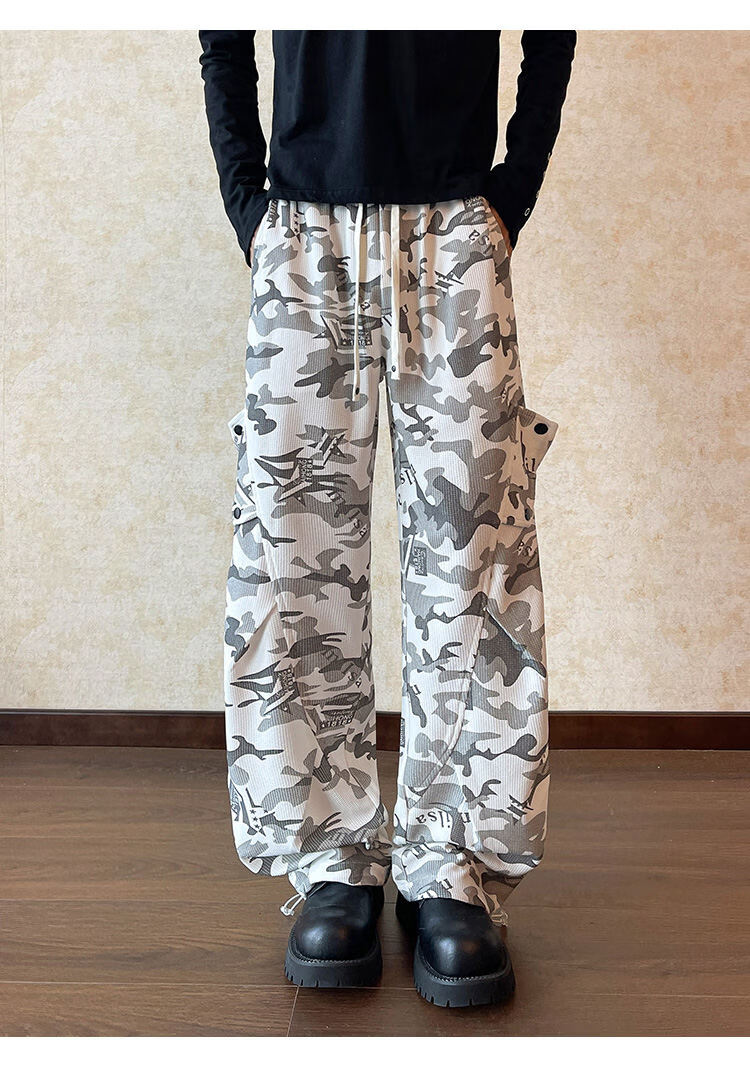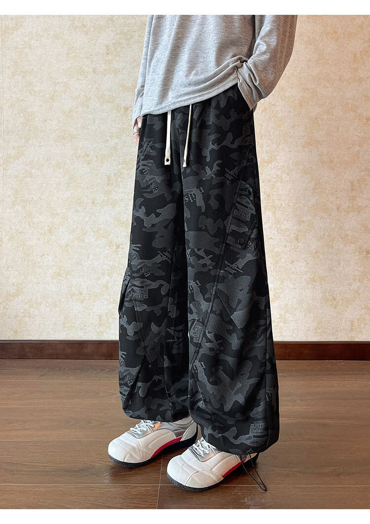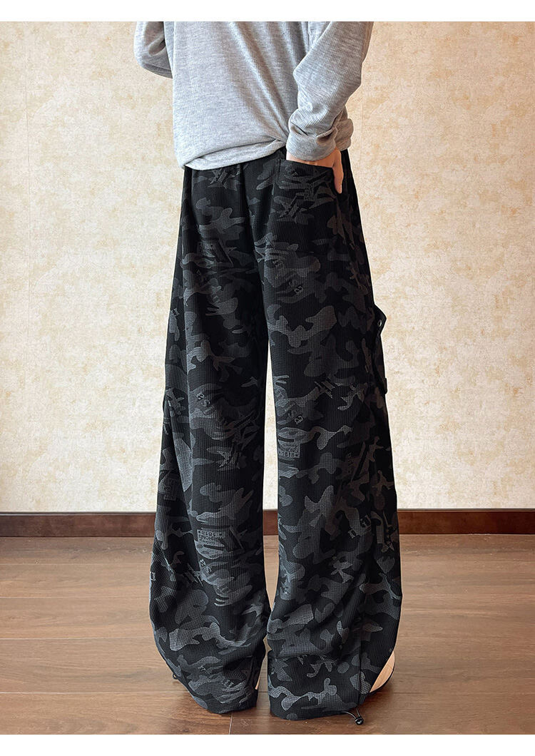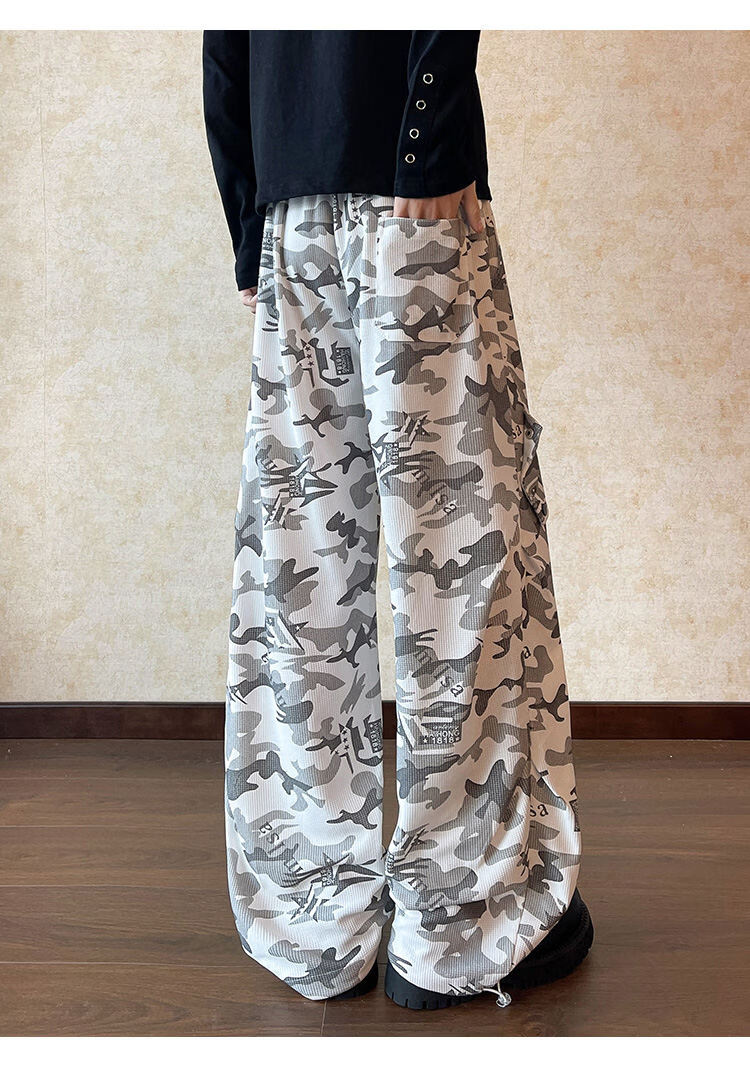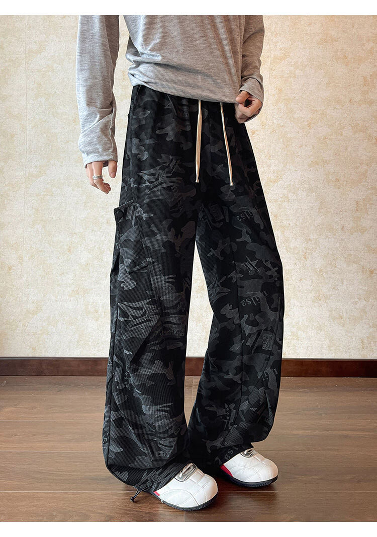 Playboy (PLAYBOY) American high street pleated casual pants for men in spring, plus size, trendy fat people, loose drawstring straight wide leg camouflage pants, gray M