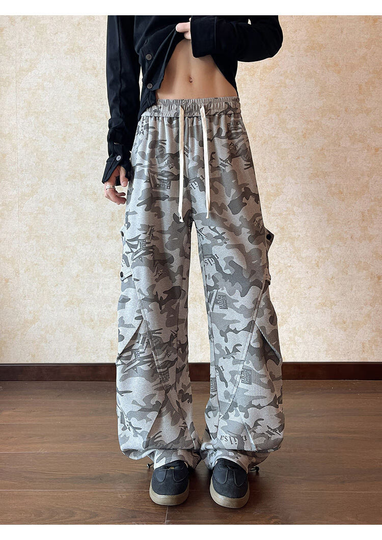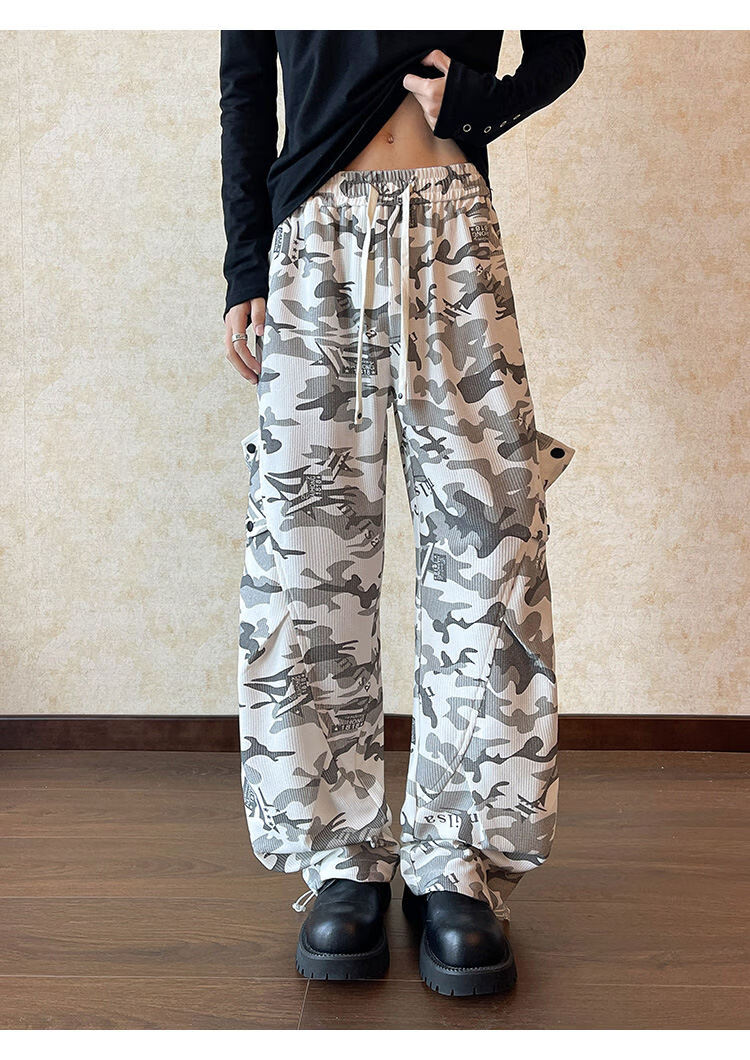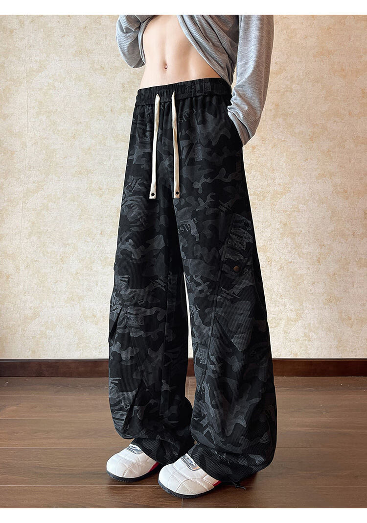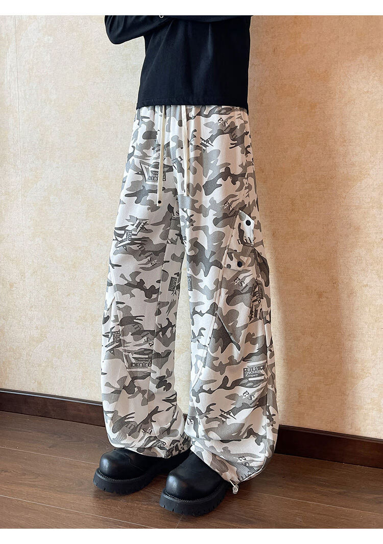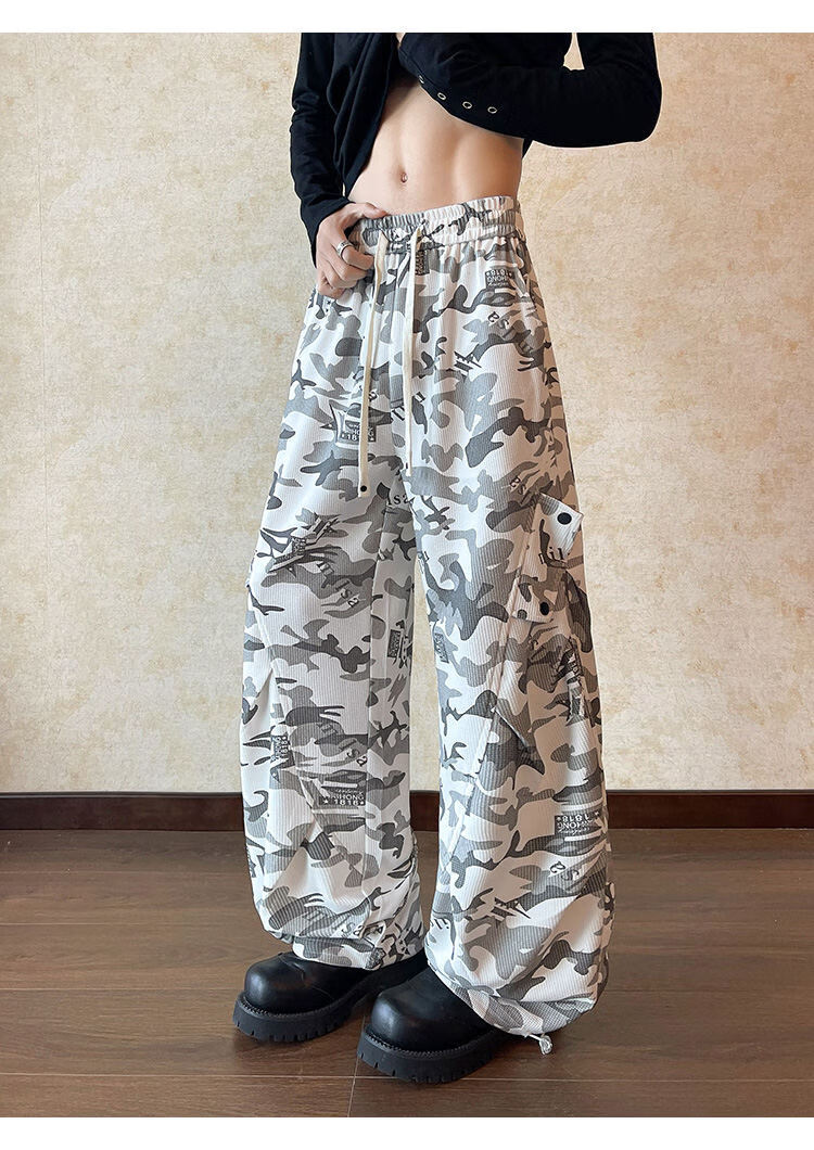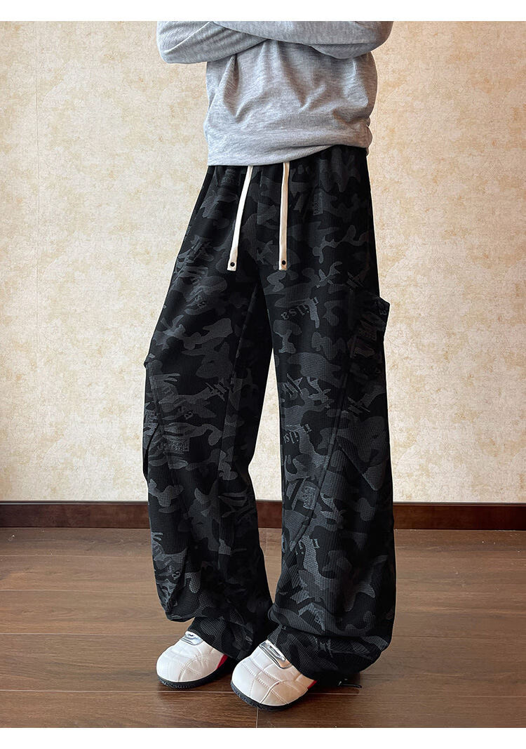 Playboy (PLAYBOY) American high street pleated casual pants for men in spring, plus size, trendy fat people, loose drawstring straight wide leg camouflage pants, gray M