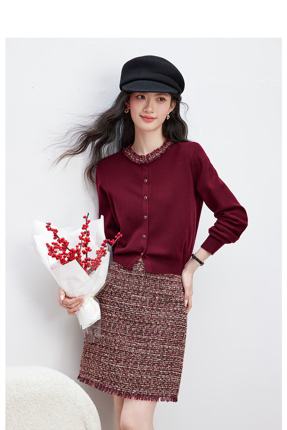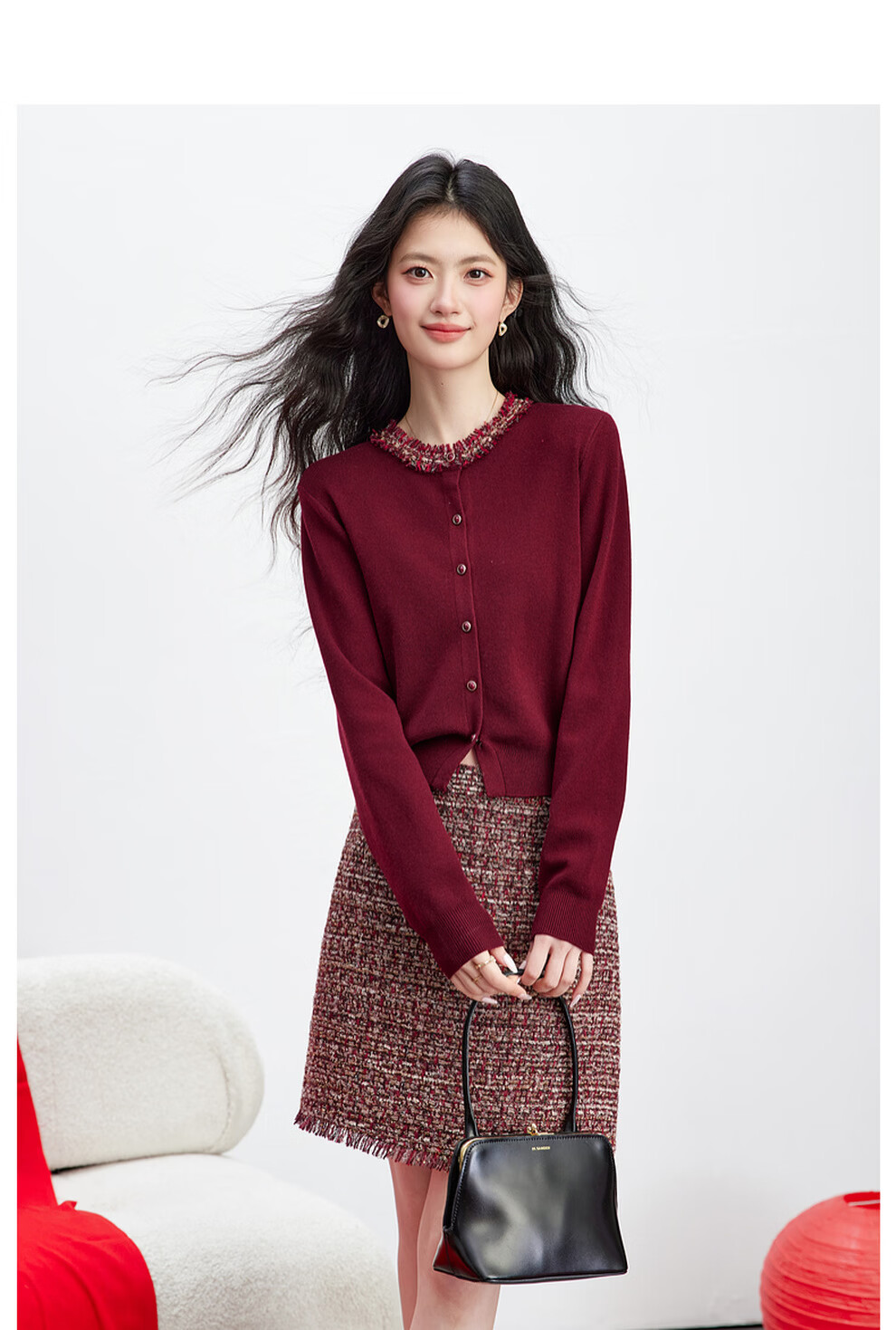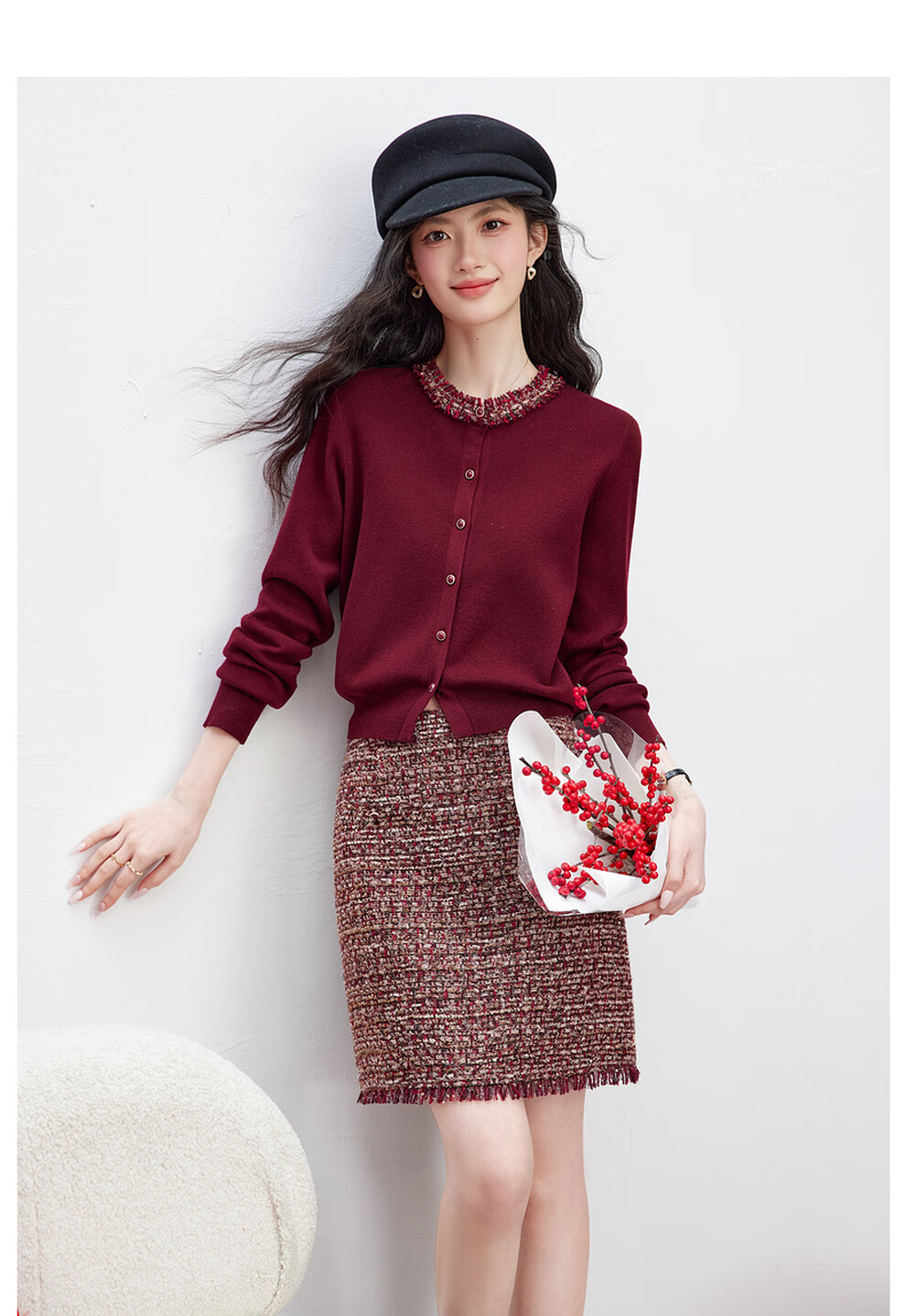 Fanximan New Year Red Sweater Suit Skirt Women's 26 Spring New Round Neck Sweater Skirt Two-piece Set A5017 Bordeaux Red M (Recommended 100-110 Jin Jin equals 0.5 kg)