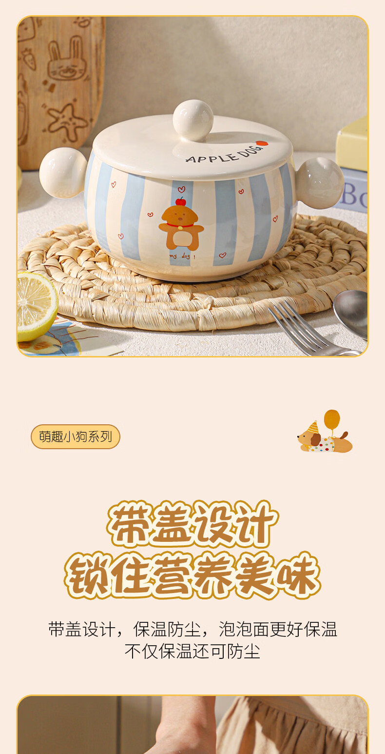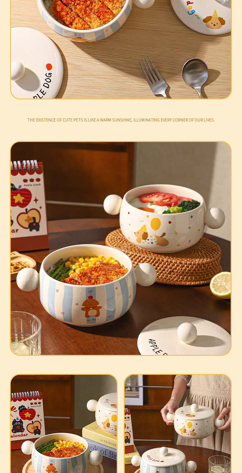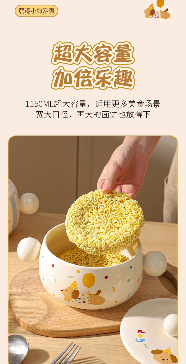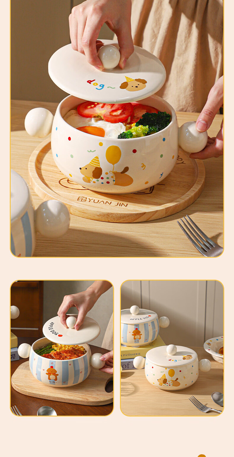 Sheli's cute ceramic round beads double-eared instant noodle bowl with lid, insulated and anti-scalding, special bowl for students, cafeteria rice bowl, balloon dog 1150ml