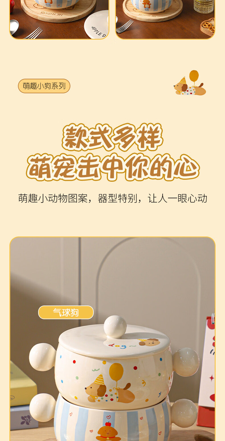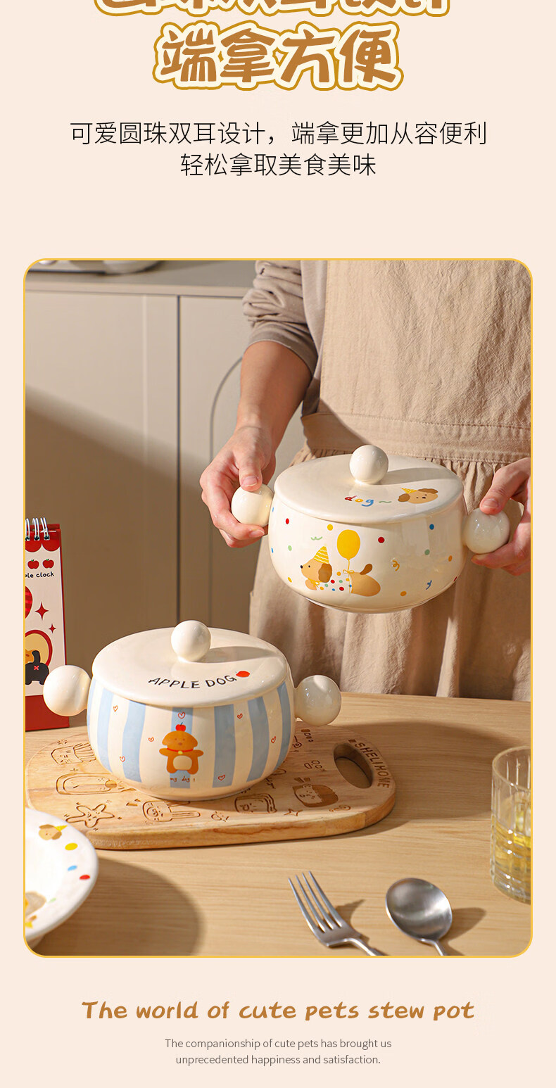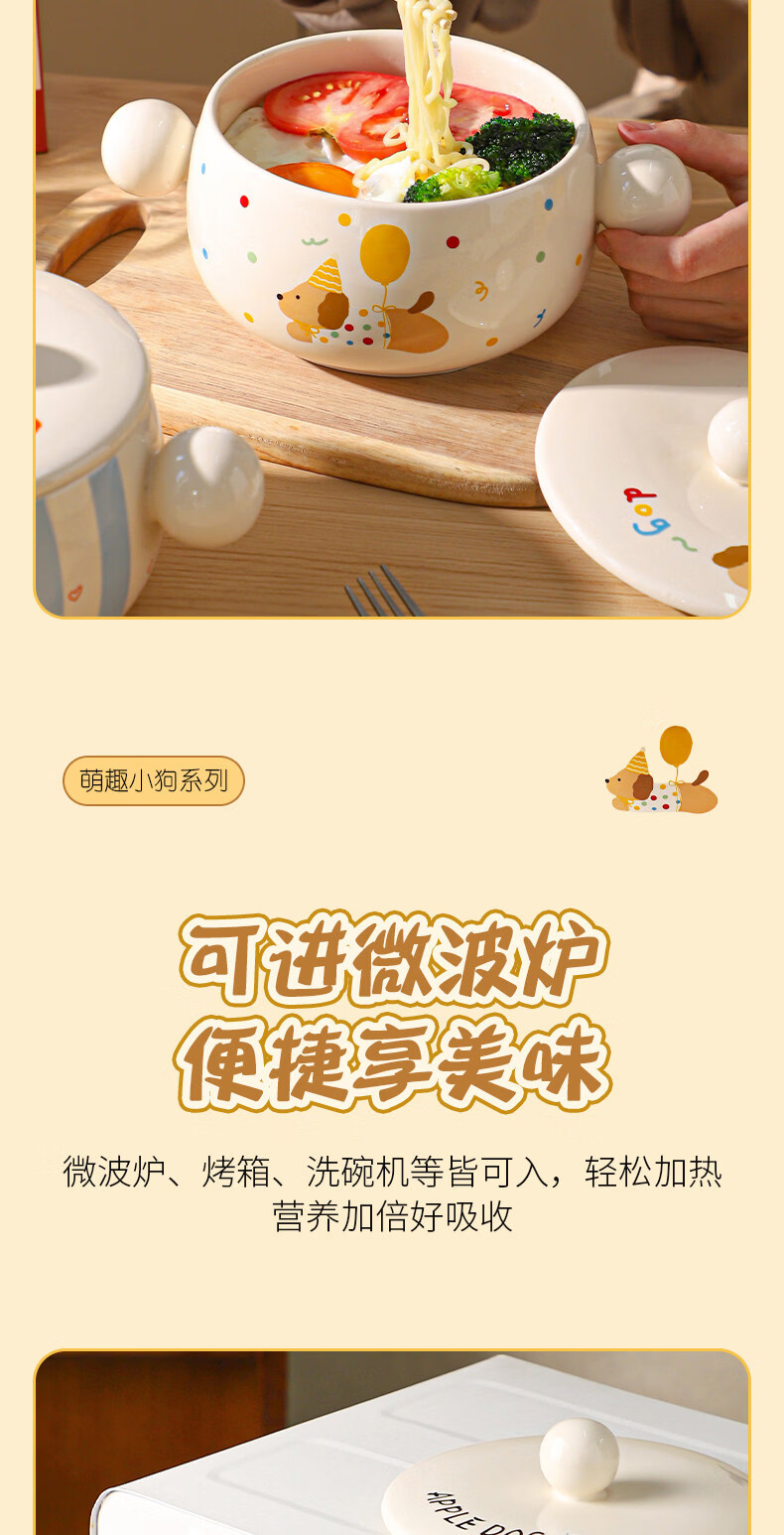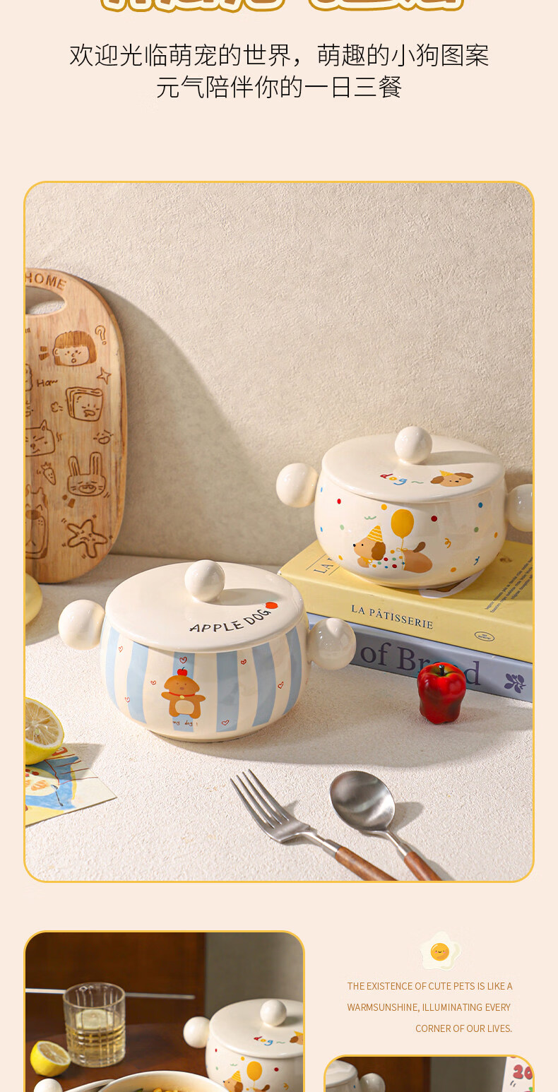 Sheli's cute ceramic round beads double-eared instant noodle bowl with lid, insulated and anti-scalding, special bowl for students, cafeteria rice bowl, balloon dog 1150ml