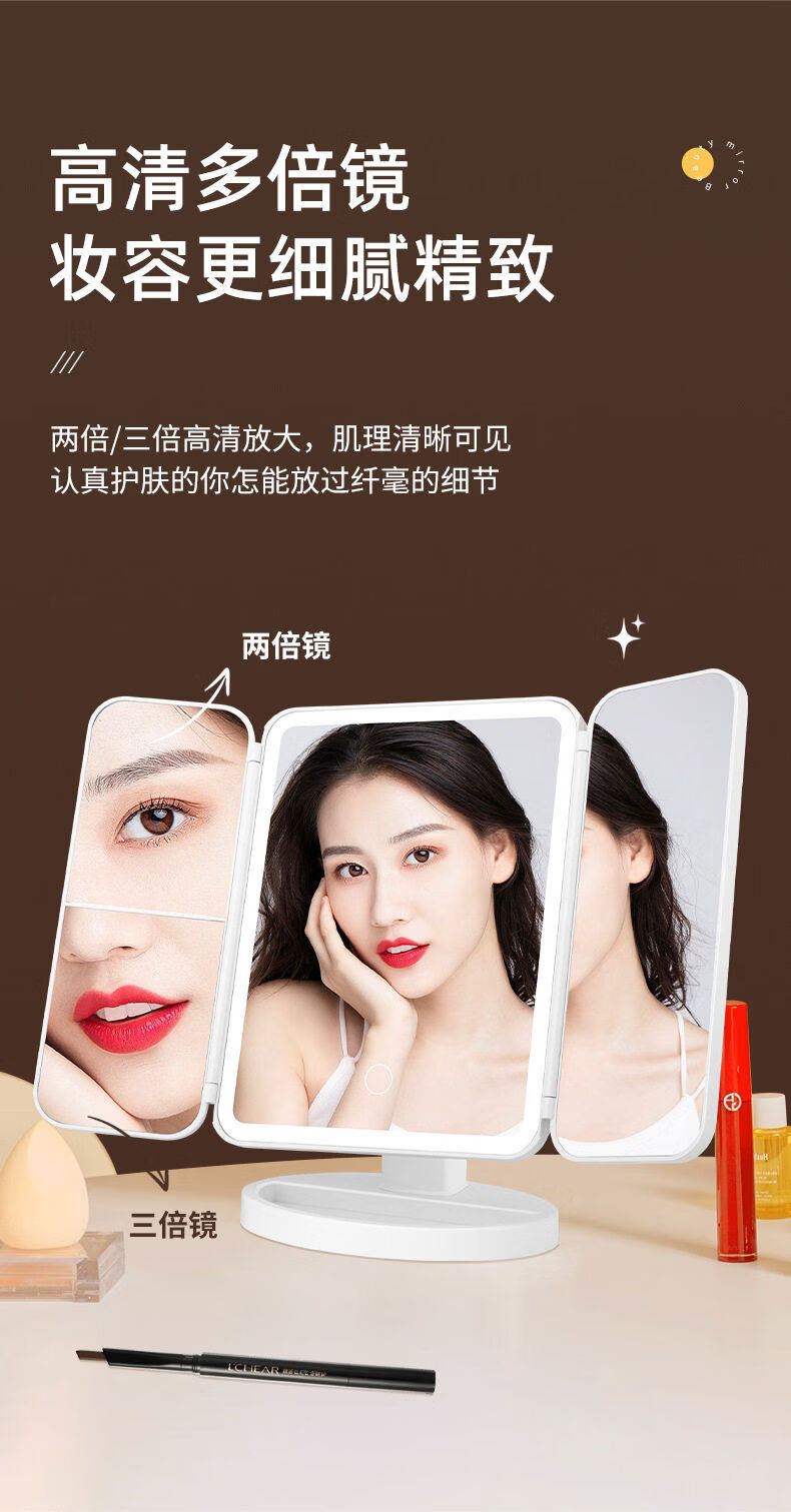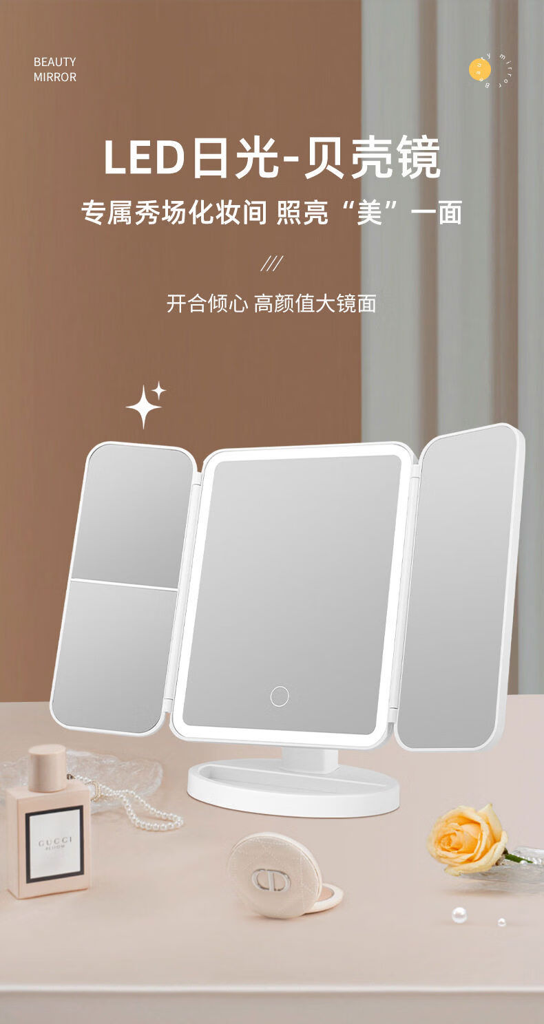 Mirror makeup mirror LED fill light makeup mirror dormitory desktop makeup mirror three-sided folding mirror magnifying makeup mirror three-fold shell mirror 17 points 5*24CM