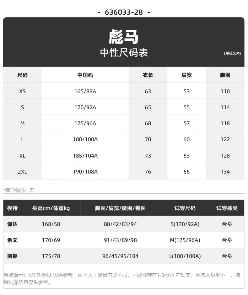 China (cm) 165 / 88-90 170 / 96-98 175 / 108-110 180 / 118-122 185 / 126-130
