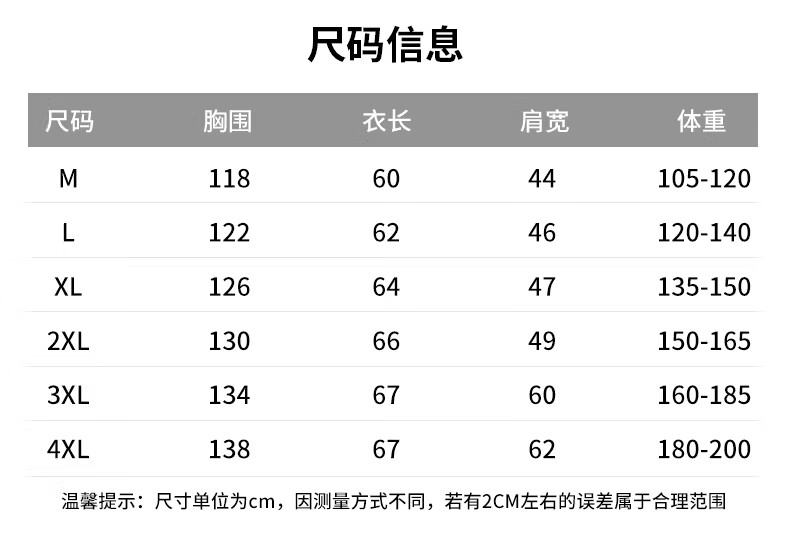 China (cm) 165 / 88-90 170 / 96-98 175 / 108-110 180 / 118-122 185 / 126-130