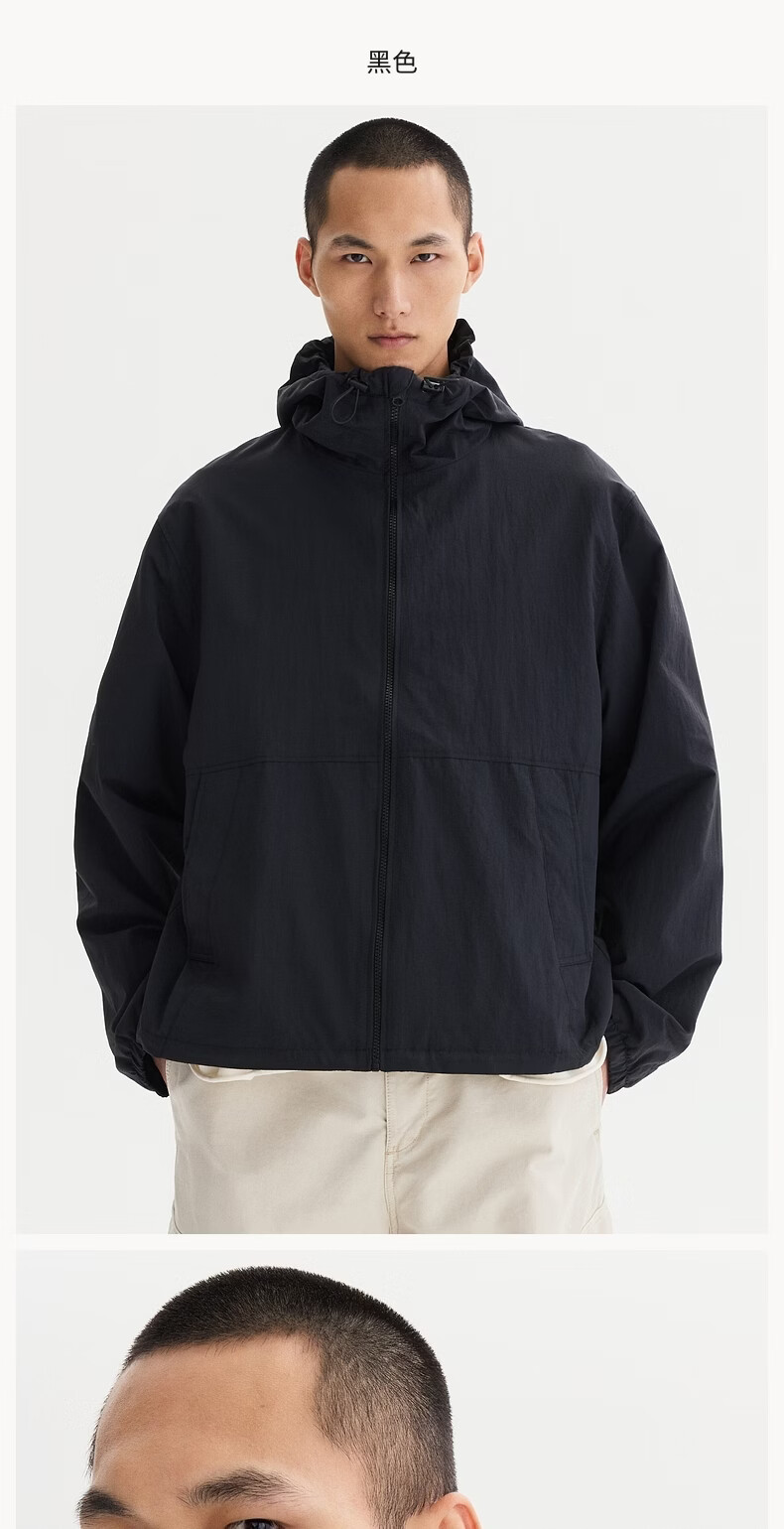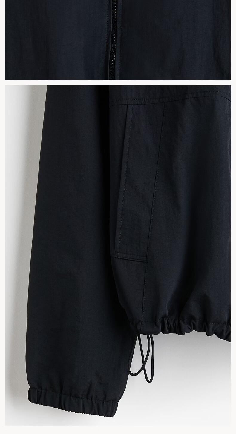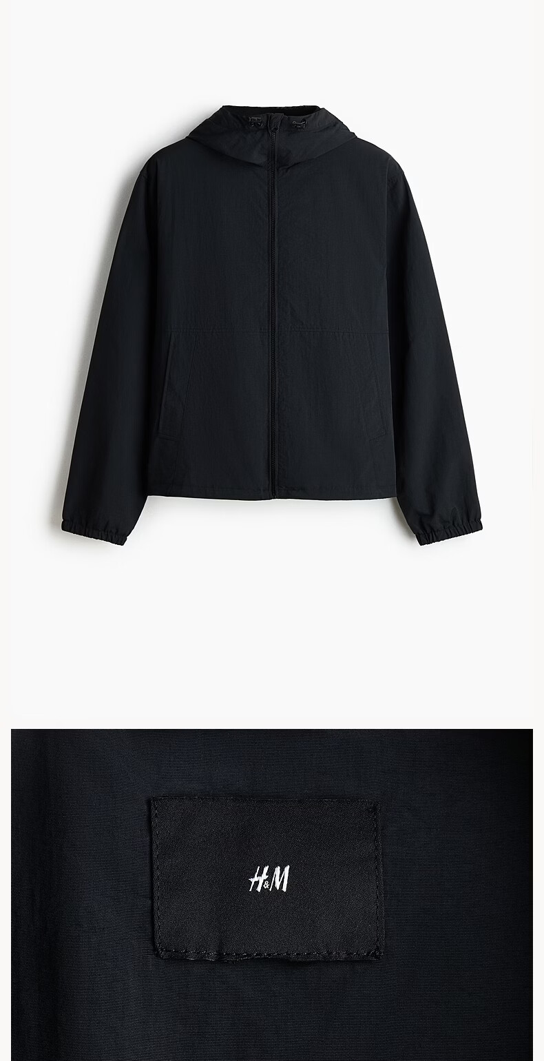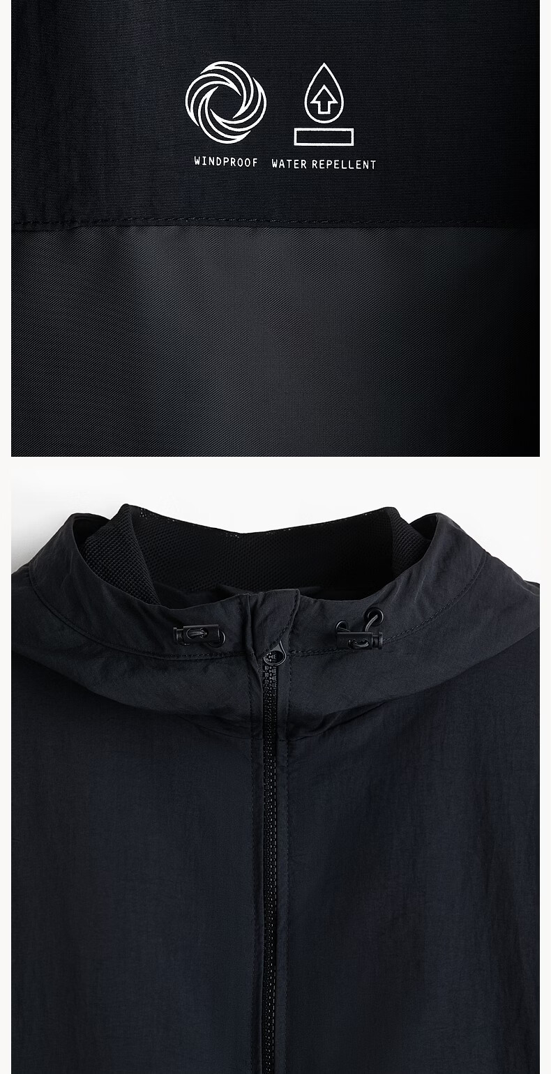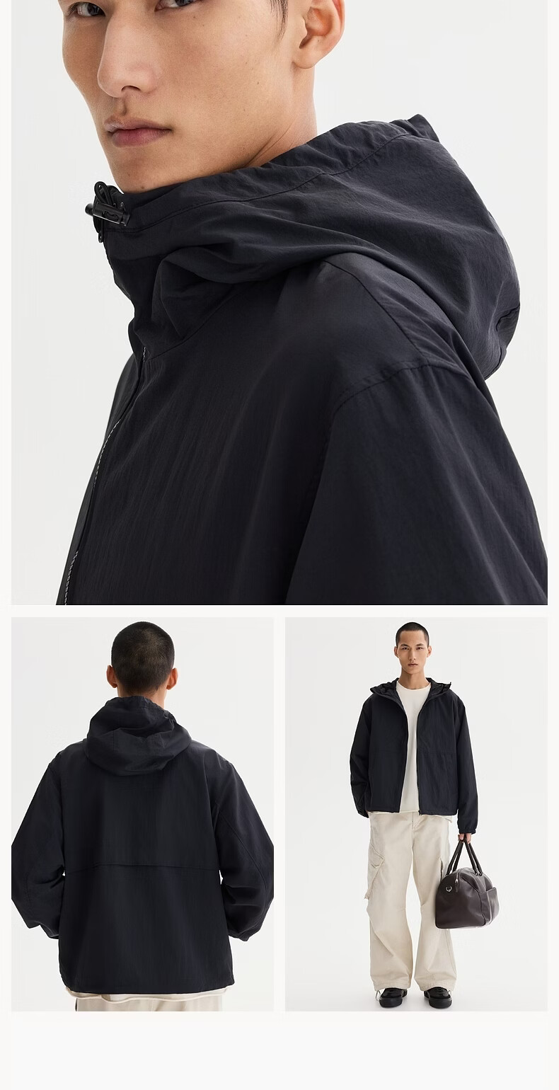 H&M Men's Jacket Summer New Lightweight Windproof Hooded Hydrophobic Nylon Windproof Hooded Jacket 1318393 Black M 175/100