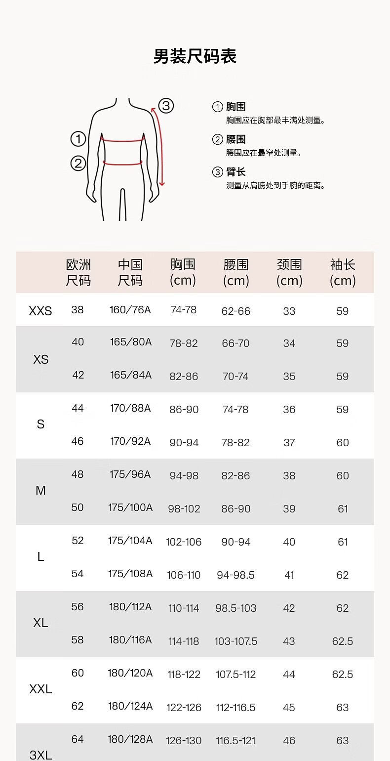 China (cm) 160-165/84-86 165-170 / 88-90 167-172 / 92-96 168-173 / 98-102 170-176 / 106-110