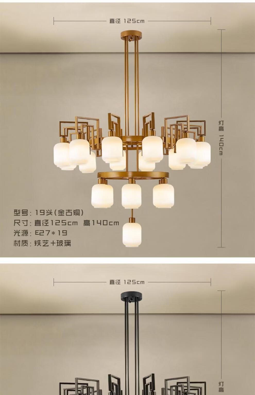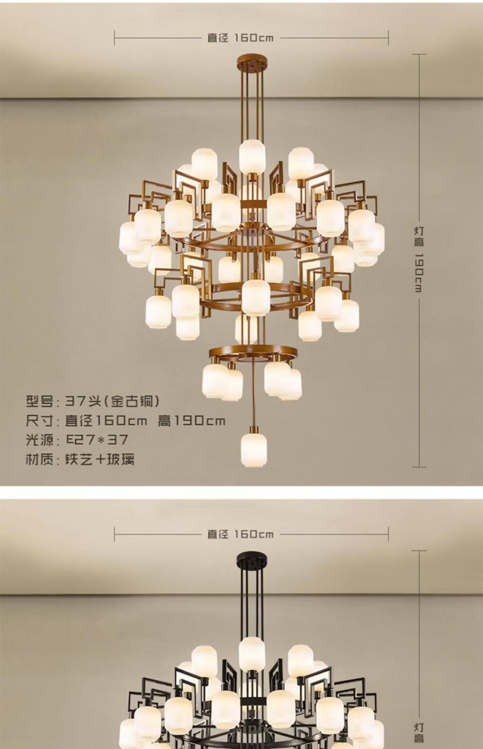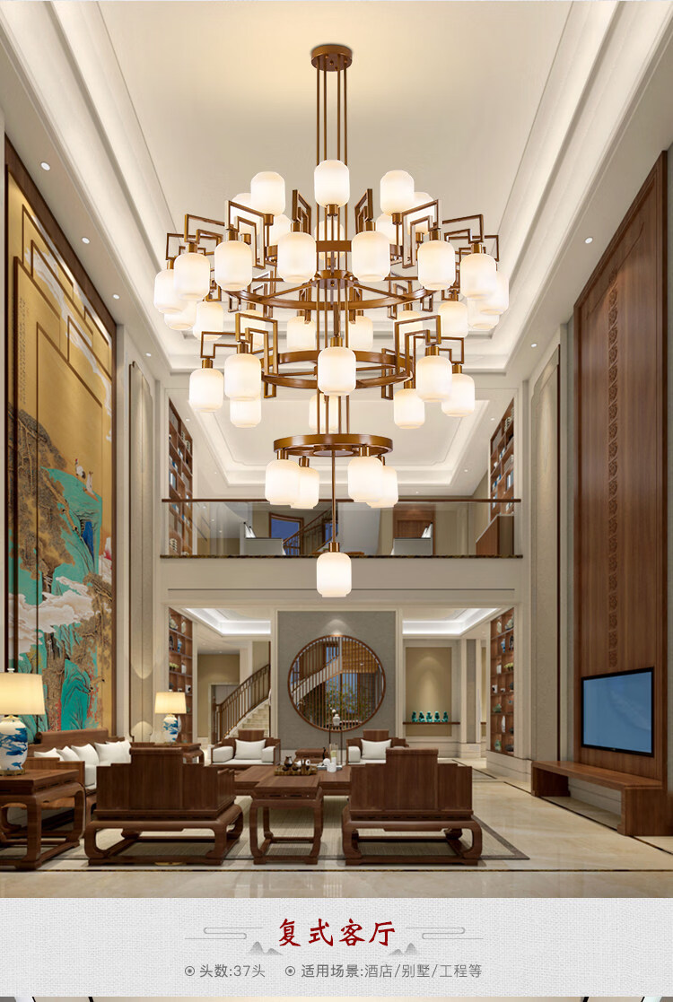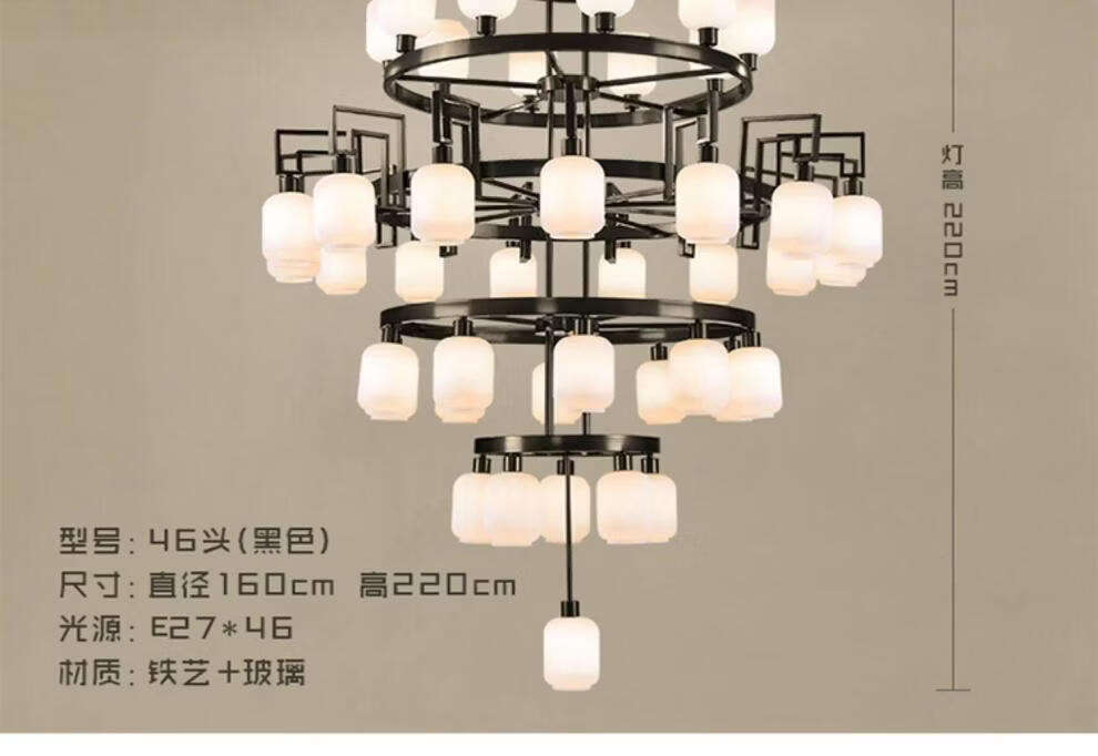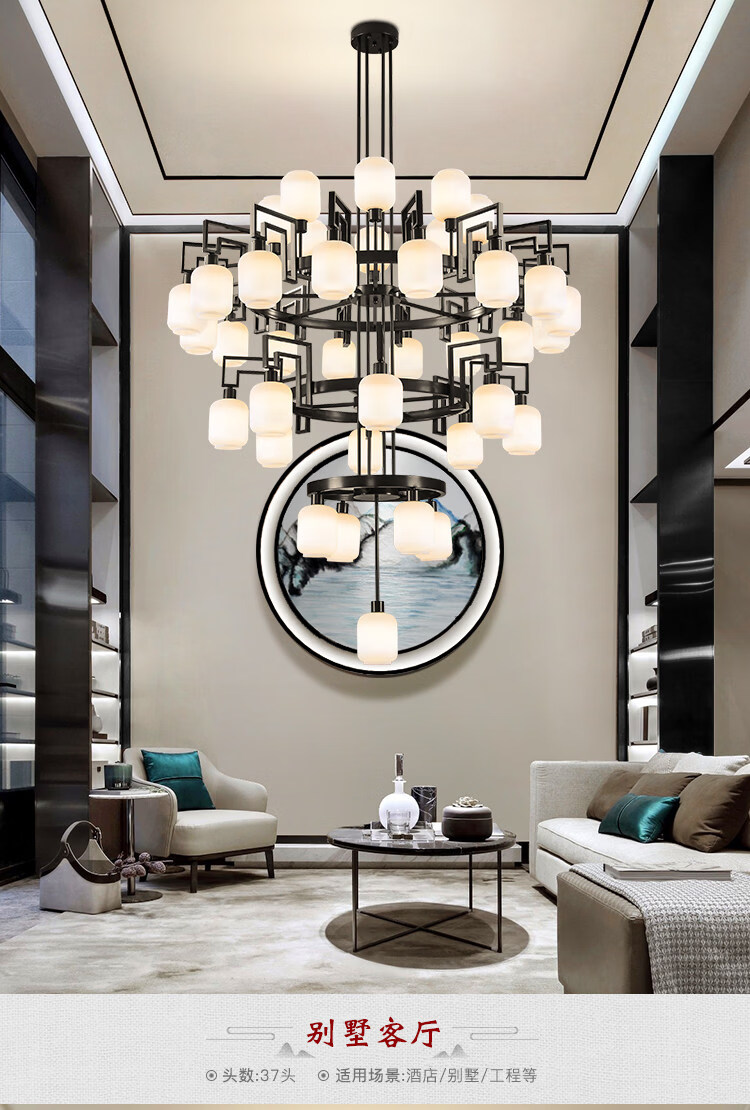 OPPLE New Chinese style large chandelier living room high ceiling hotel box engineering lamp covered building multi-story villa Chinese style lamps black glass lampshade 19 heads (three layers) with three-color light source