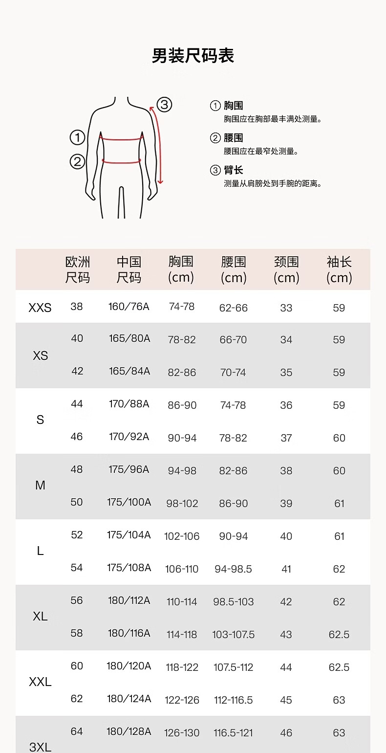 China (cm) 160-165/84-86 165-170 / 88-90 167-172 / 92-96 168-173 / 98-102 170-176 / 106-110