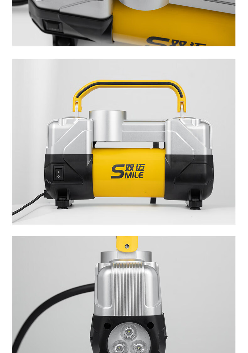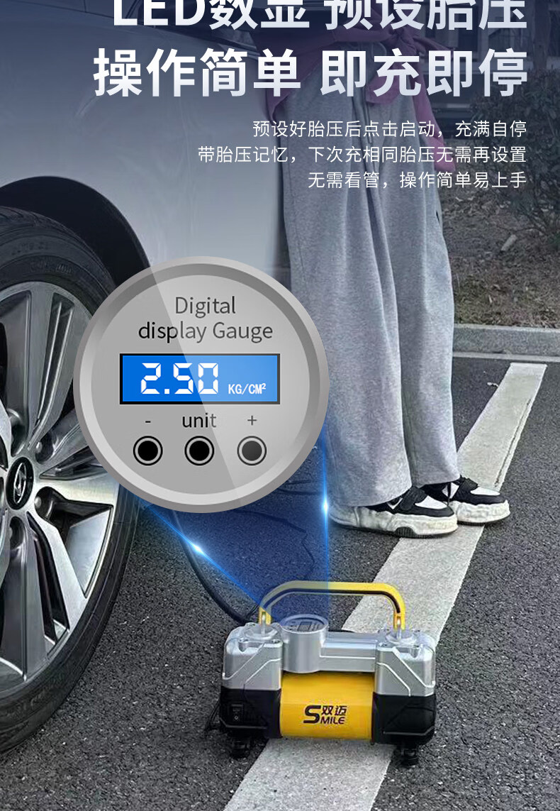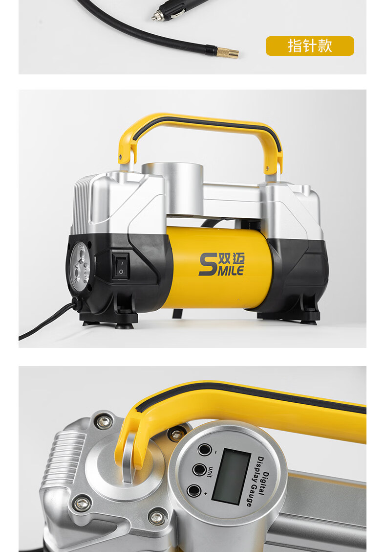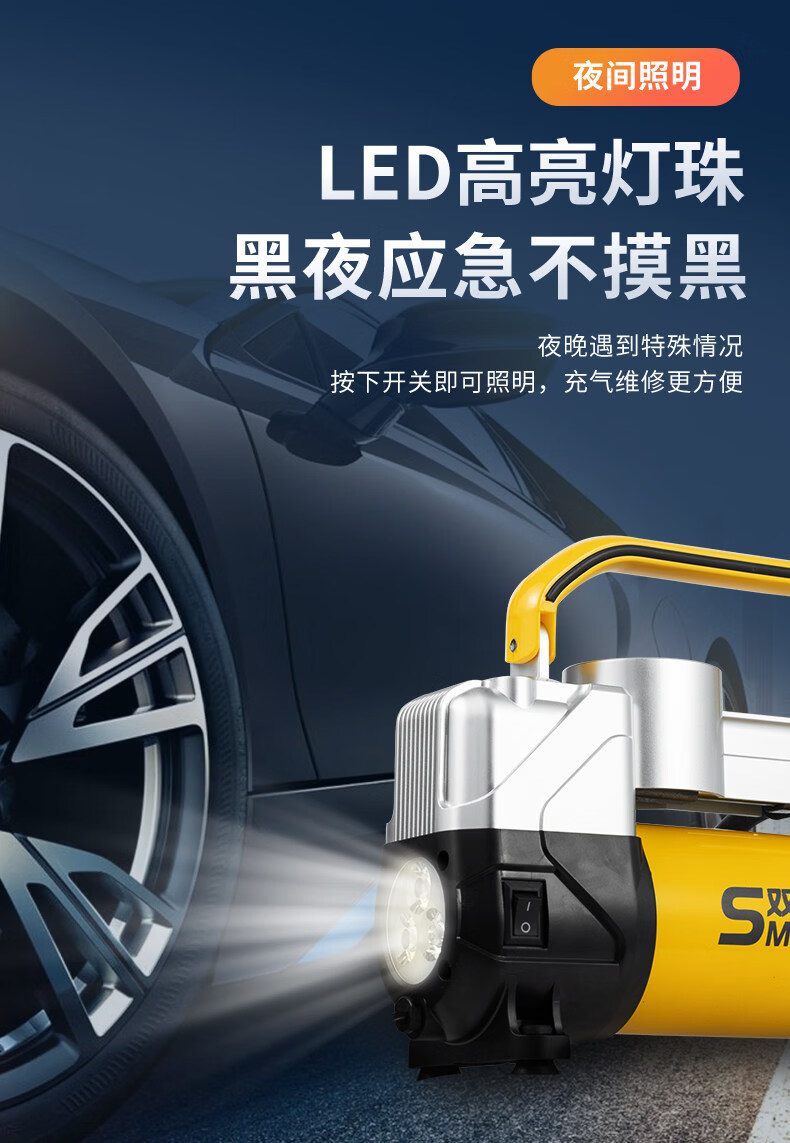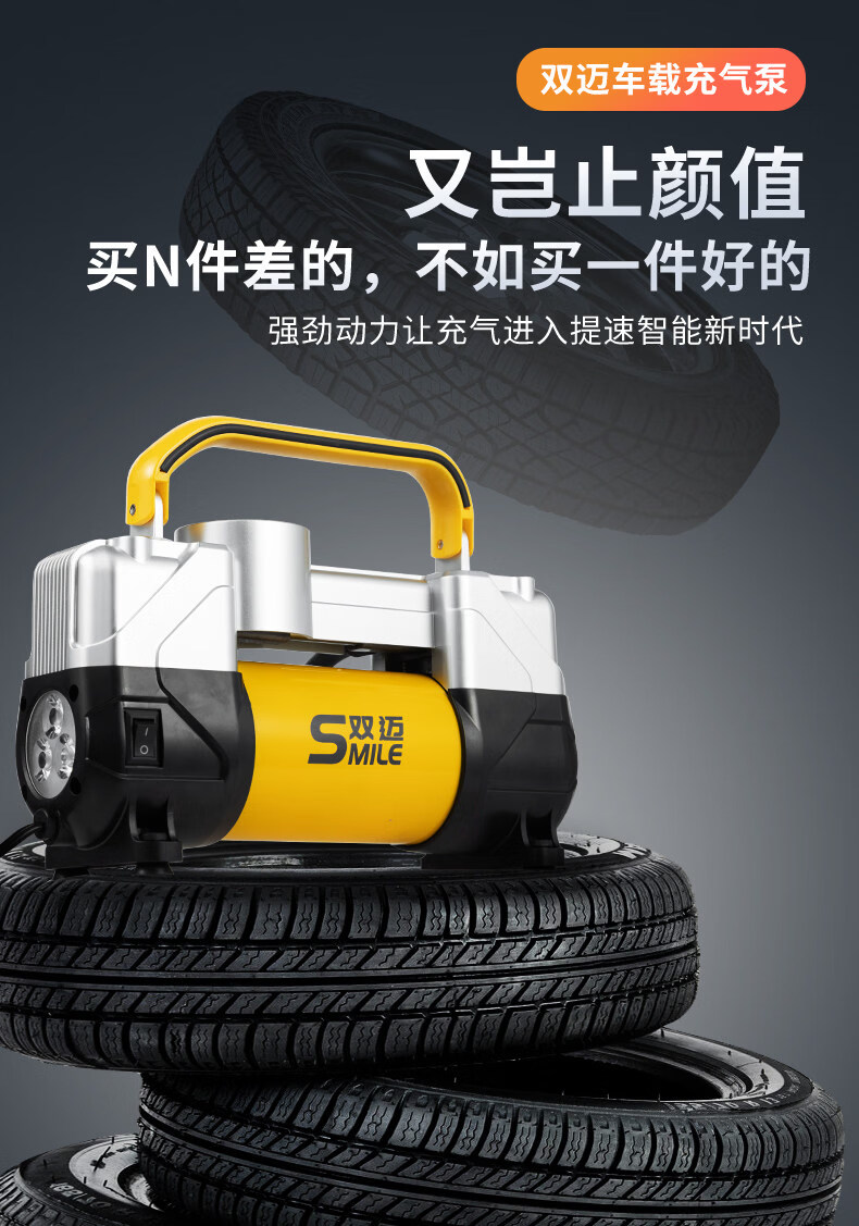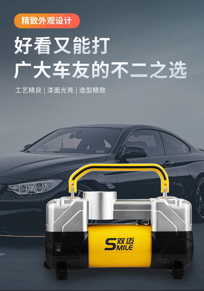 Gongma Shuangmai car air pump portable car tire double cylinder high pressure high power electric car air pump 12V yellow 70 piece motor youth version double cylinder pointer model manual stop + base