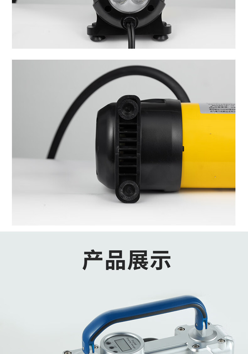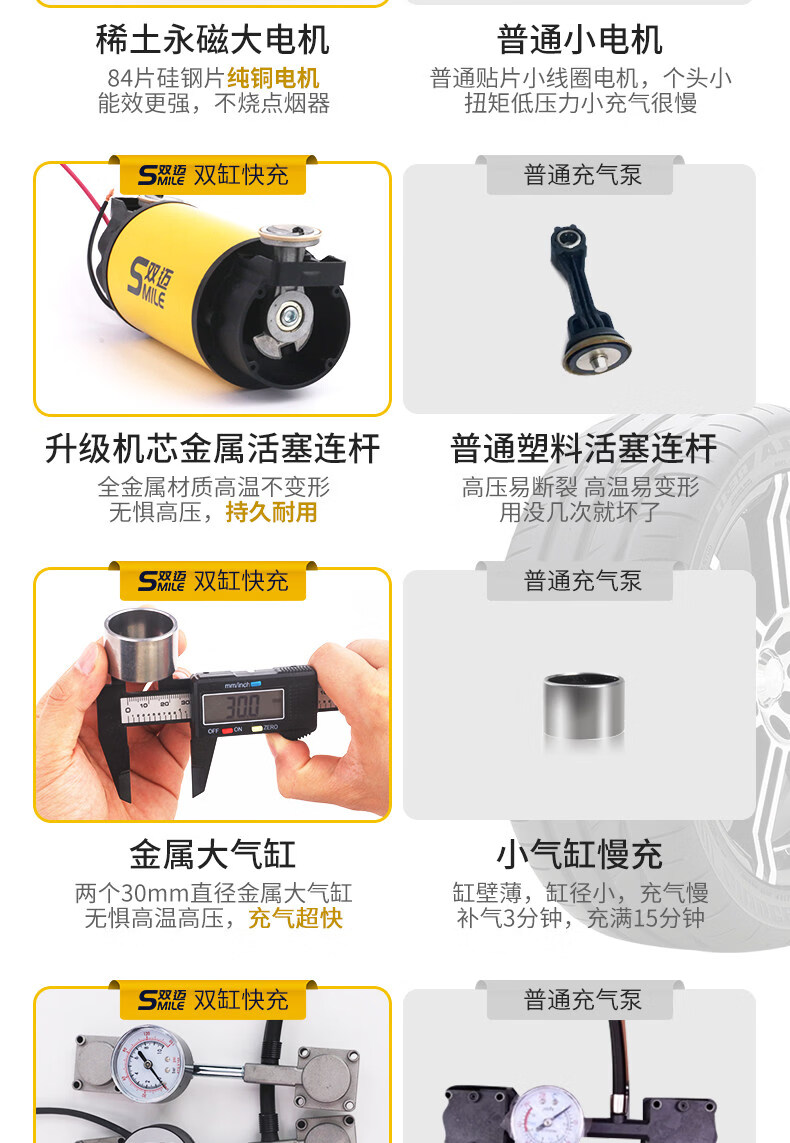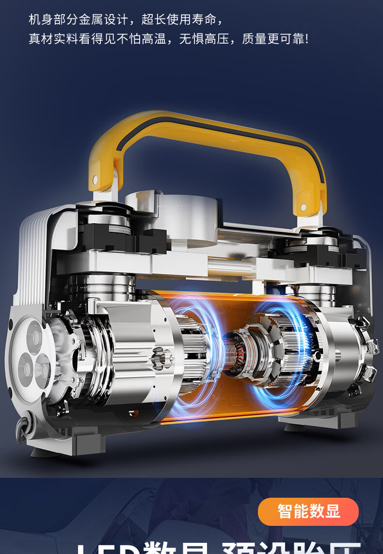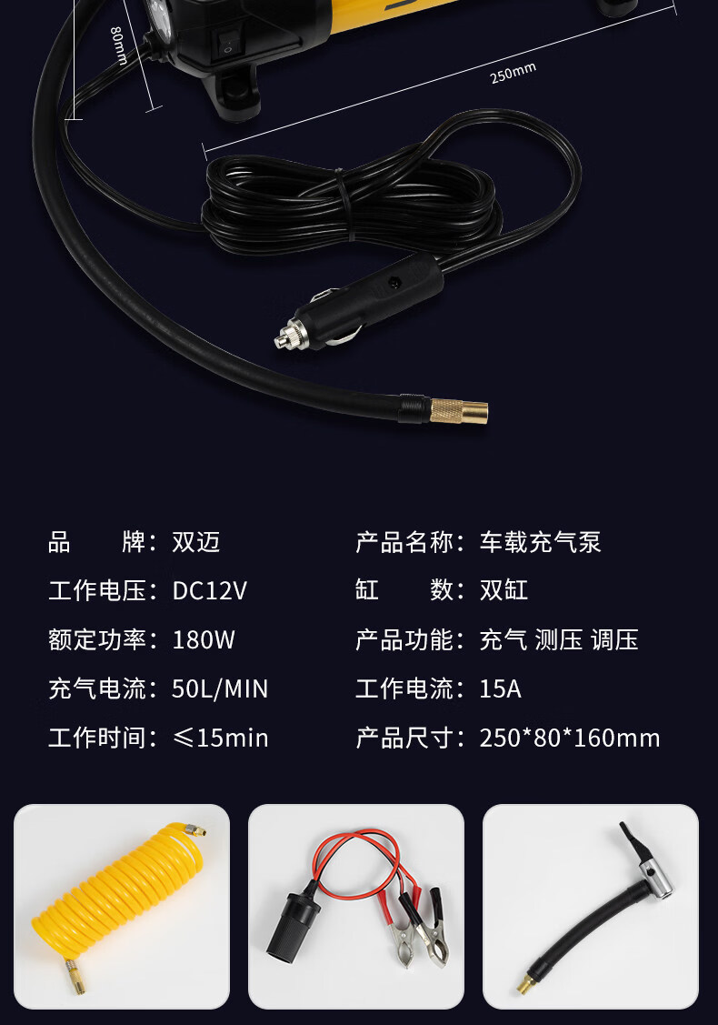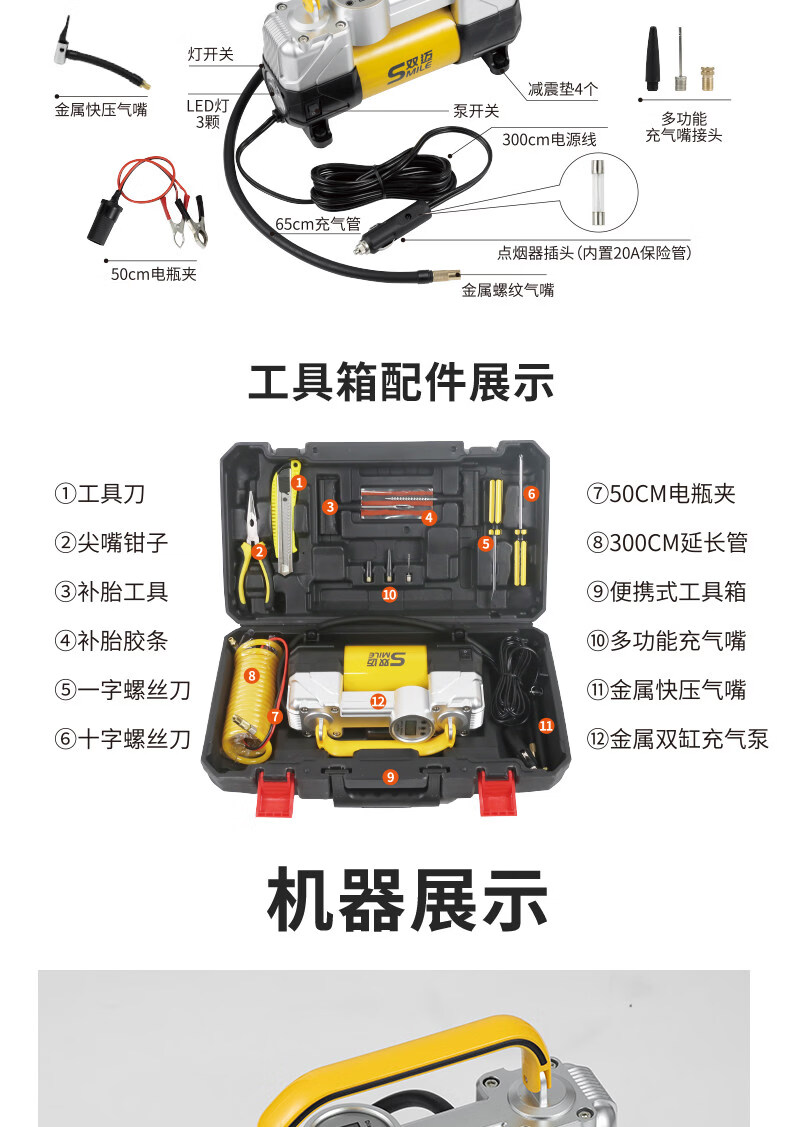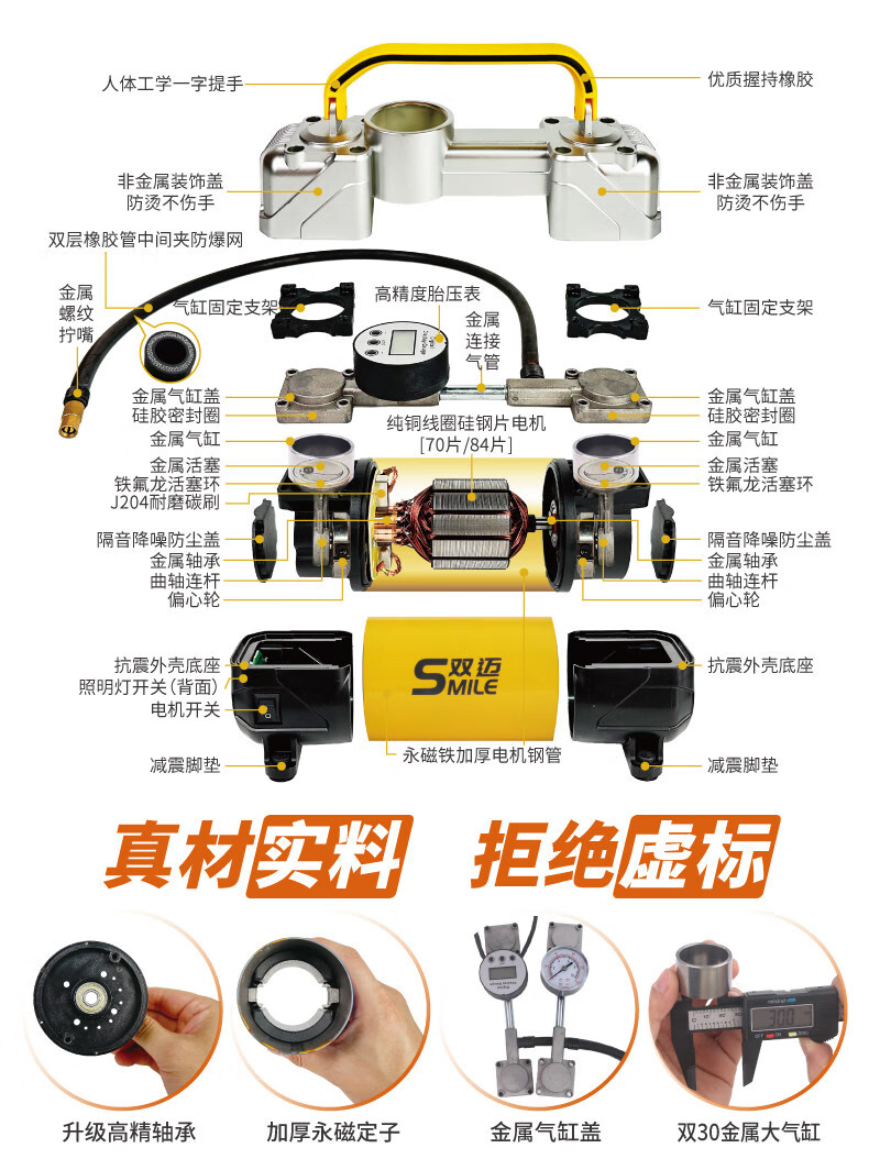 Gongma Shuangmai car air pump portable car tire double cylinder high pressure high power electric car air pump 12V yellow 70 piece motor youth version double cylinder pointer model manual stop + base