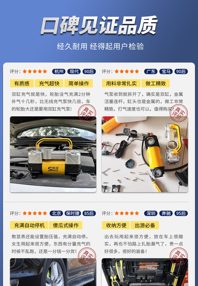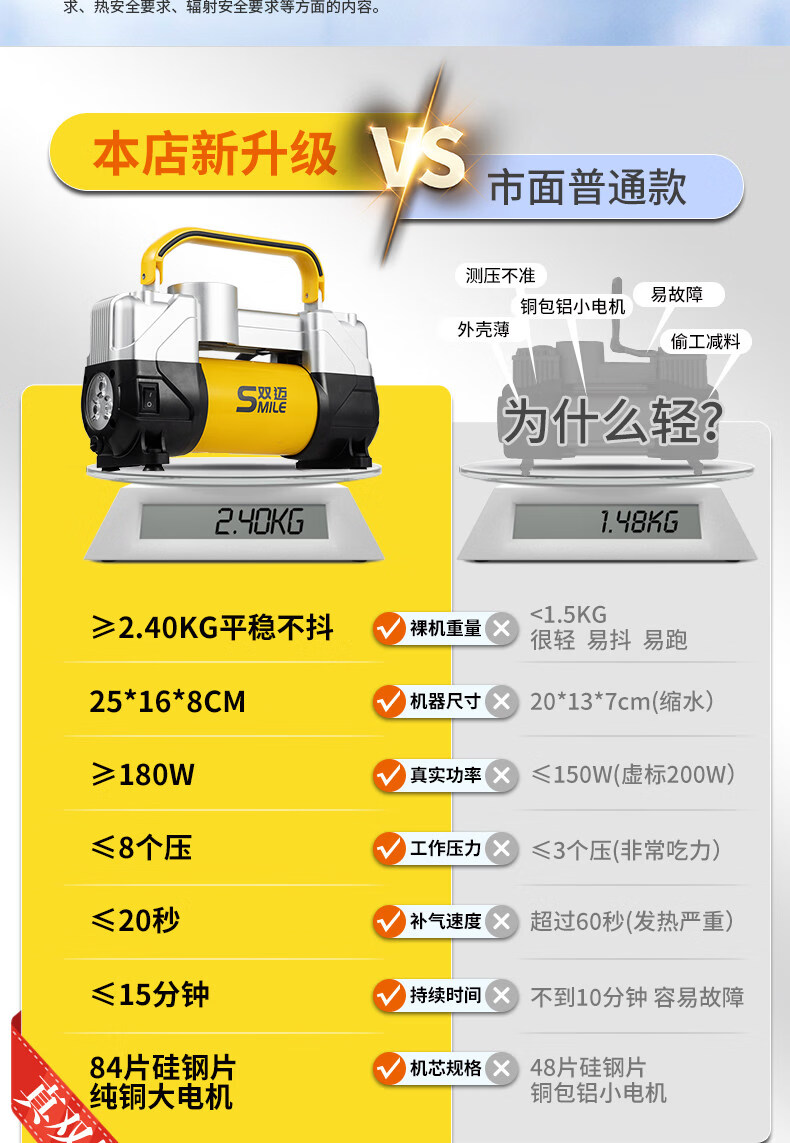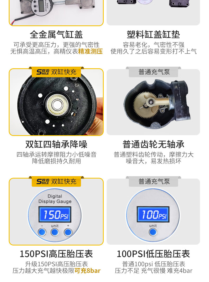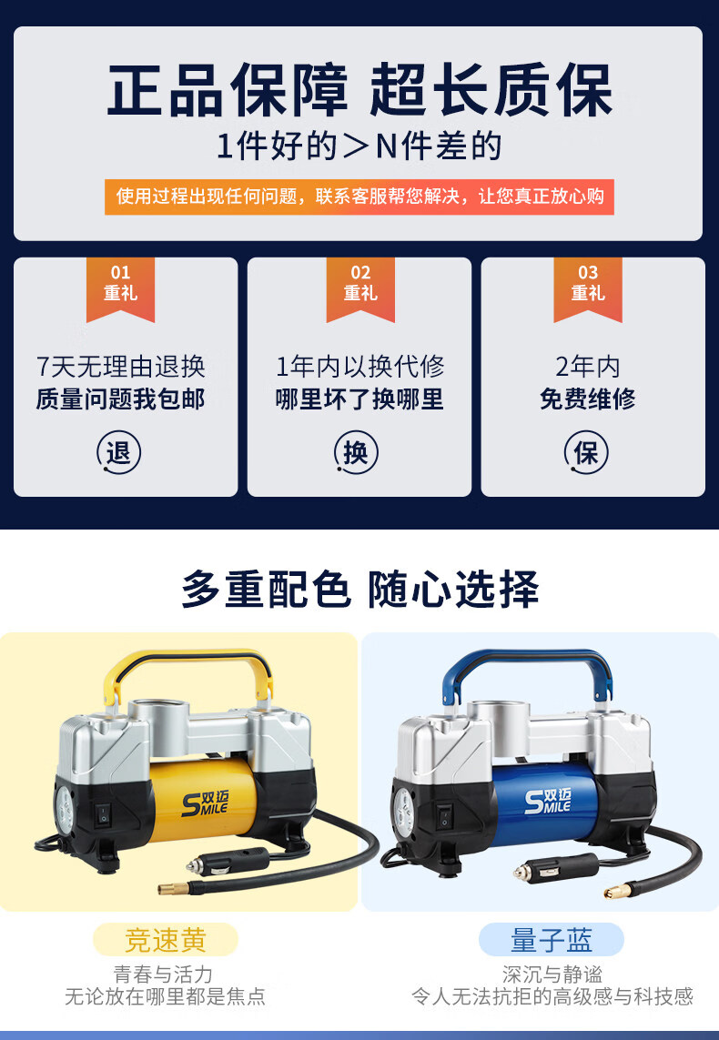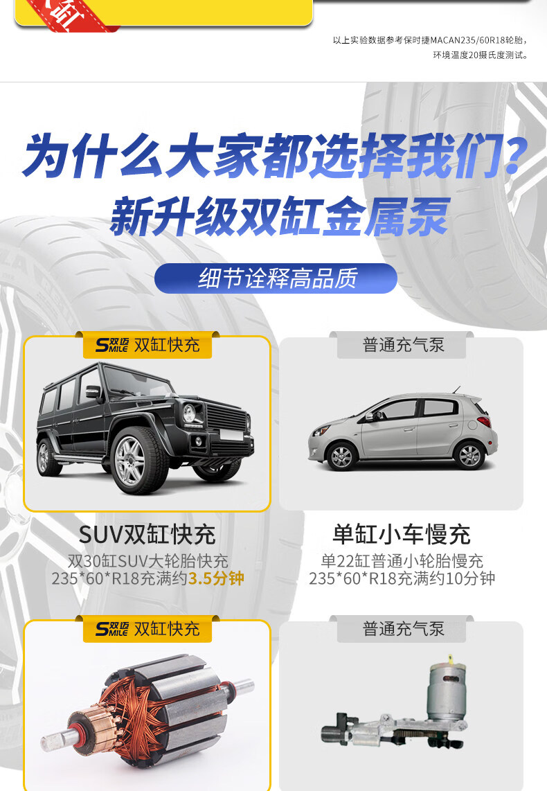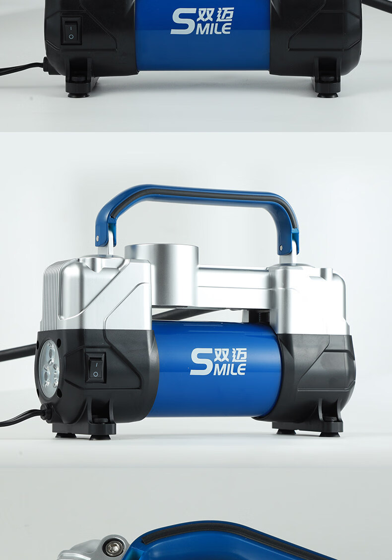 Gongma Shuangmai car air pump portable car tire double cylinder high pressure high power electric car air pump 12V yellow 70 piece motor youth version double cylinder pointer model manual stop + base